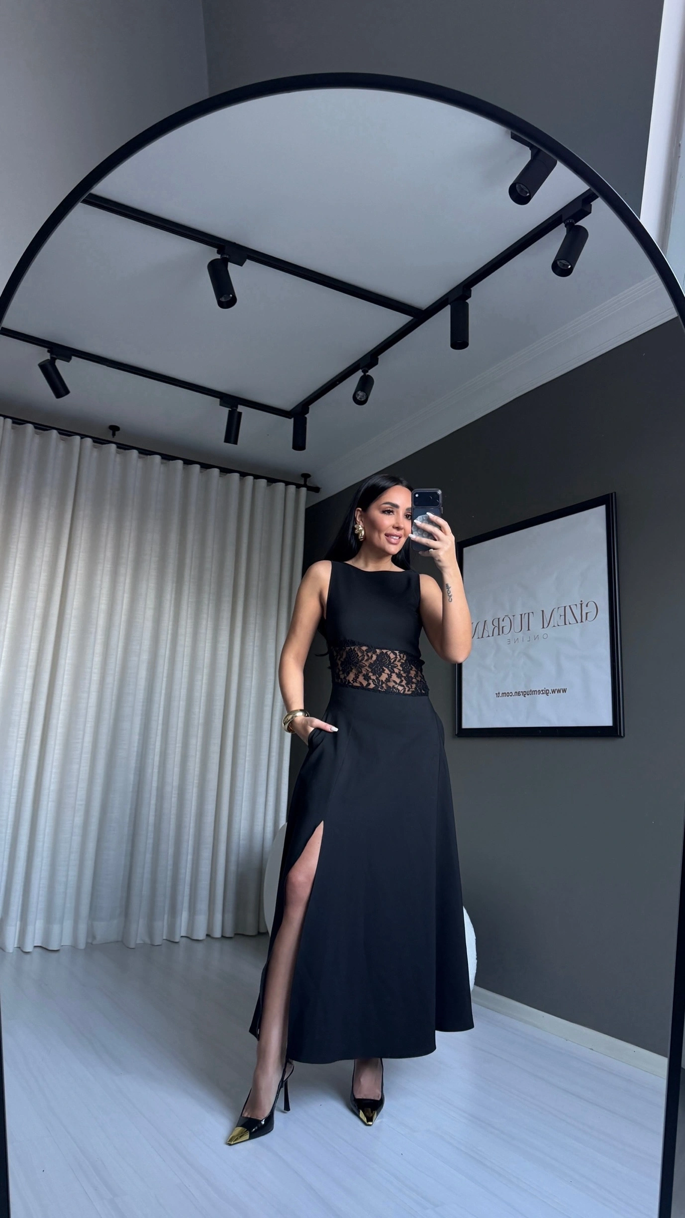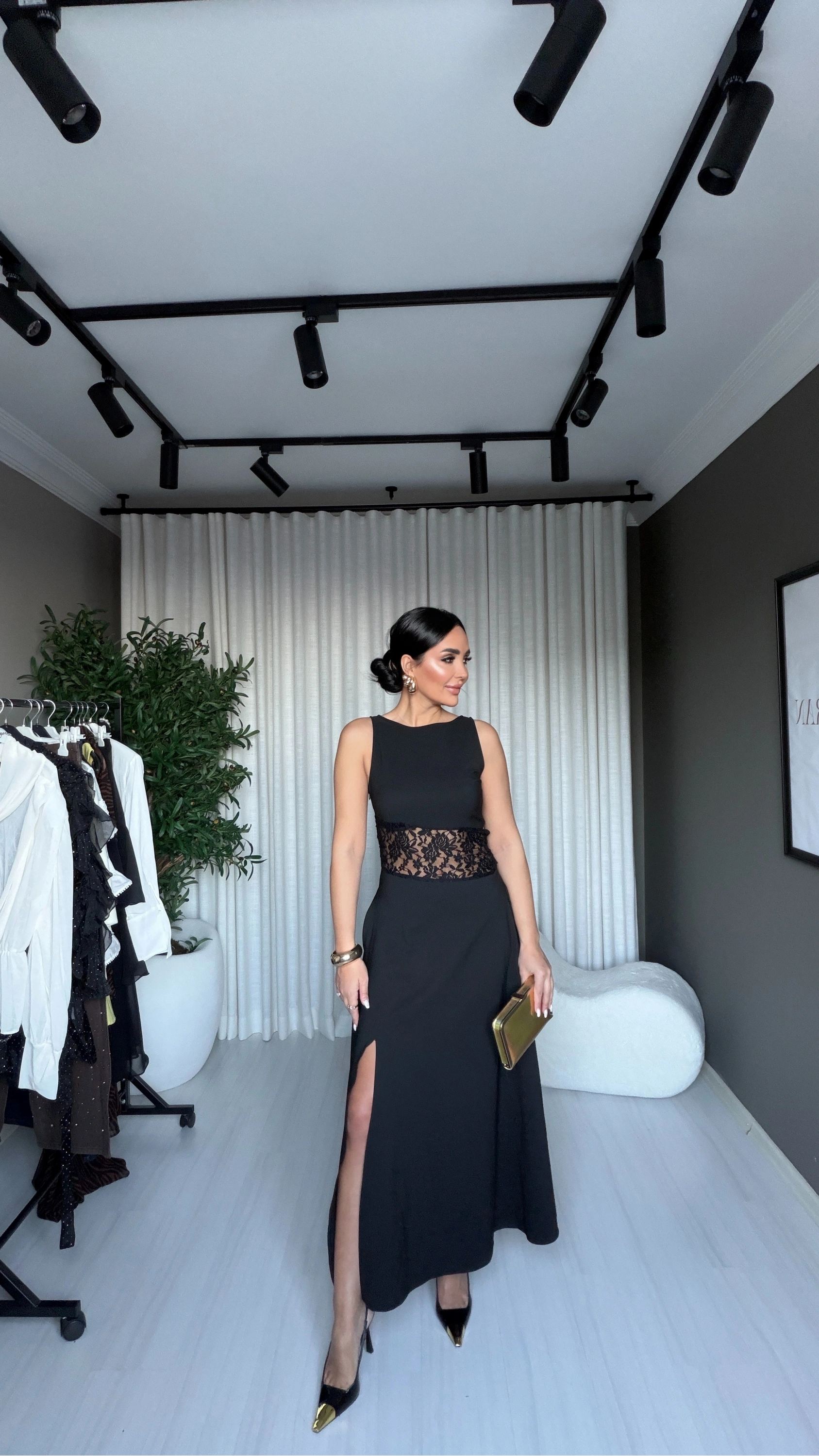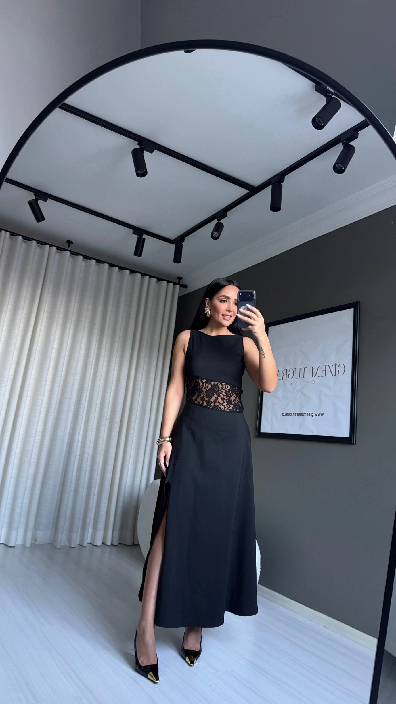 Şık, zarif ve dikkat çekici bir stil sunan <b>beli dantel detaylı yırtmaçlı siyah uzun elbise</b>, özel davetlerde, akşam yemeklerinde ve kutlamalarda stilinizi ön plana çıkaracak güçlü bir parçadır. Hem zarafeti hem de modern şıklığı bir arada sunar.