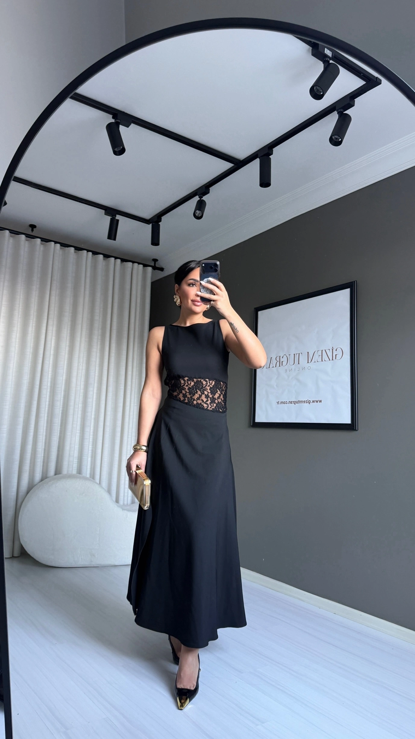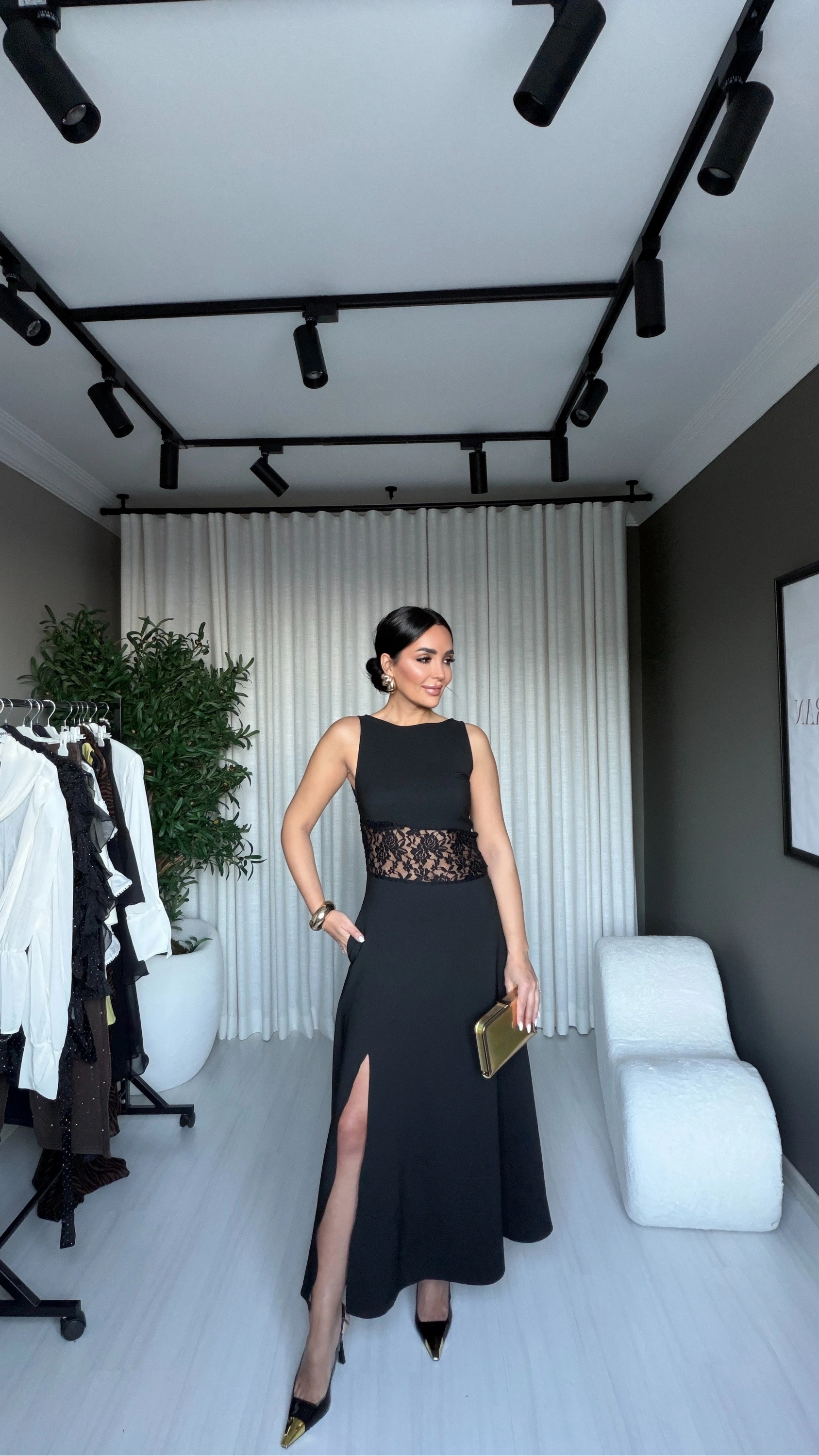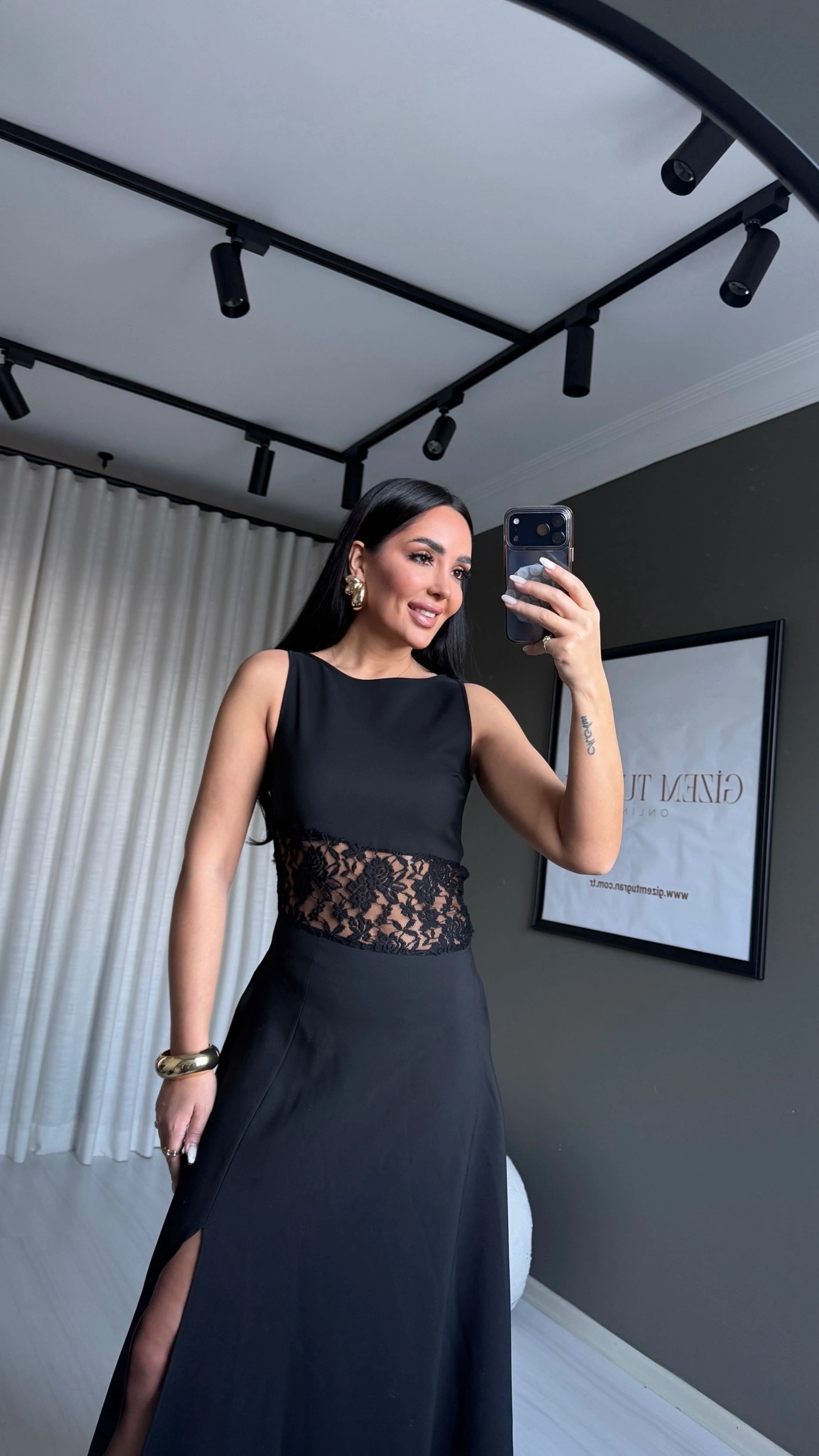 Şık, zarif ve dikkat çekici bir stil sunan <b>beli dantel detaylı yırtmaçlı siyah uzun elbise</b>, özel davetlerde, akşam yemeklerinde ve kutlamalarda stilinizi ön plana çıkaracak güçlü bir parçadır. Hem zarafeti hem de modern şıklığı bir arada sunar.