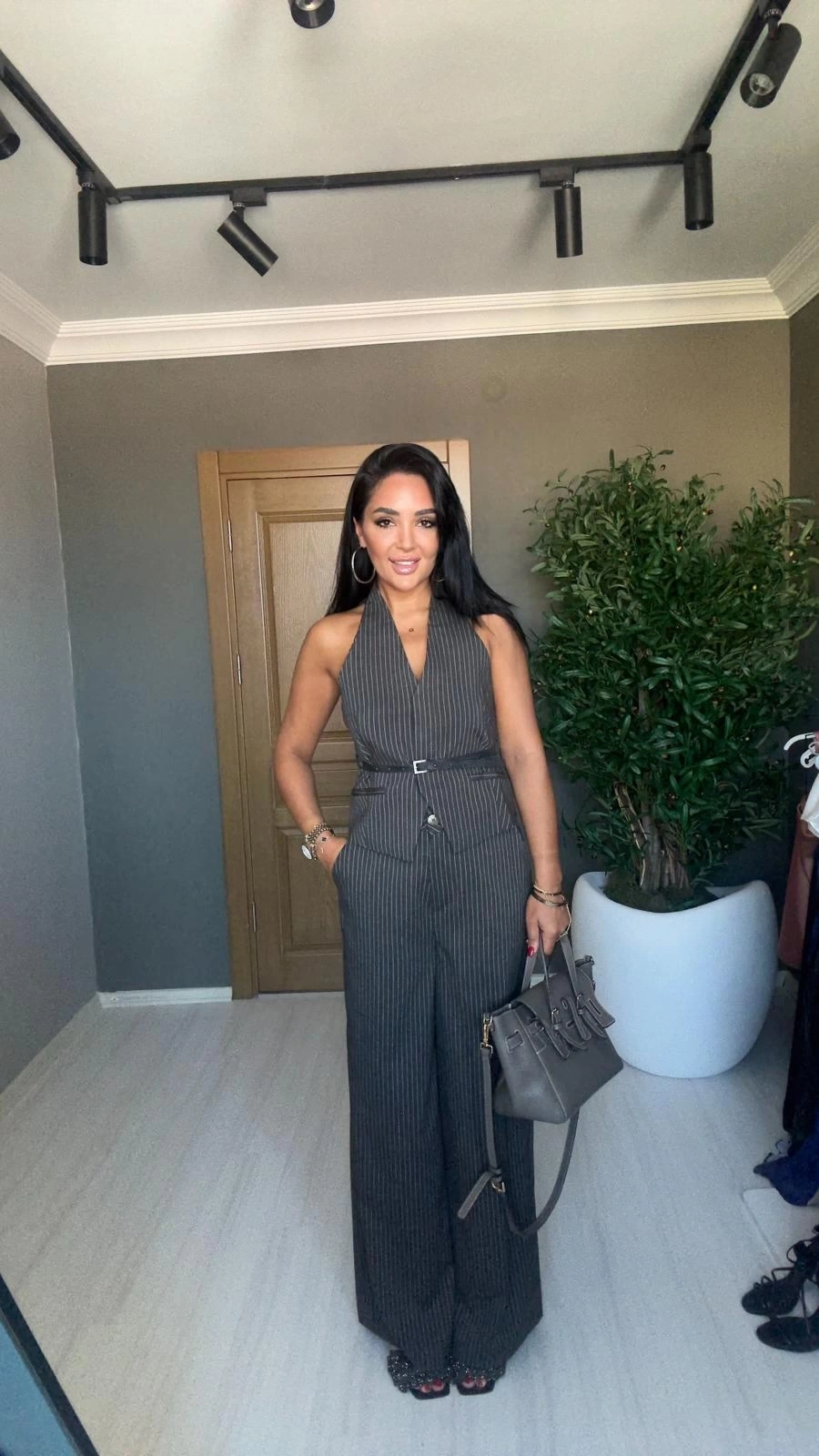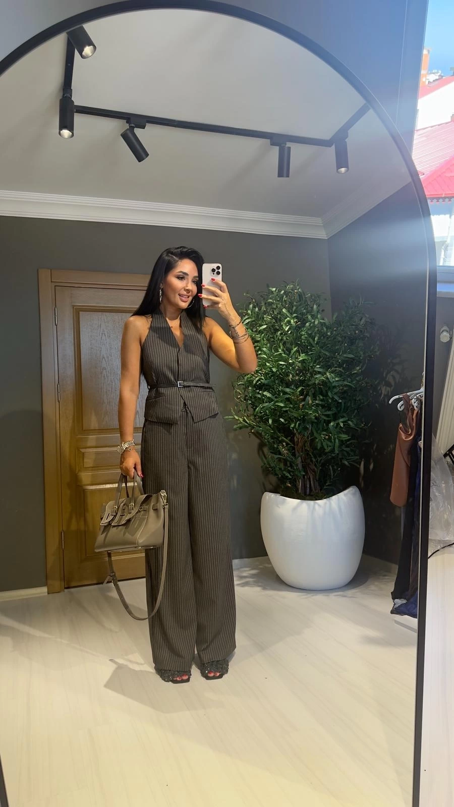 Beyaz Çizgili Yelekli-Pantolon Takım Gri