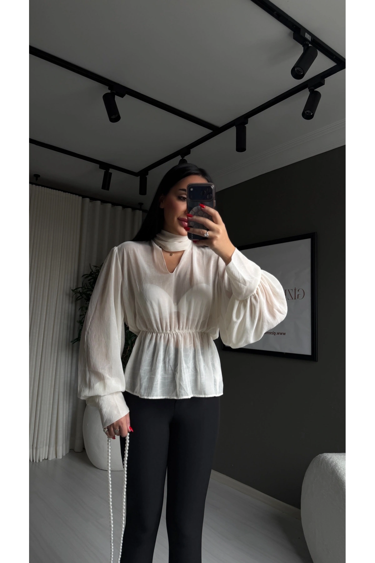 Şifon Vatkalı Beli Lastikli Ekru Bluz