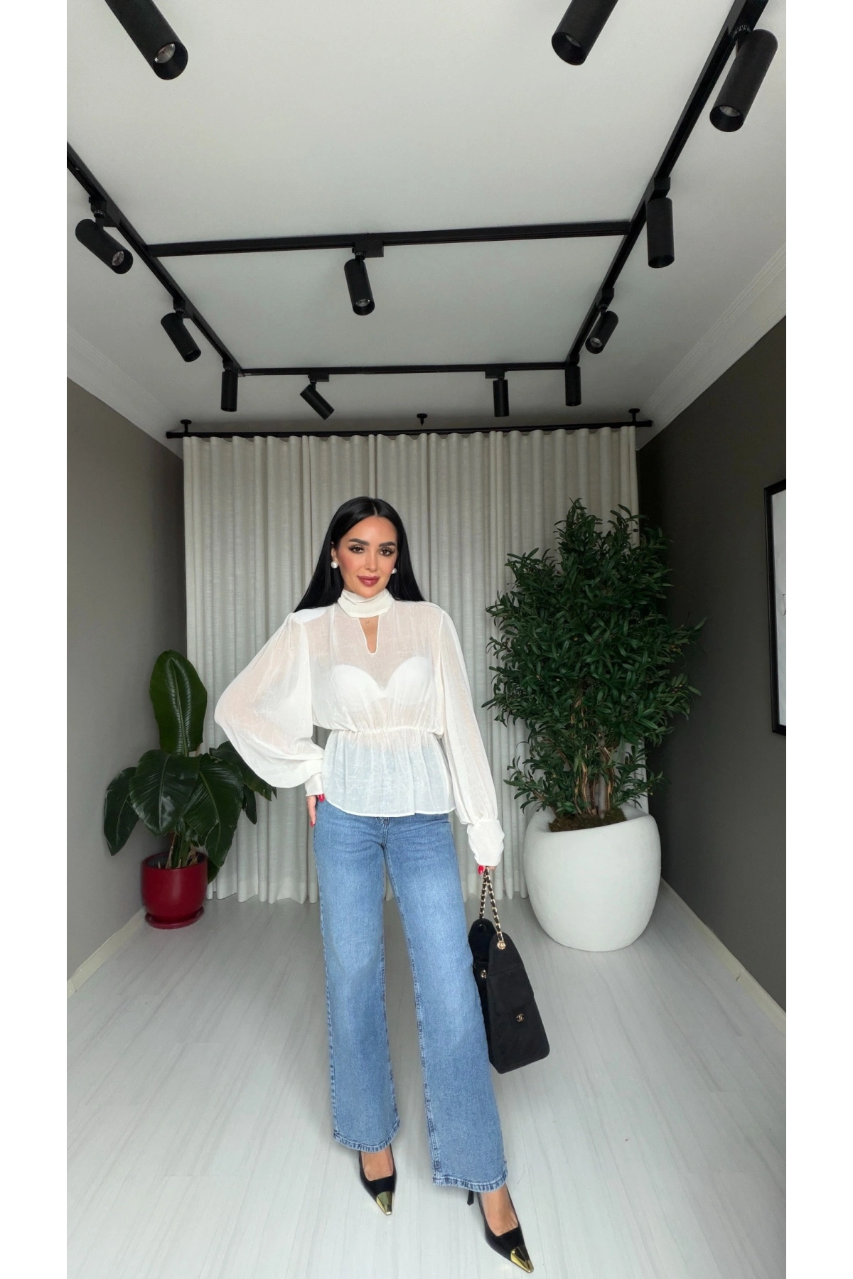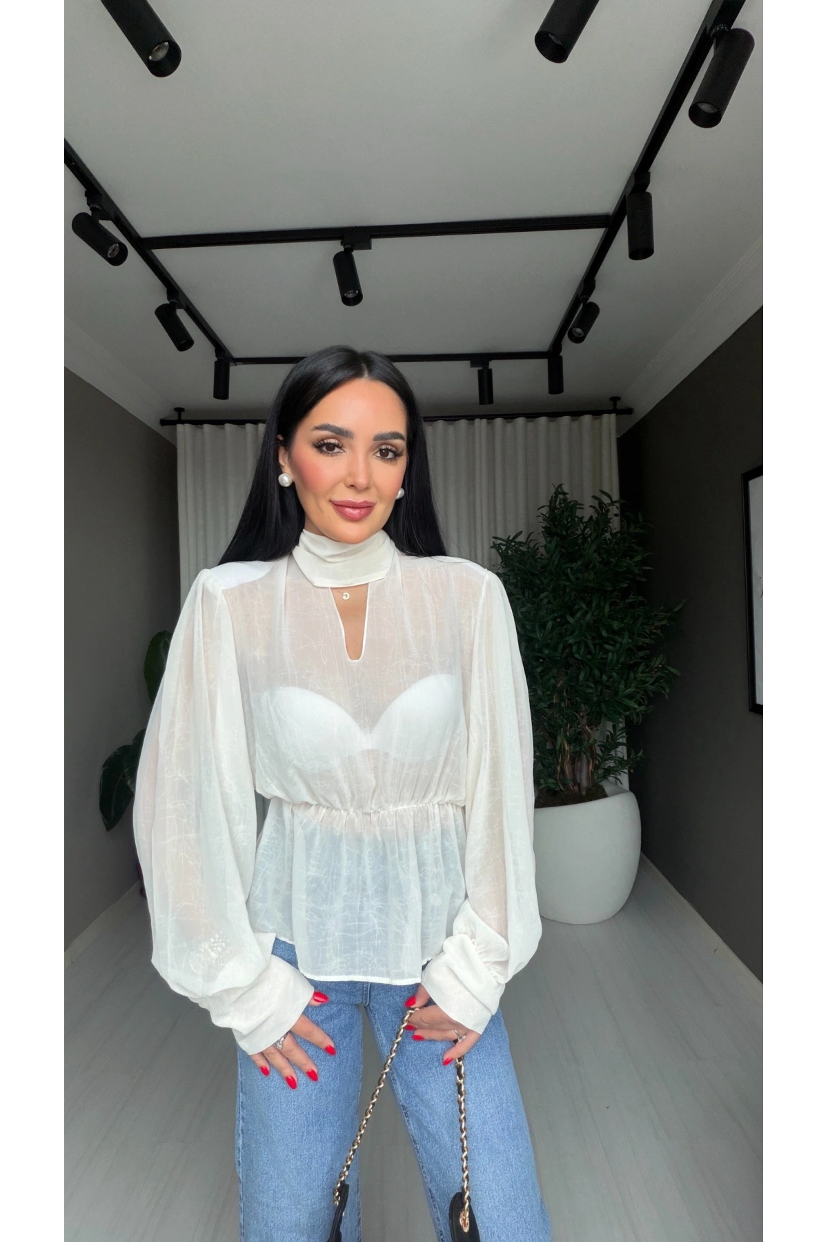 Dilvin Fitilli Transparan Triko Bluz Beyaz