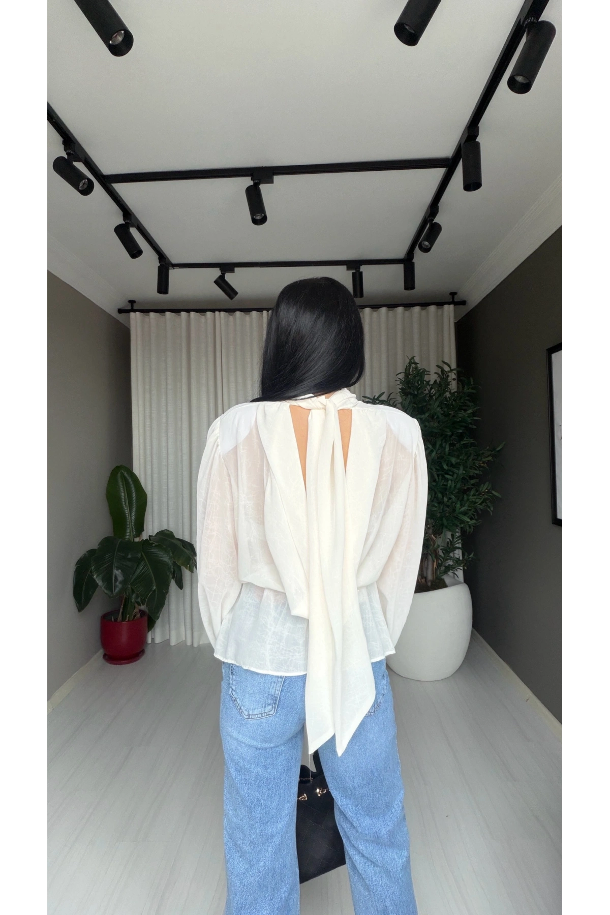 Saten Halter Yaka Sırtı Açık Bluz Beyaz