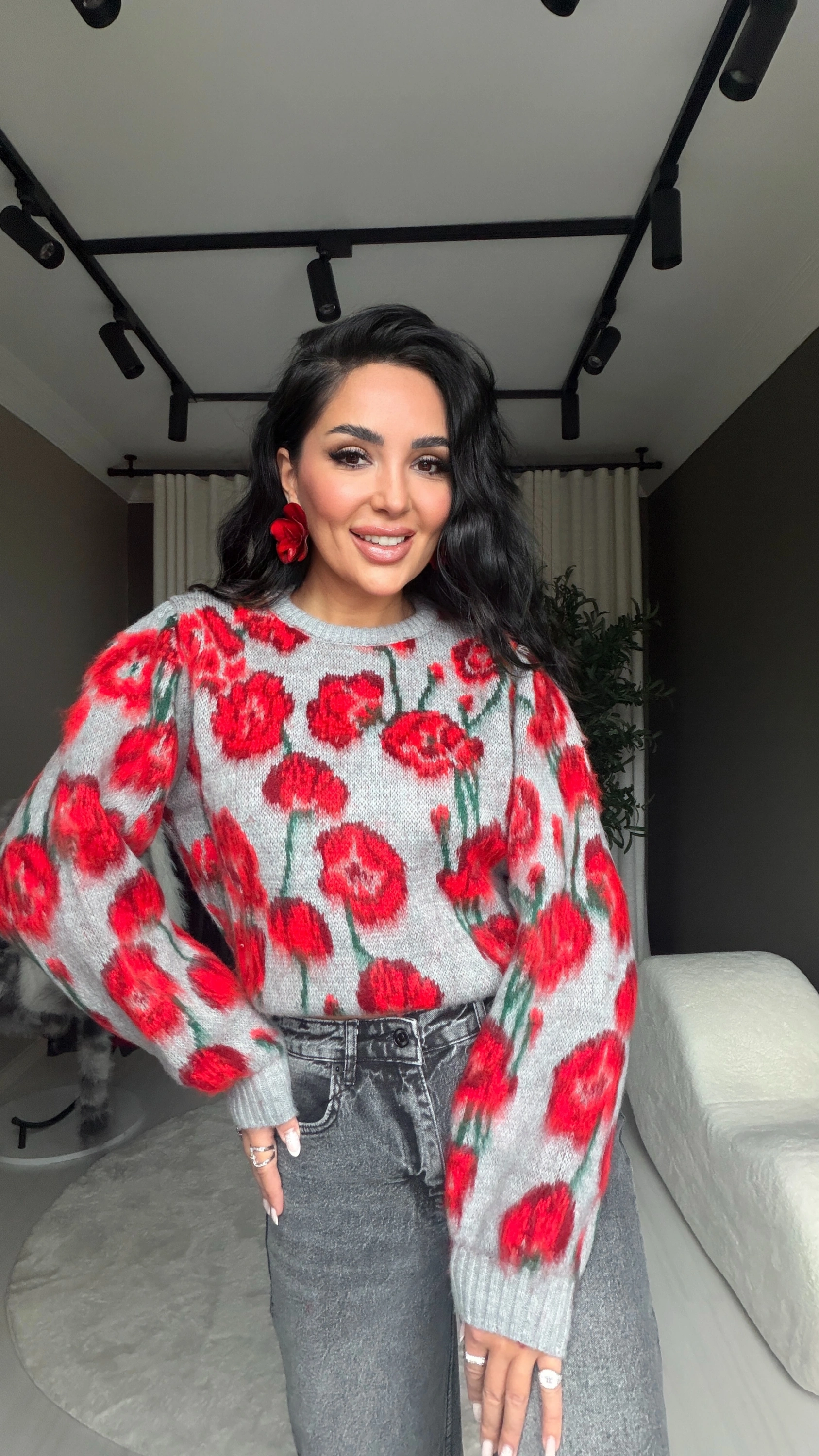 ? Kırmızı Çiçek Desenli Açık Gri Standart Beden Kazak