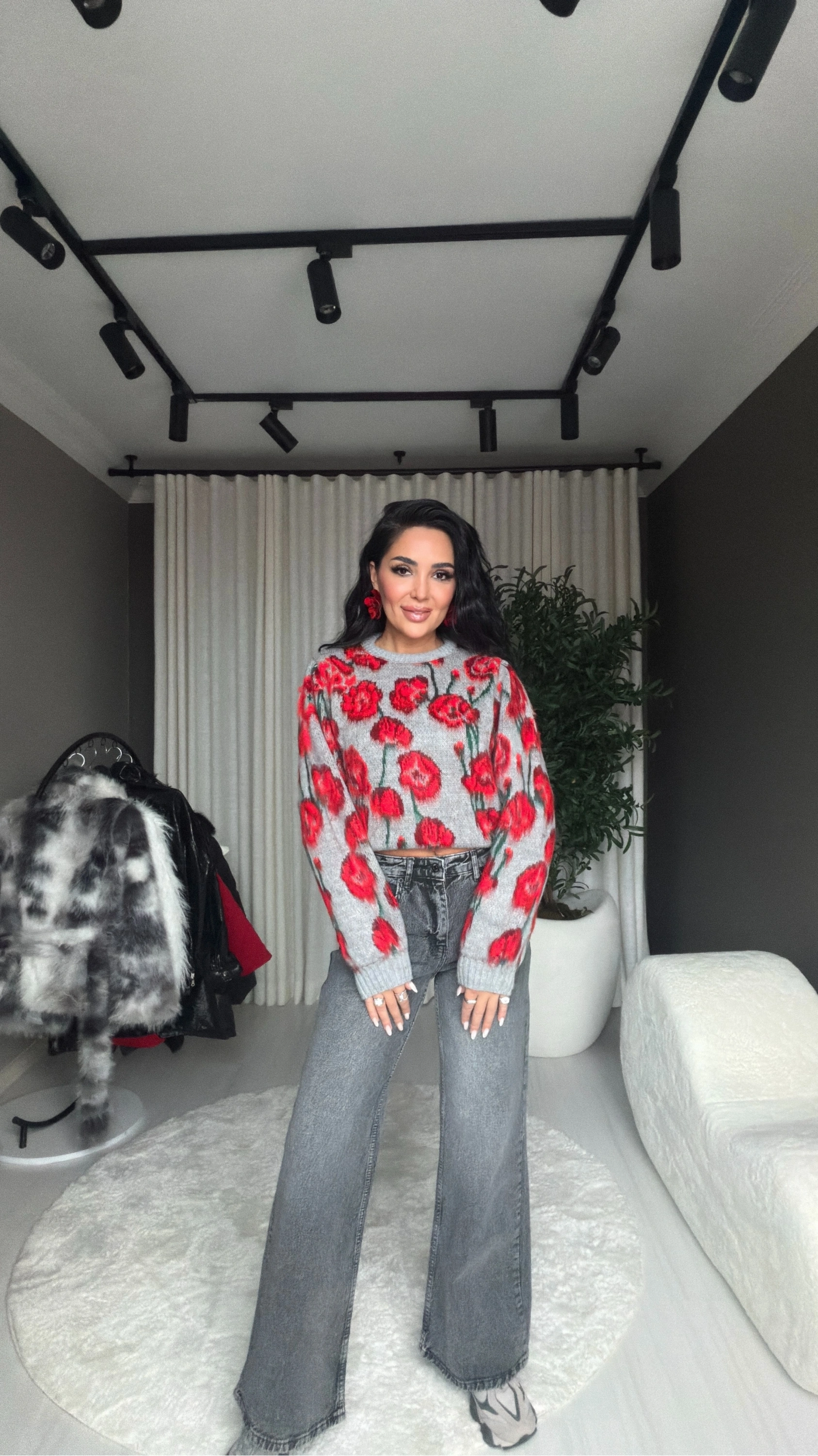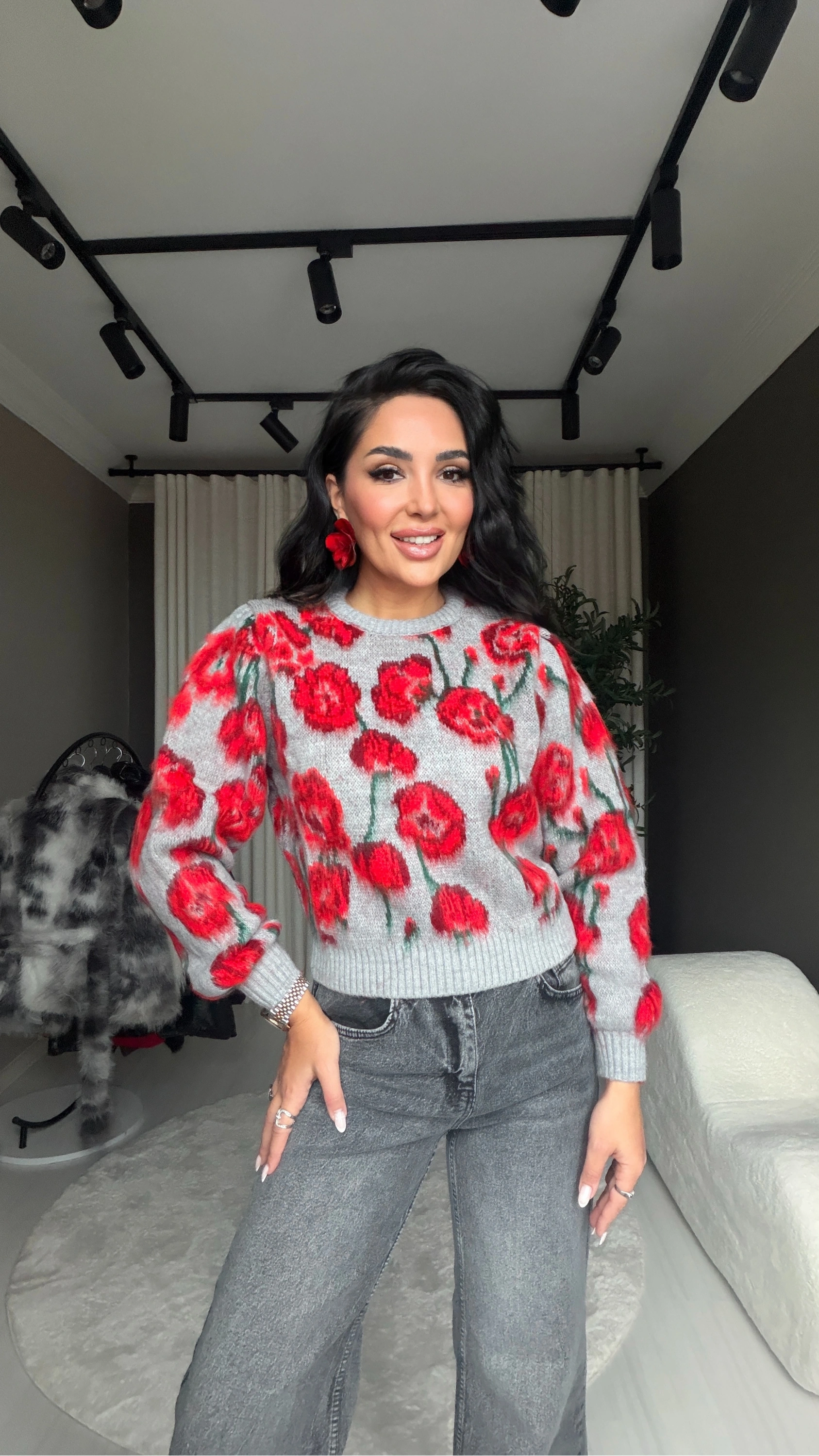 ?️ Gardırobunuza hem şık hem de rahat bir parça eklemek istiyorsanız, bu kırmızı çiçek desenli açık gri standart beden kazak tam size göre!