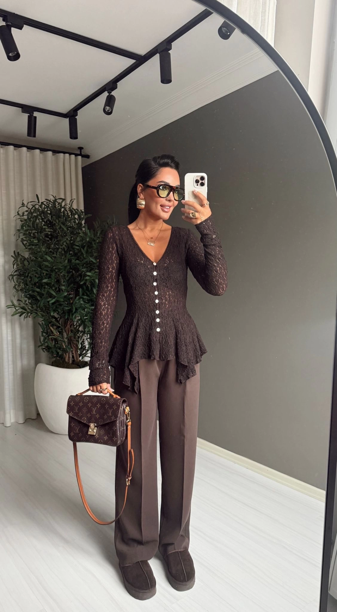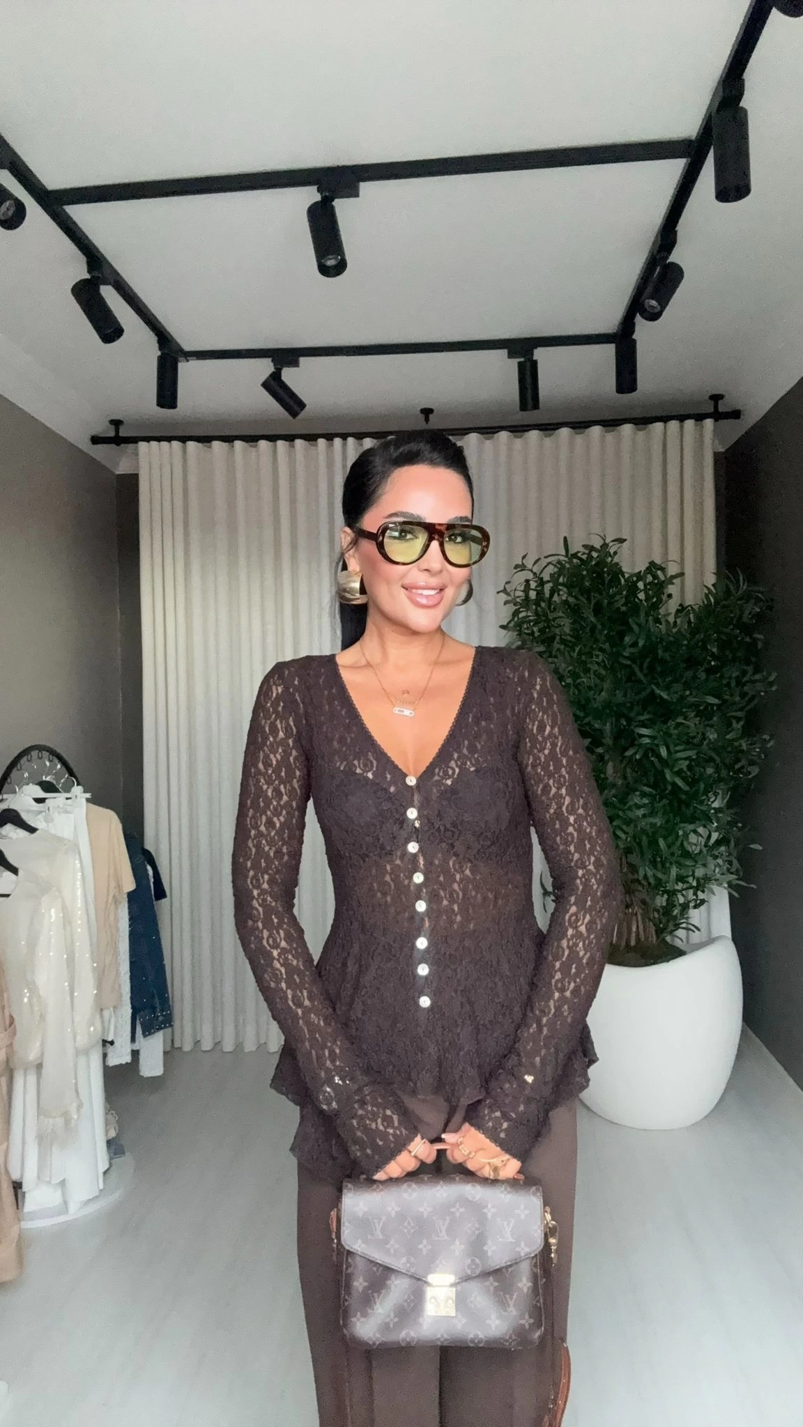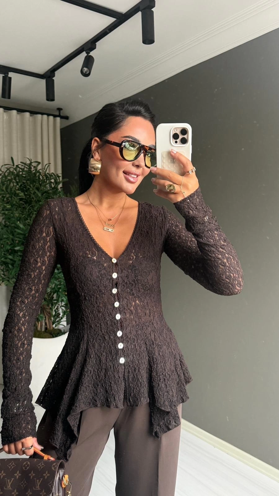 Dilvin Düğmeli Dantel Hırka Kahverengi