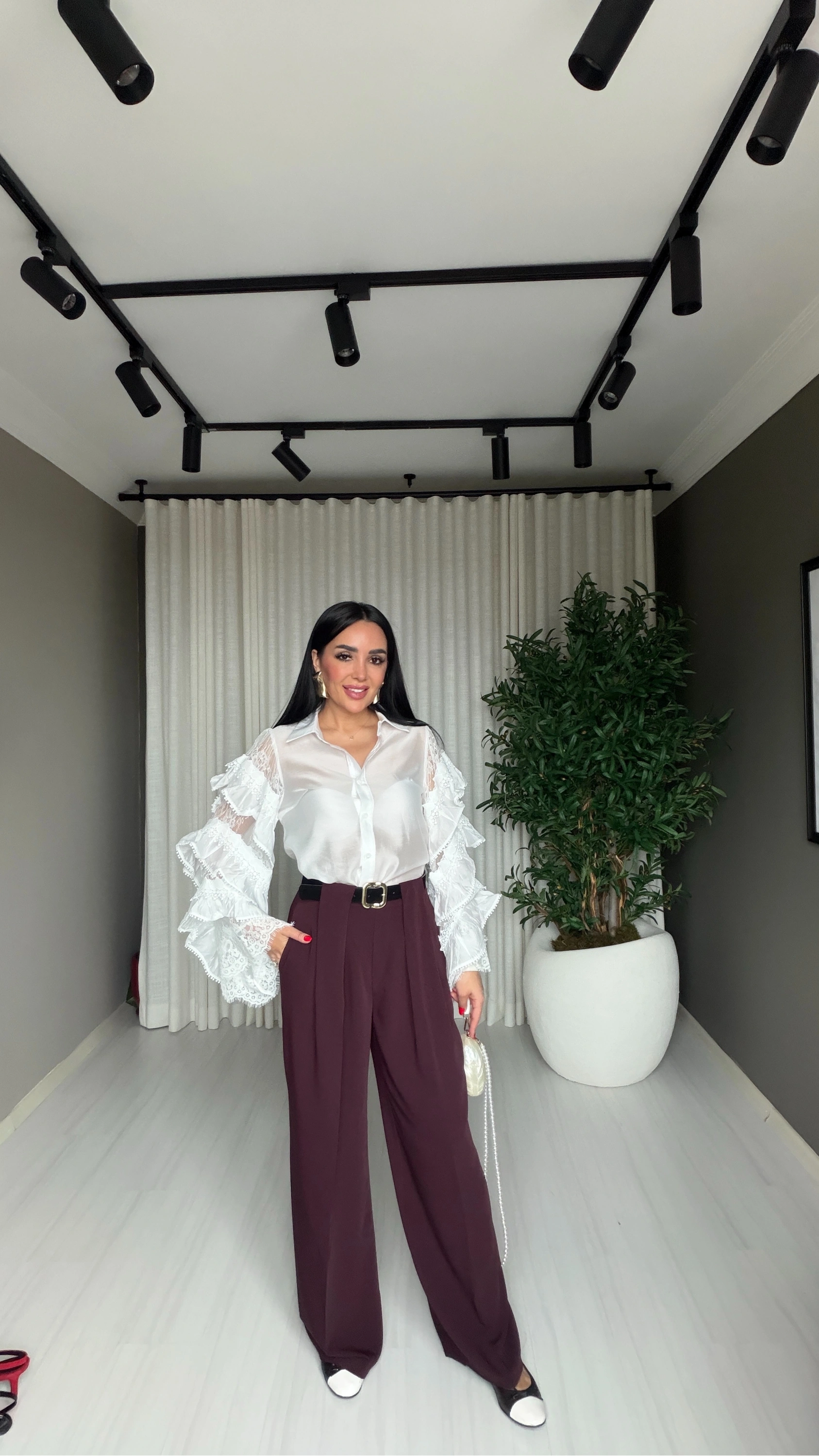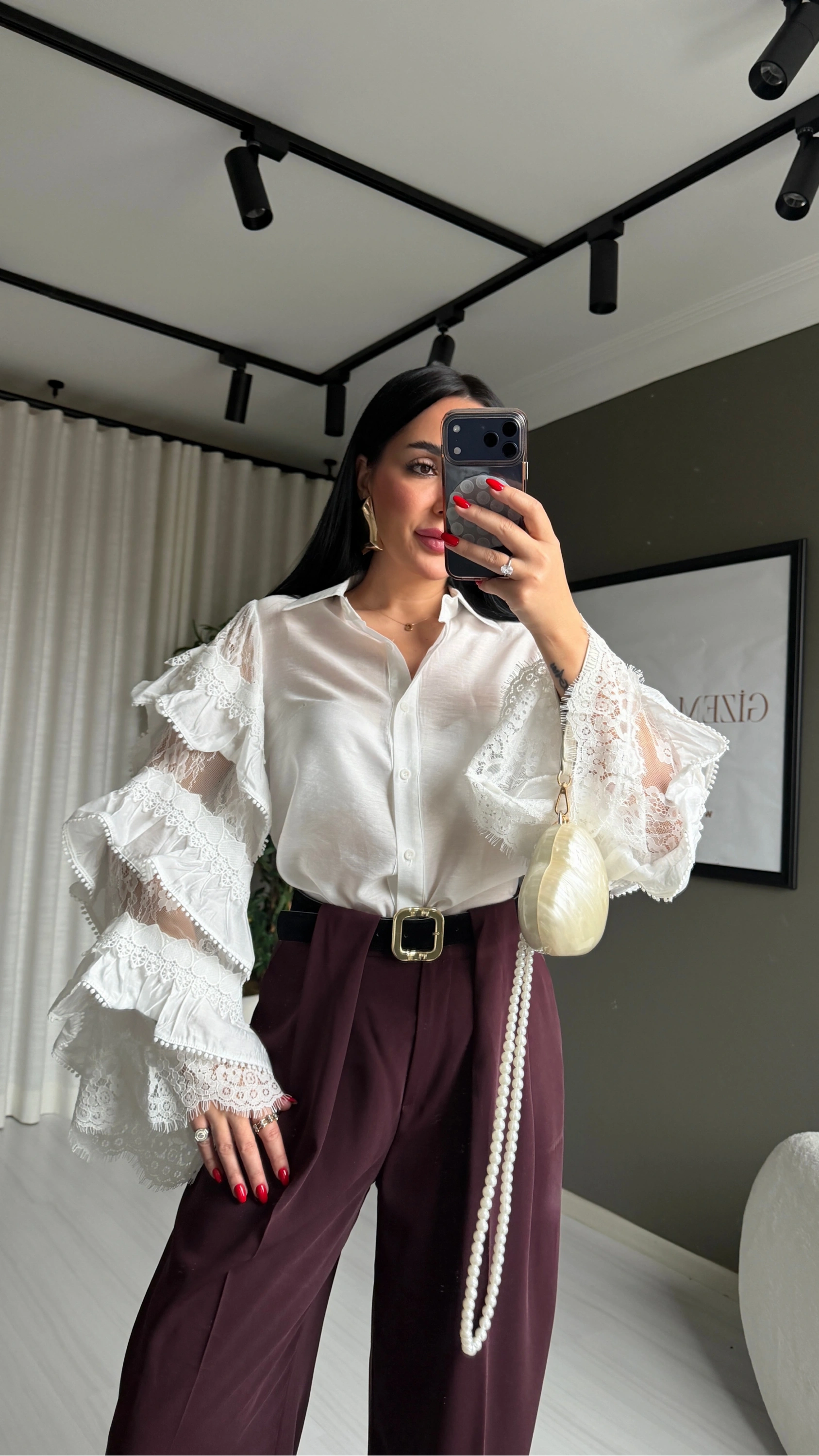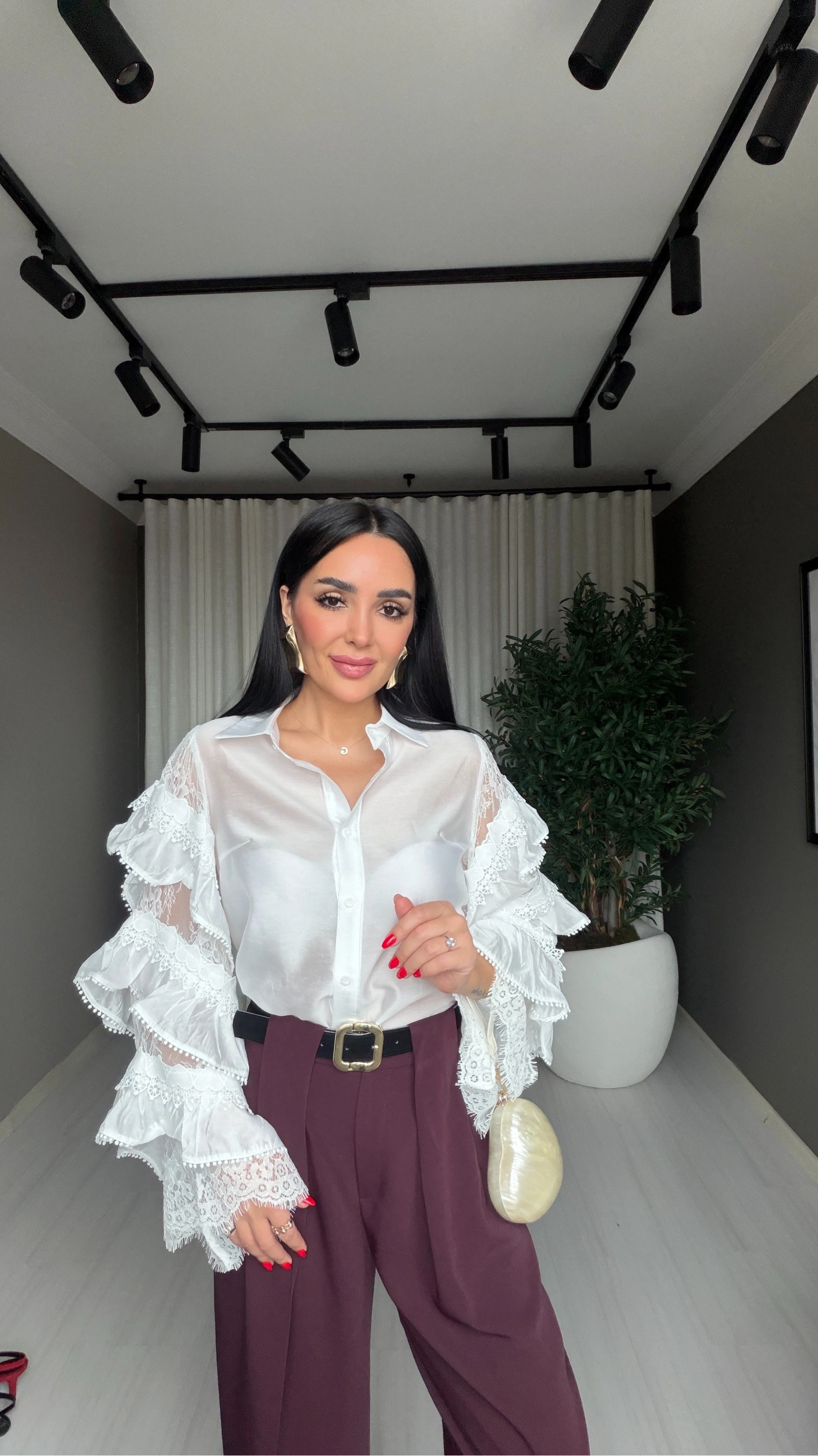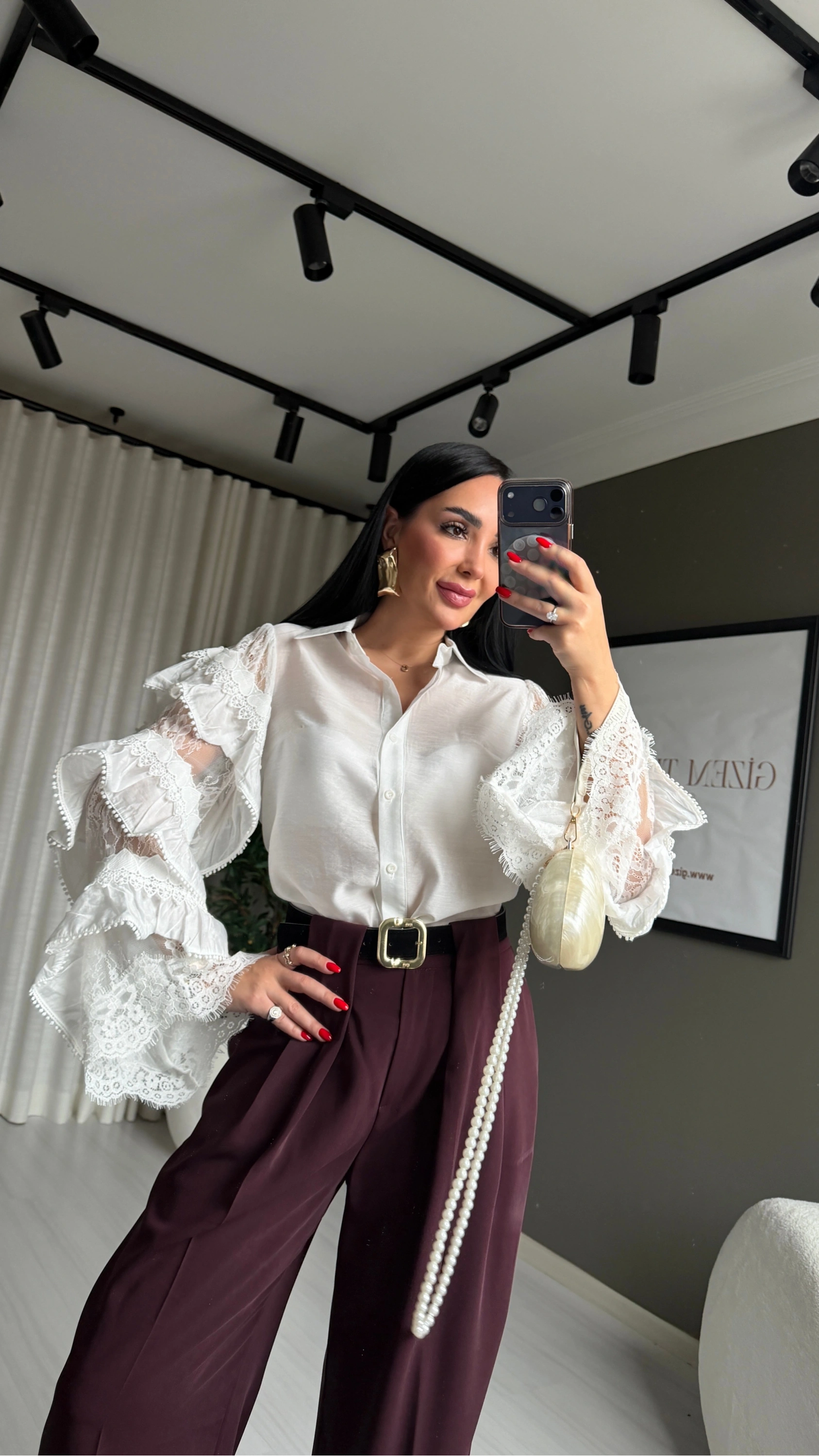 Beyaz dantel gömlek, gardırobunuzdaki birçok parçayla uyum sağlar.