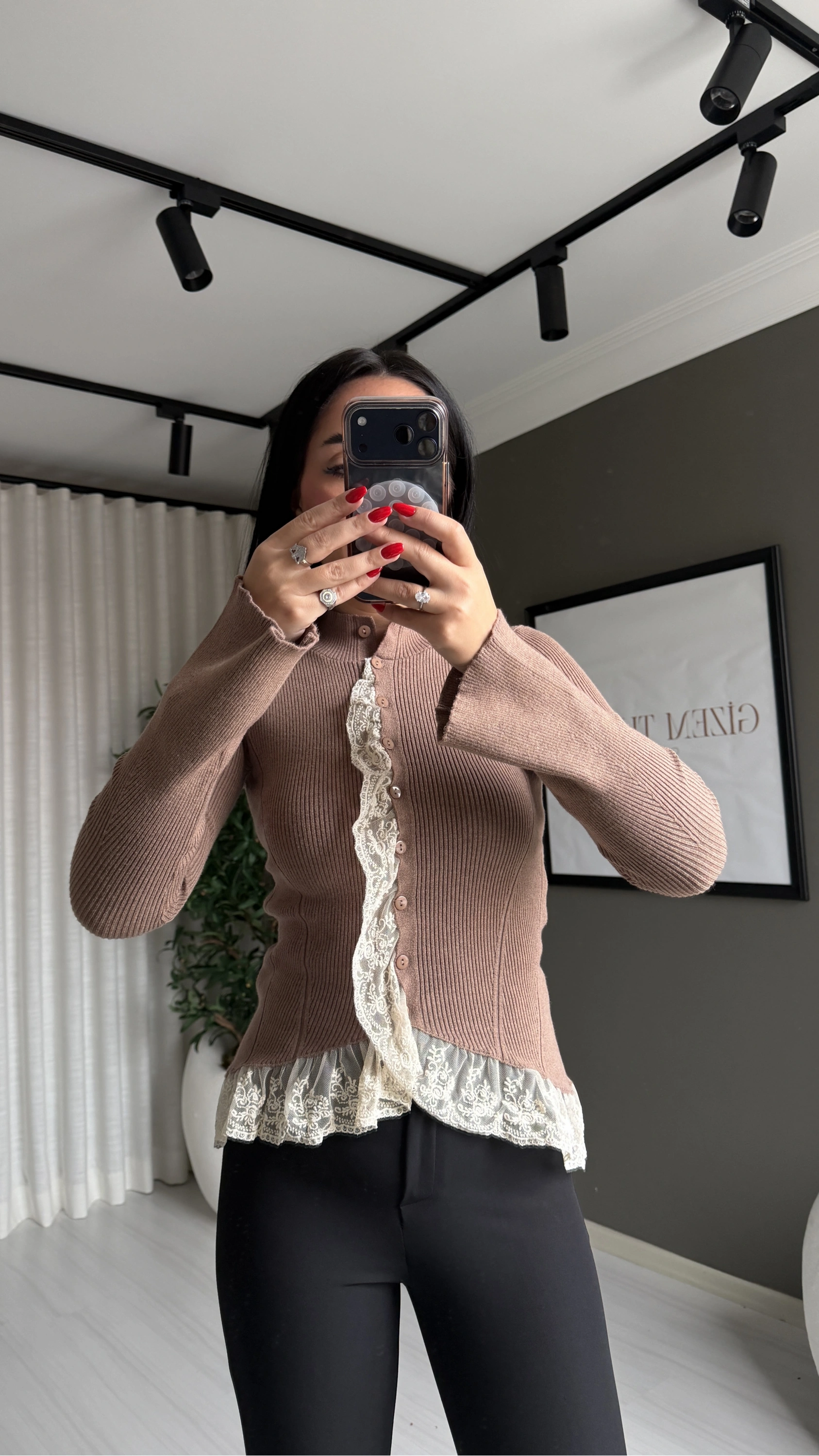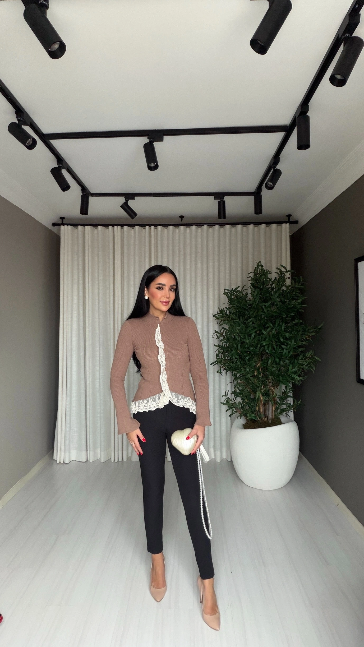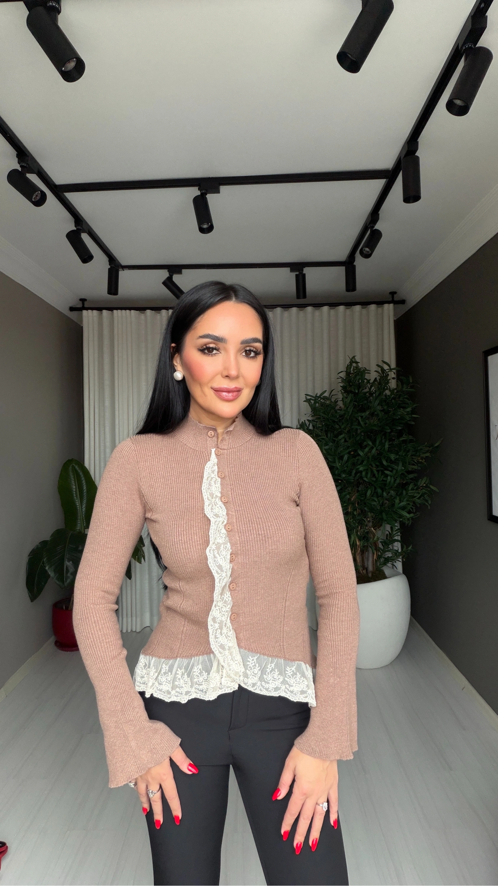 Fitilli Dantel Detaylı Kahverengi Hırka, hem günlük şıklığı hem de rahatlığı bir arada sunan zamansız bir parçadır. Doğal tonların sıcaklığını yansıtan kahverengi rengi ve zarif dantel detayları sayesinde kombinlerinize sofistike bir dokunuş katar.