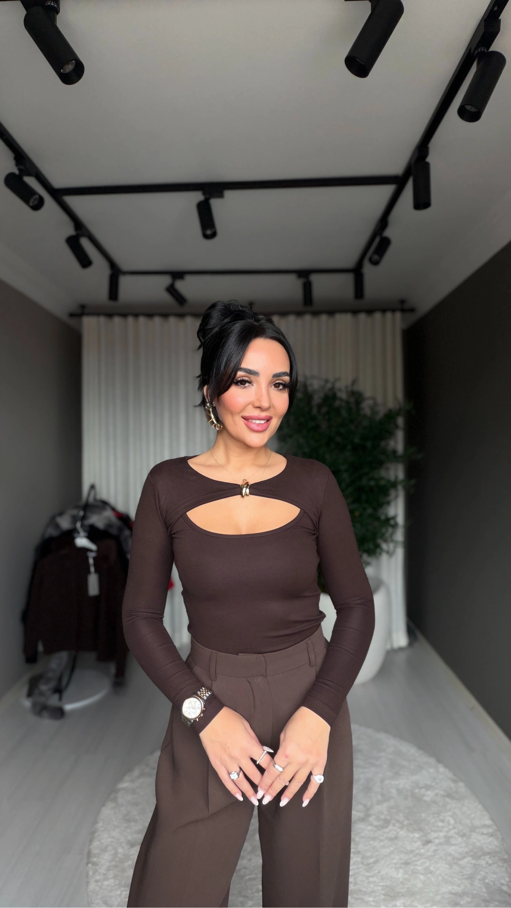 Gold Tokalı Kahverengi Body – Şık, Zarif ve Modern Tasarım