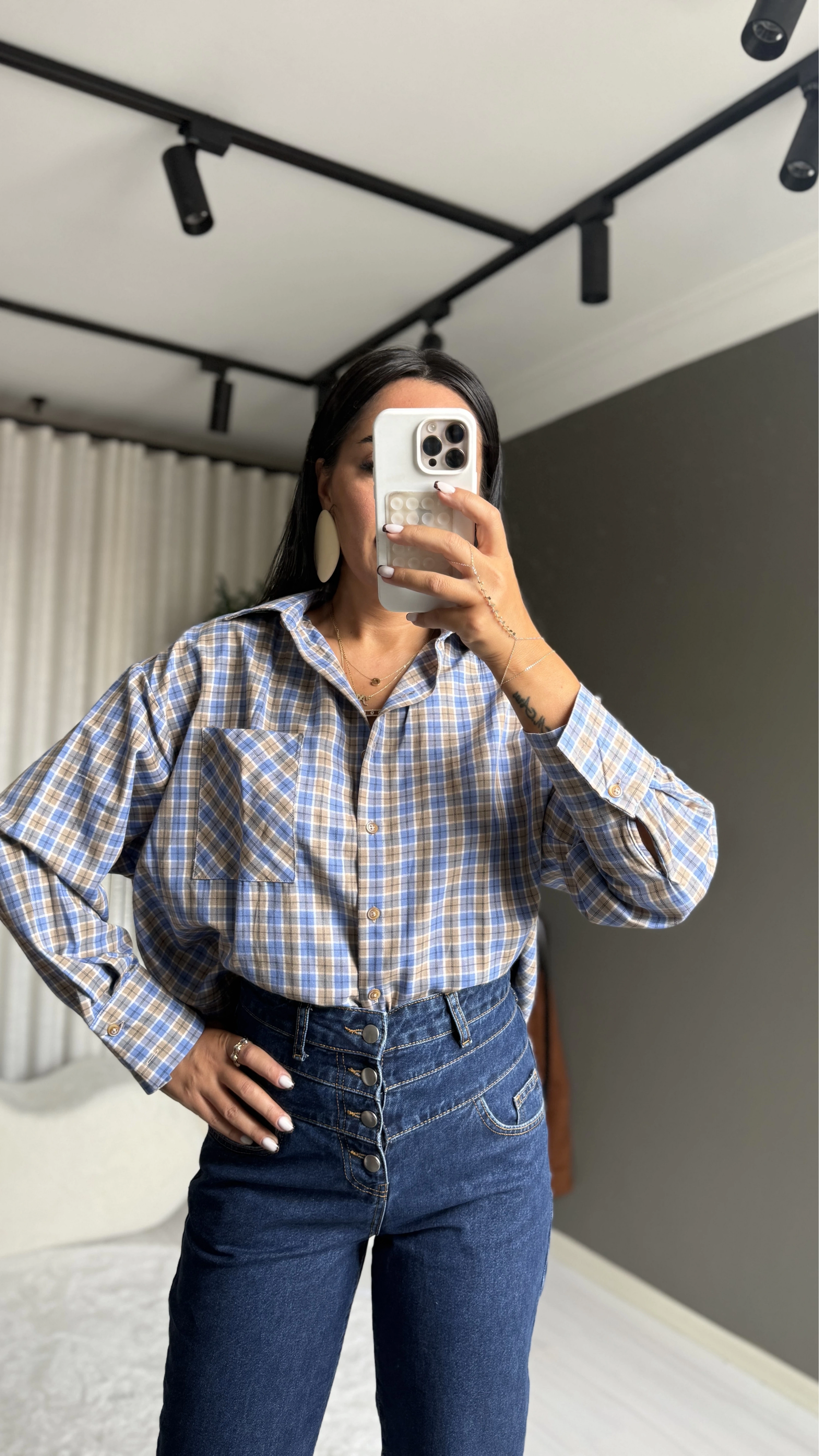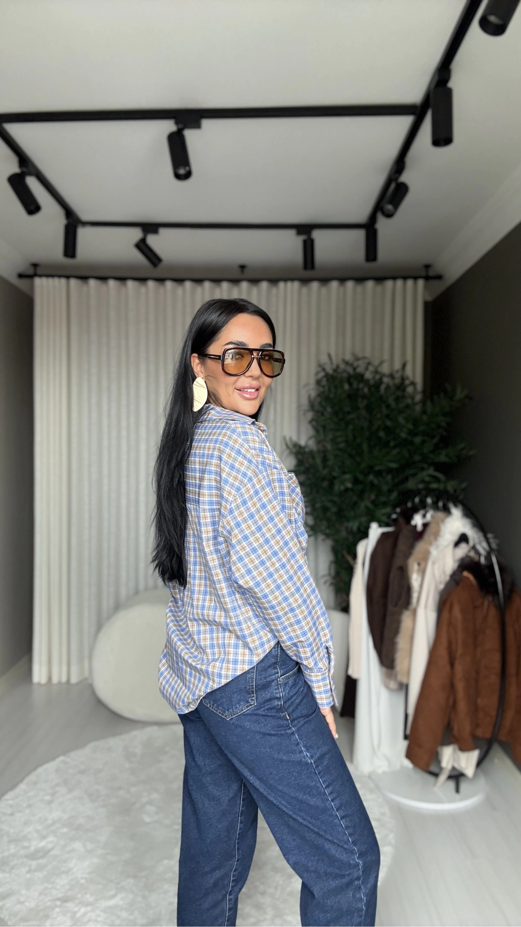 Kareli desen ve mavi ton kombinasyonuyla rustik ve çağdaş bir denge yakalıyor.