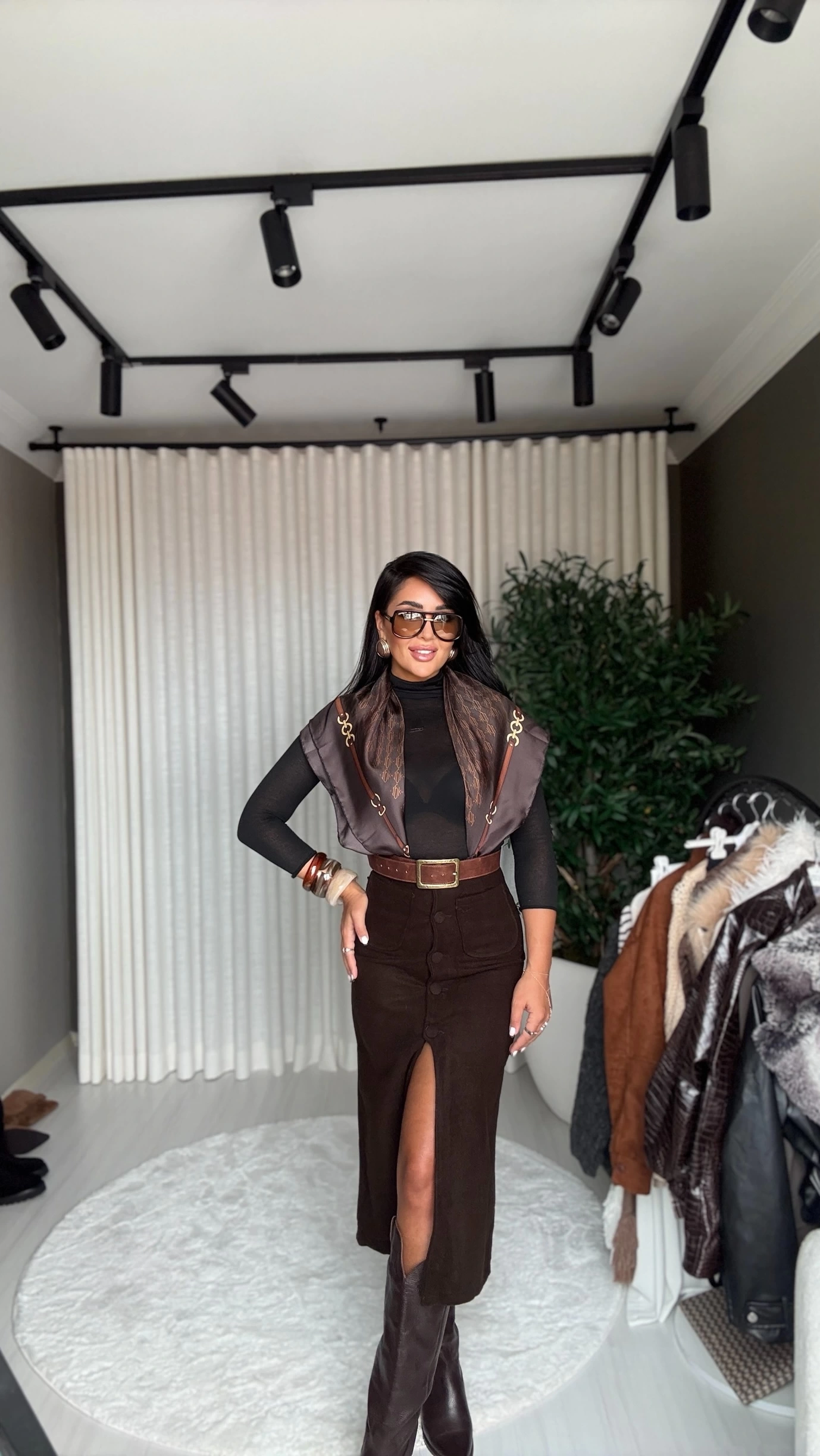 Midi boy ve kahverengi ton, hem profesyonel hem gündüz-öğle-aksam üçgeni kombinlerinde çok yönlü kullanım imkânı sunar.