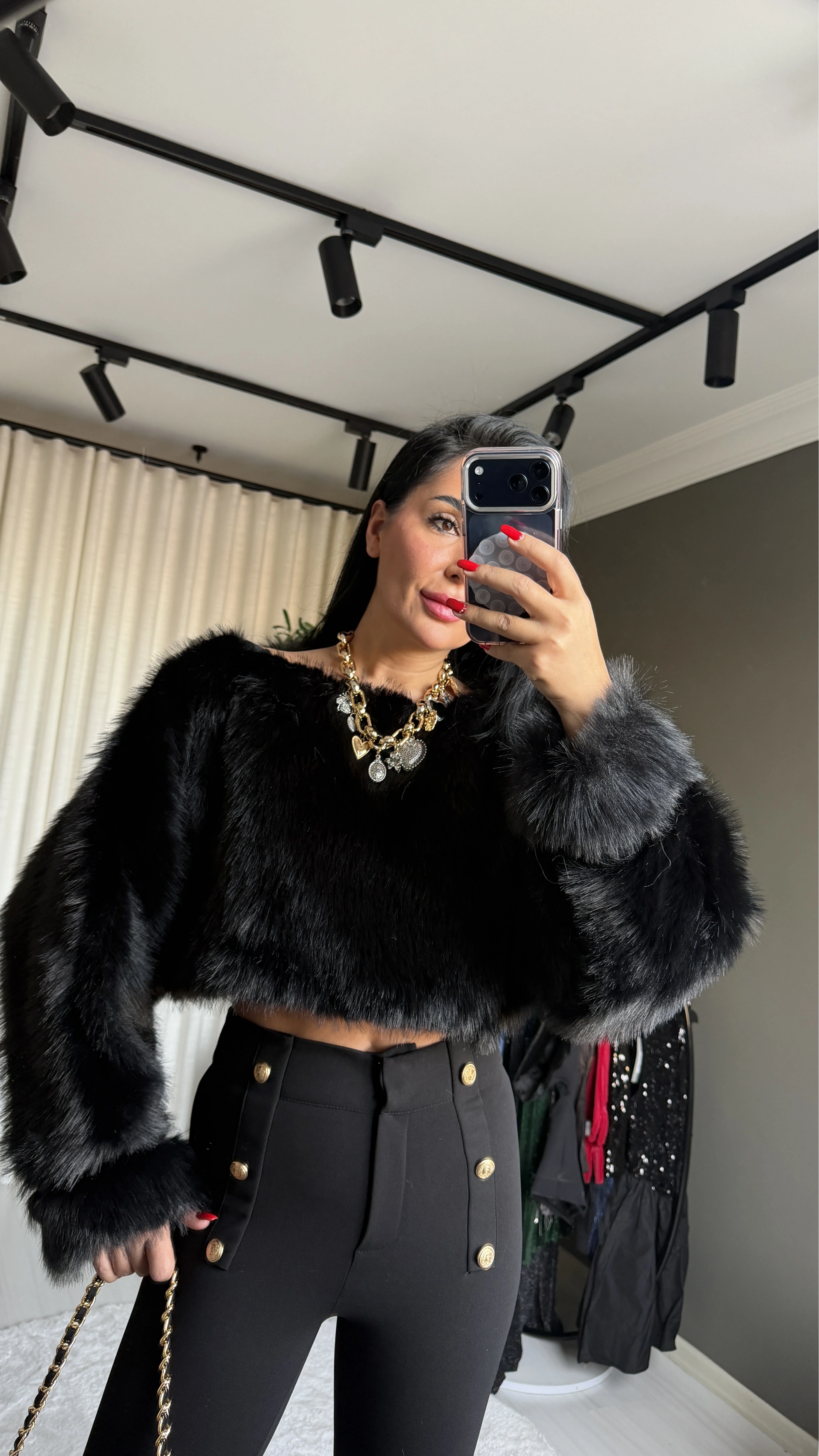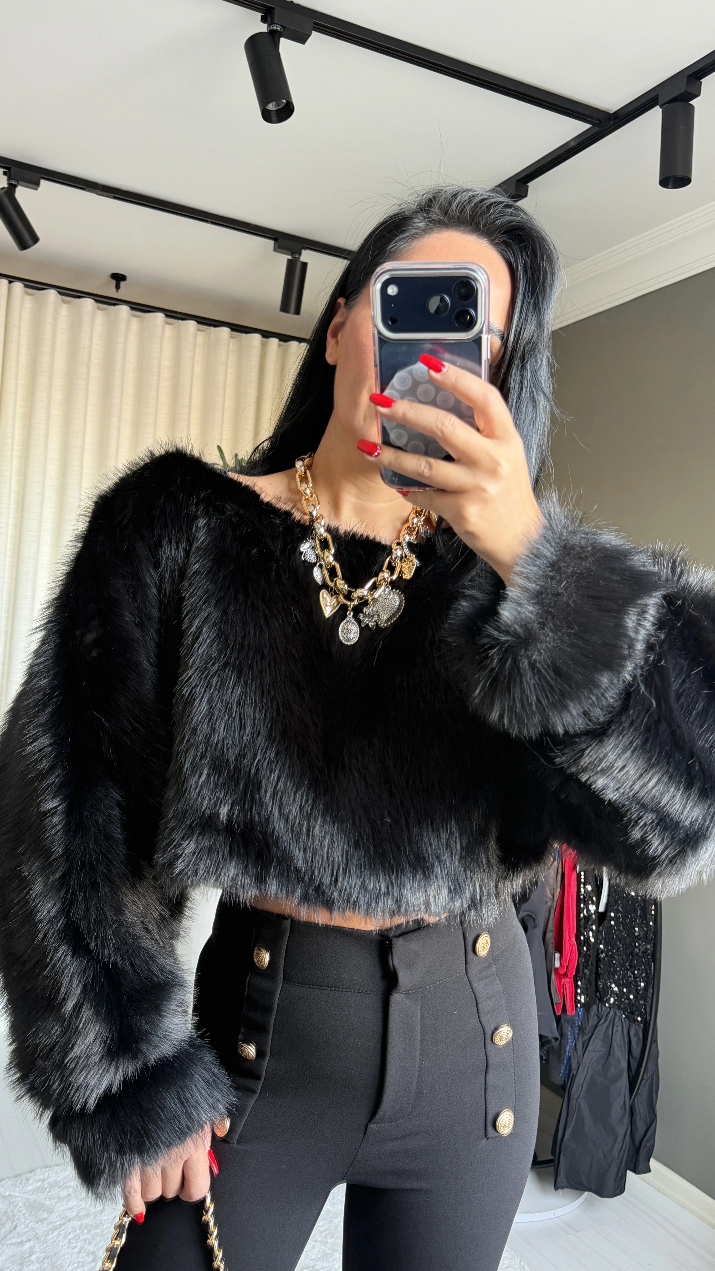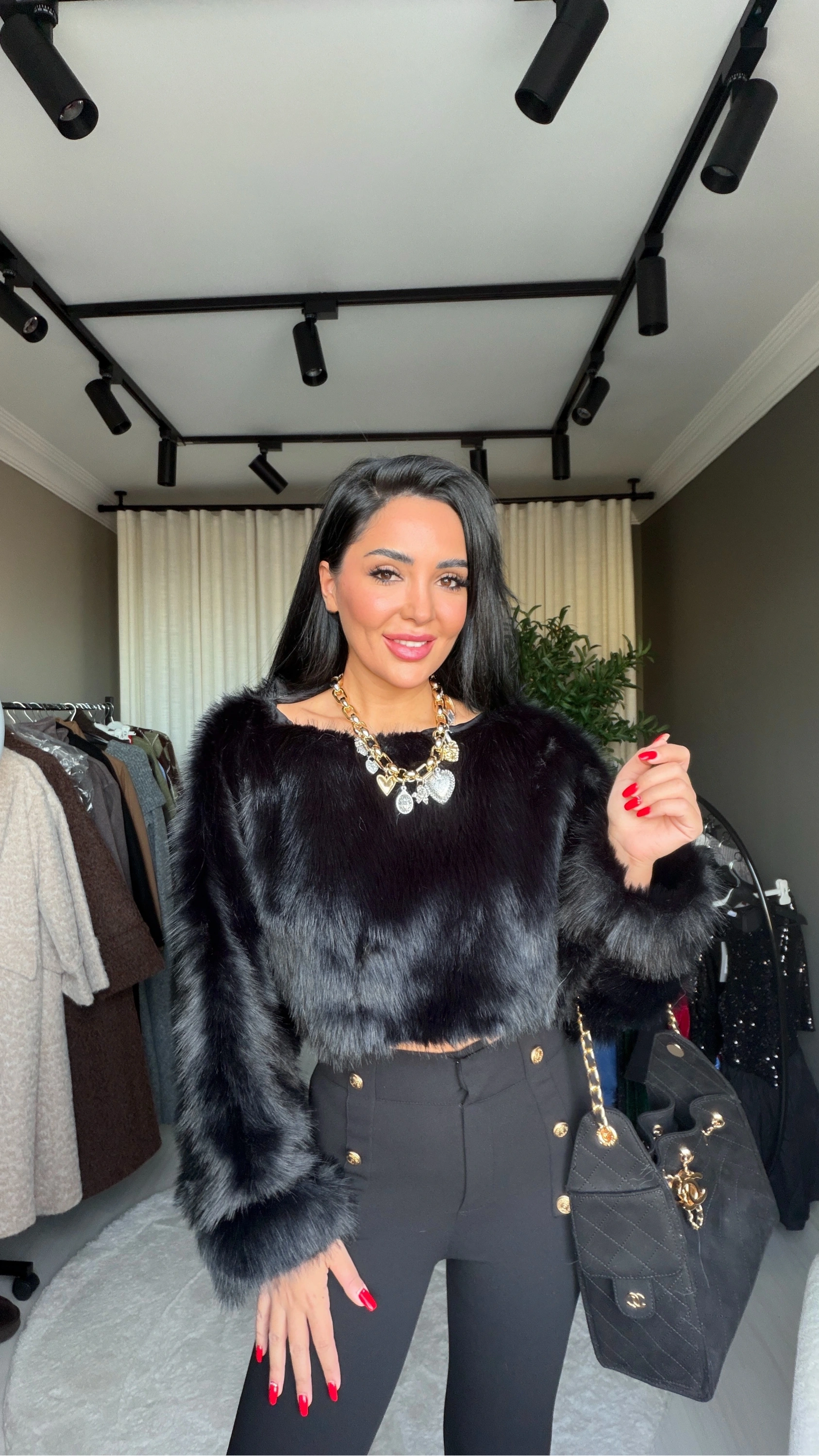 Bu sezon gardırobunuzun en dikkat çekici parçası olacak “kayık yaka, kısa, siyah, kürk detaylı üst”, modern tasarımı ve lüks dokusuyla fark yaratır. Kayık yaka tasarımı, omuz hattını zarifçe vurgularken kürkle zenginleştirilmiş detaylar, parçaya sofistike bir dokunuş katar. Özel davetlerden şehir gecelerine kadar her ortamda göz alıcı bir stil yaratmanız için tasarlandı. Kayra
