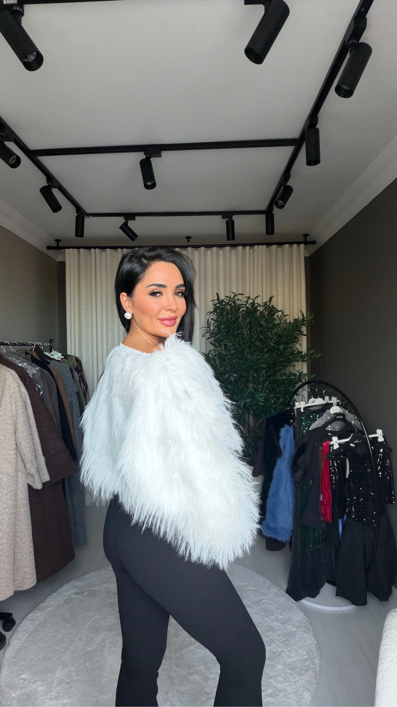 Suud Collection Ekru Vola Kısa Kürk Ceket – Sofistike ve trend kısa kürk parçası.