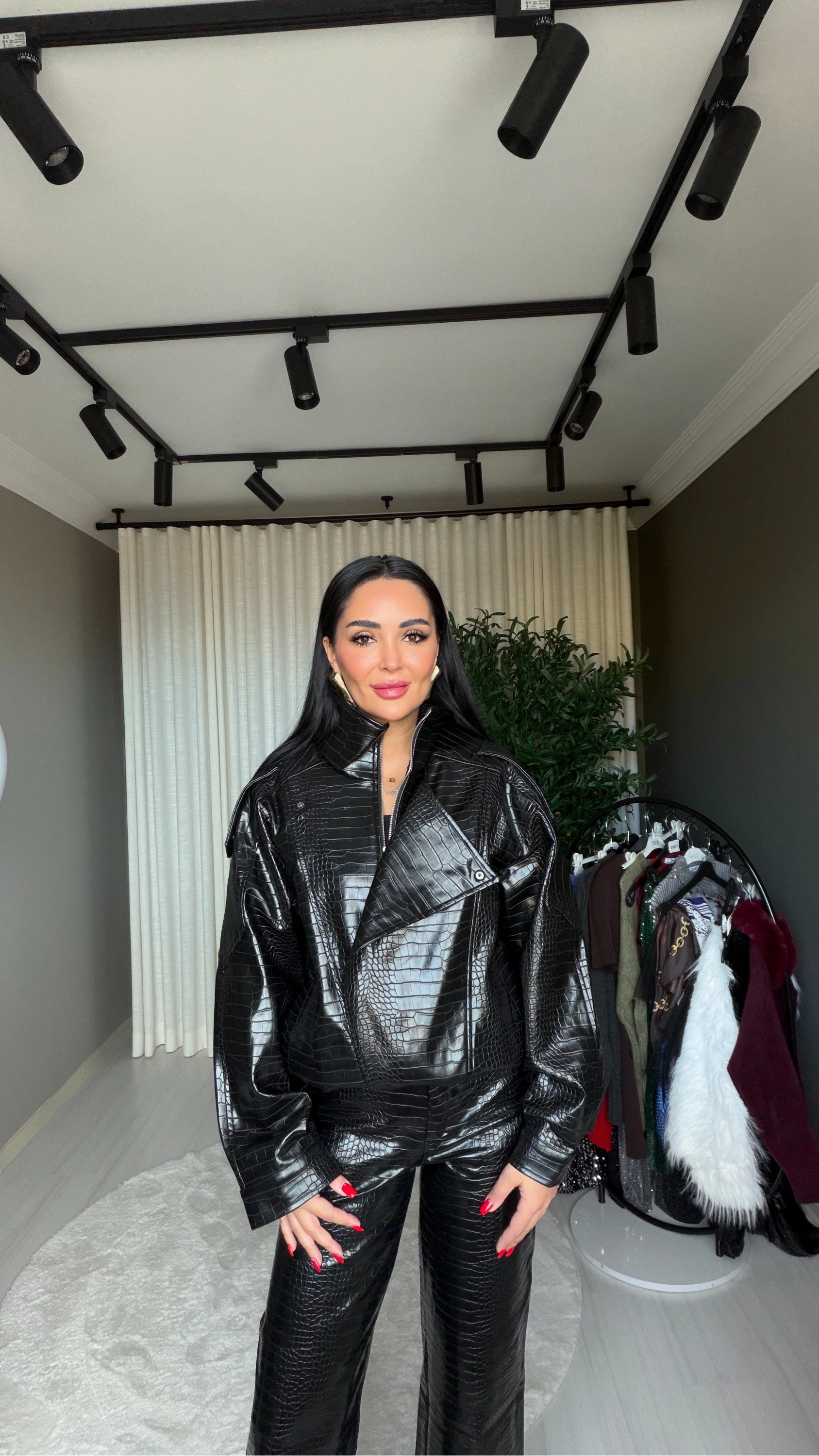 Bu krokodil deri siyah bomber ceket, lüks dokusu, zamansız siyah rengi ve çok yönlü stil imkânı ile gardırobunuzun en dikkat çekici parçası olmaya hazır! ??