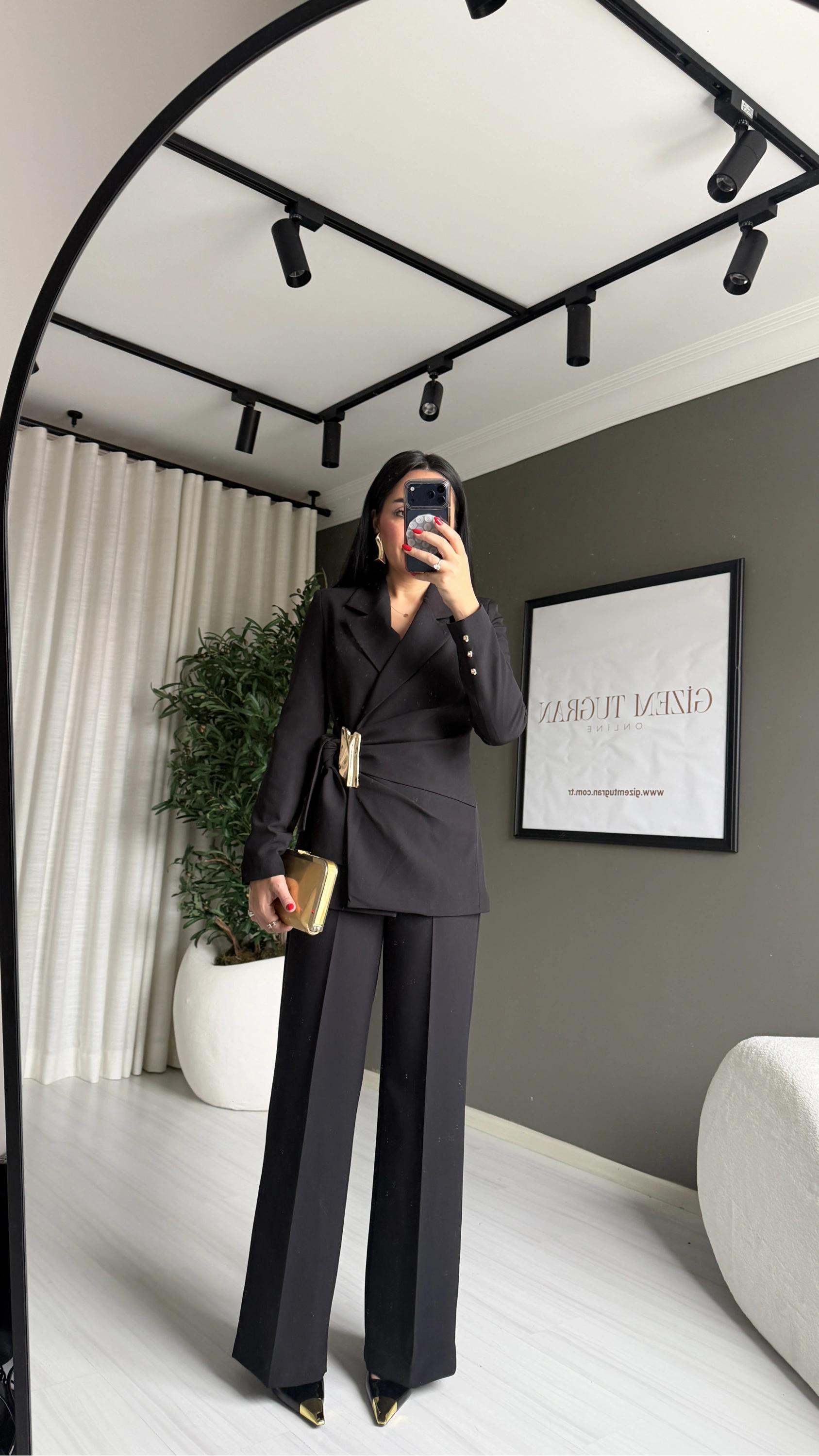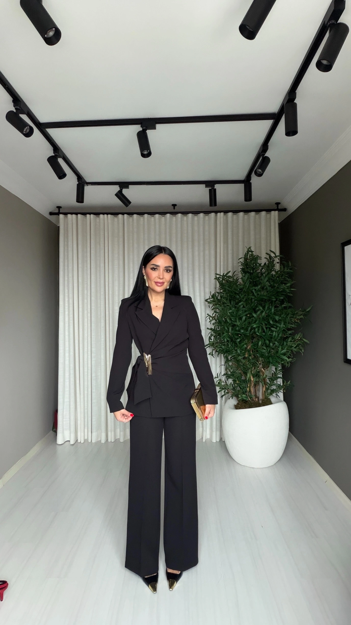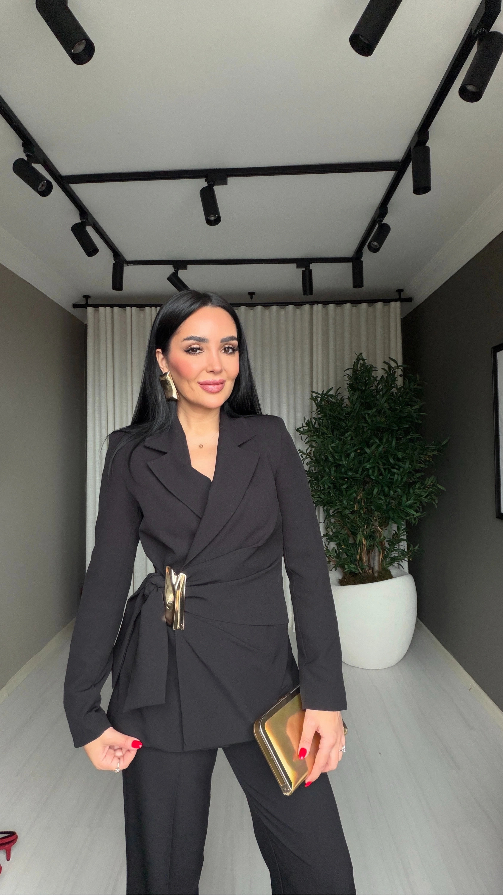 Gold tokalı kruvaze siyah takım, modern kadının zarafetini, gücünü ve stilini aynı anda yansıtan özel bir tasarımdır. Kruvaze kesimi sayesinde vücuda kusursuz oturur ve altın renk toka detayı ile klasik siyah takım anlayışına sofistike bir dokunuş katar.