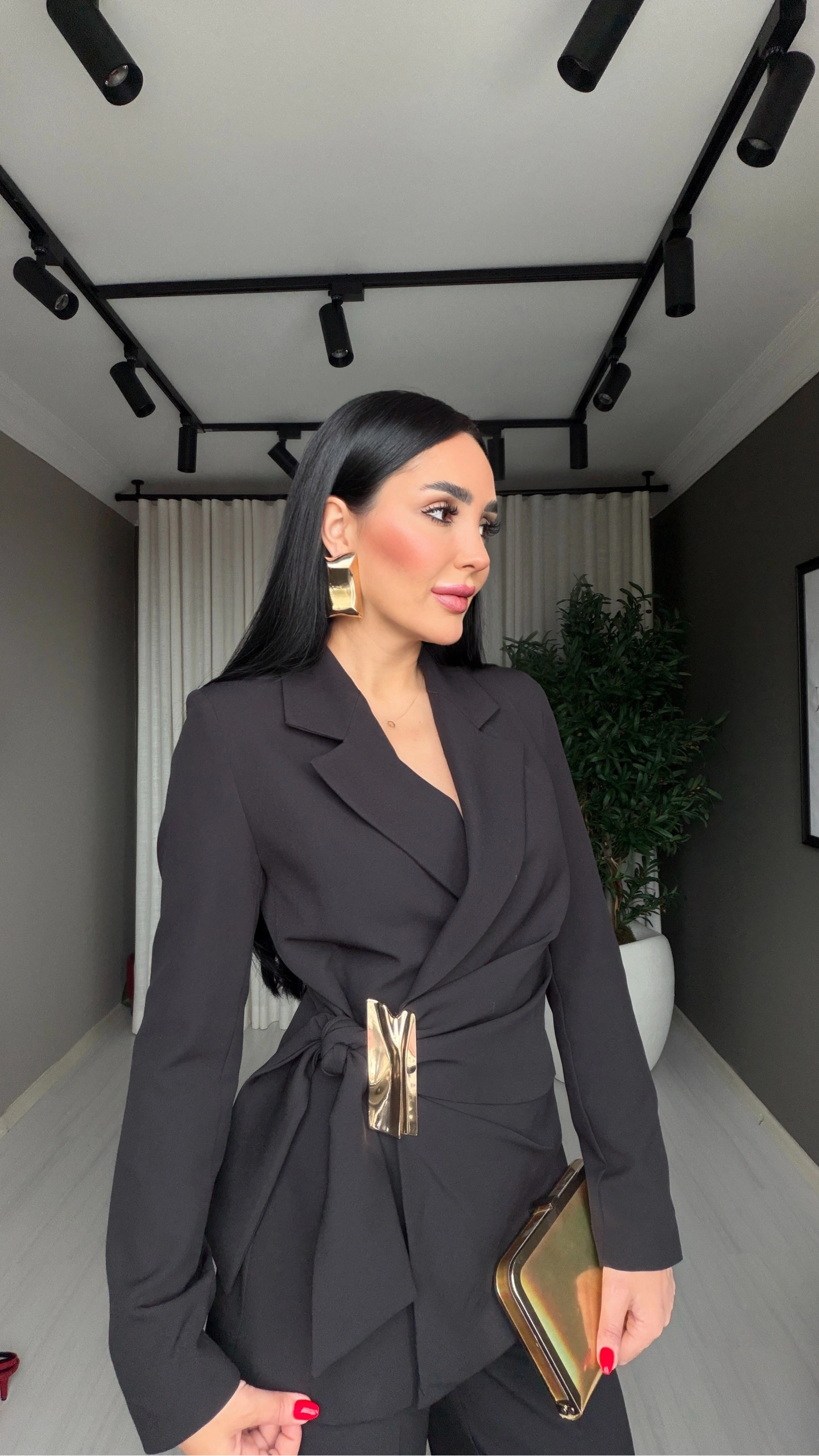 Bu gold tokalı kruvaze siyah takım, topuklu ayakkabı ve minimal takılar ile tamamlandığında güçlü bir ofis stili oluşturur. Daha iddialı bir görünüm için stiletto ve gold aksesuarlar ile kombinleyebilirsiniz.