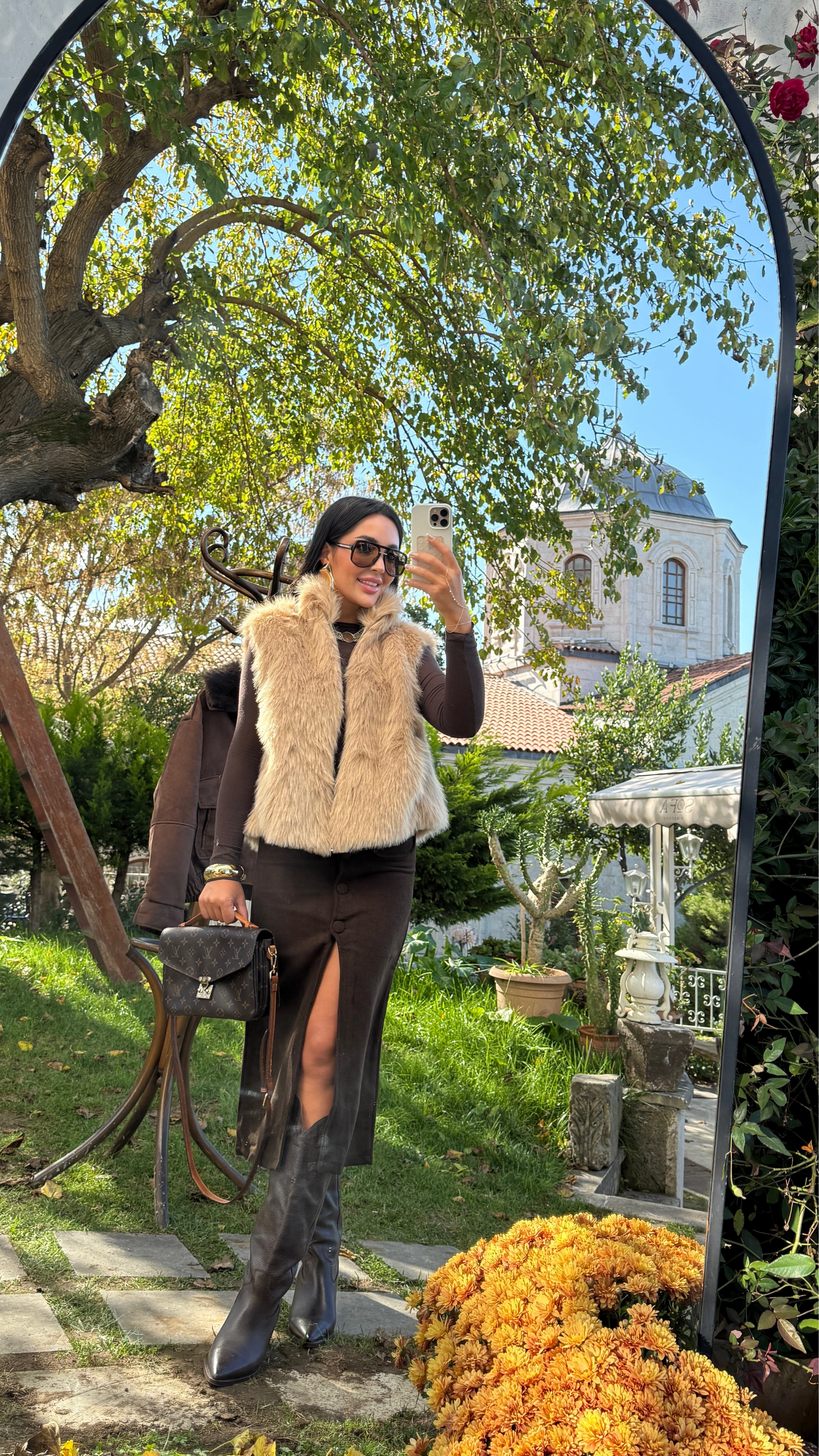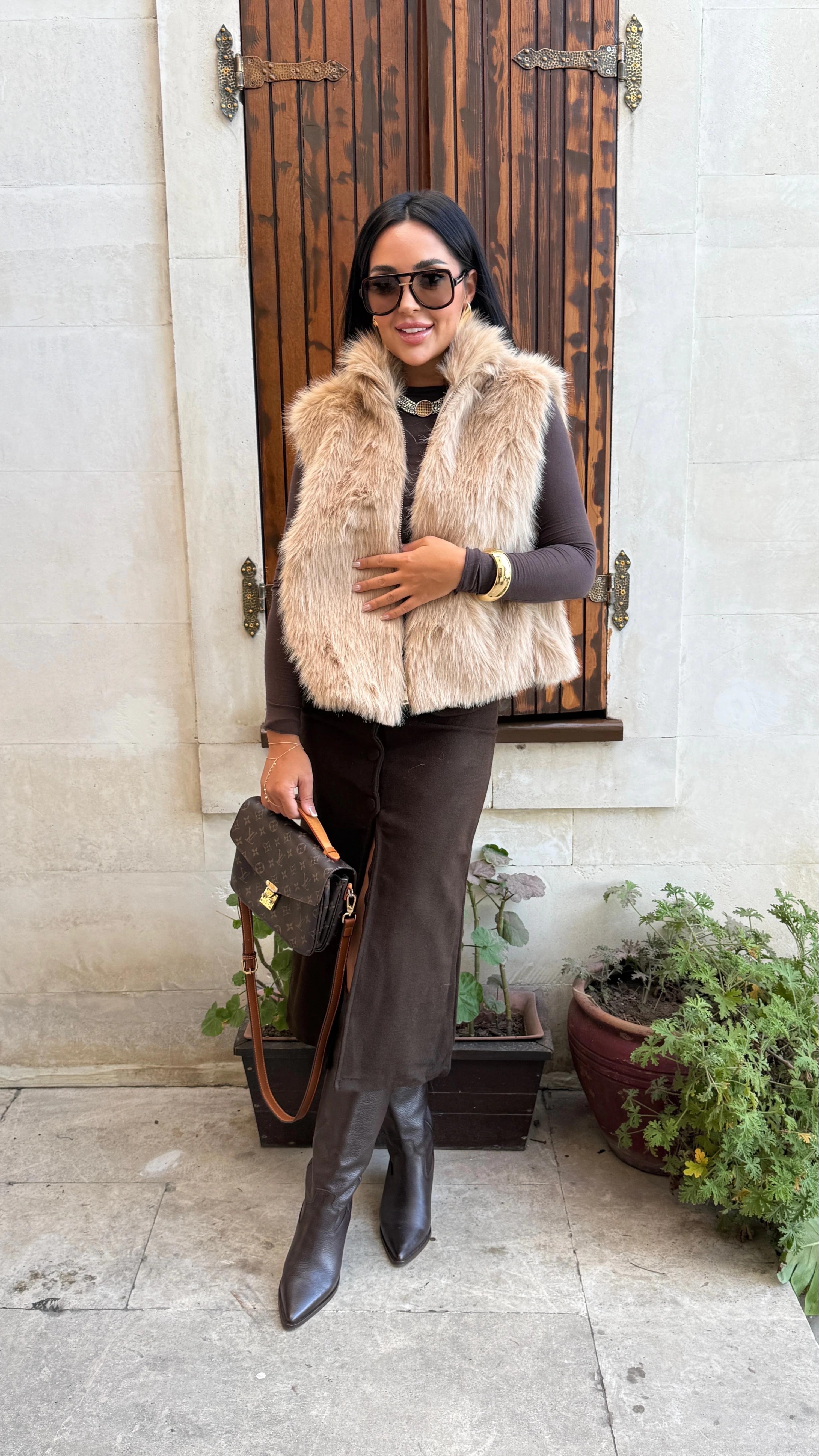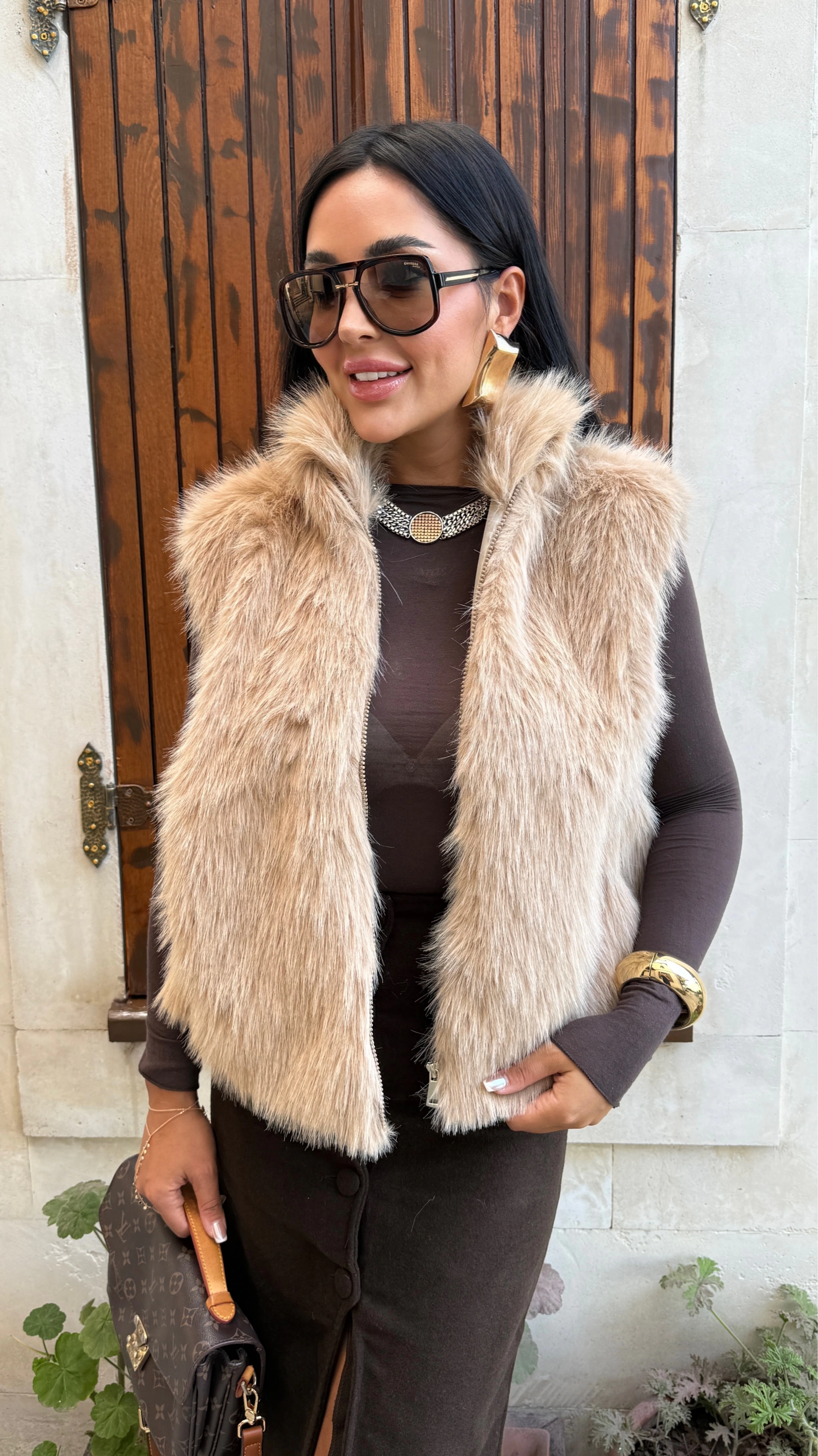 bej kürk yelek kombin