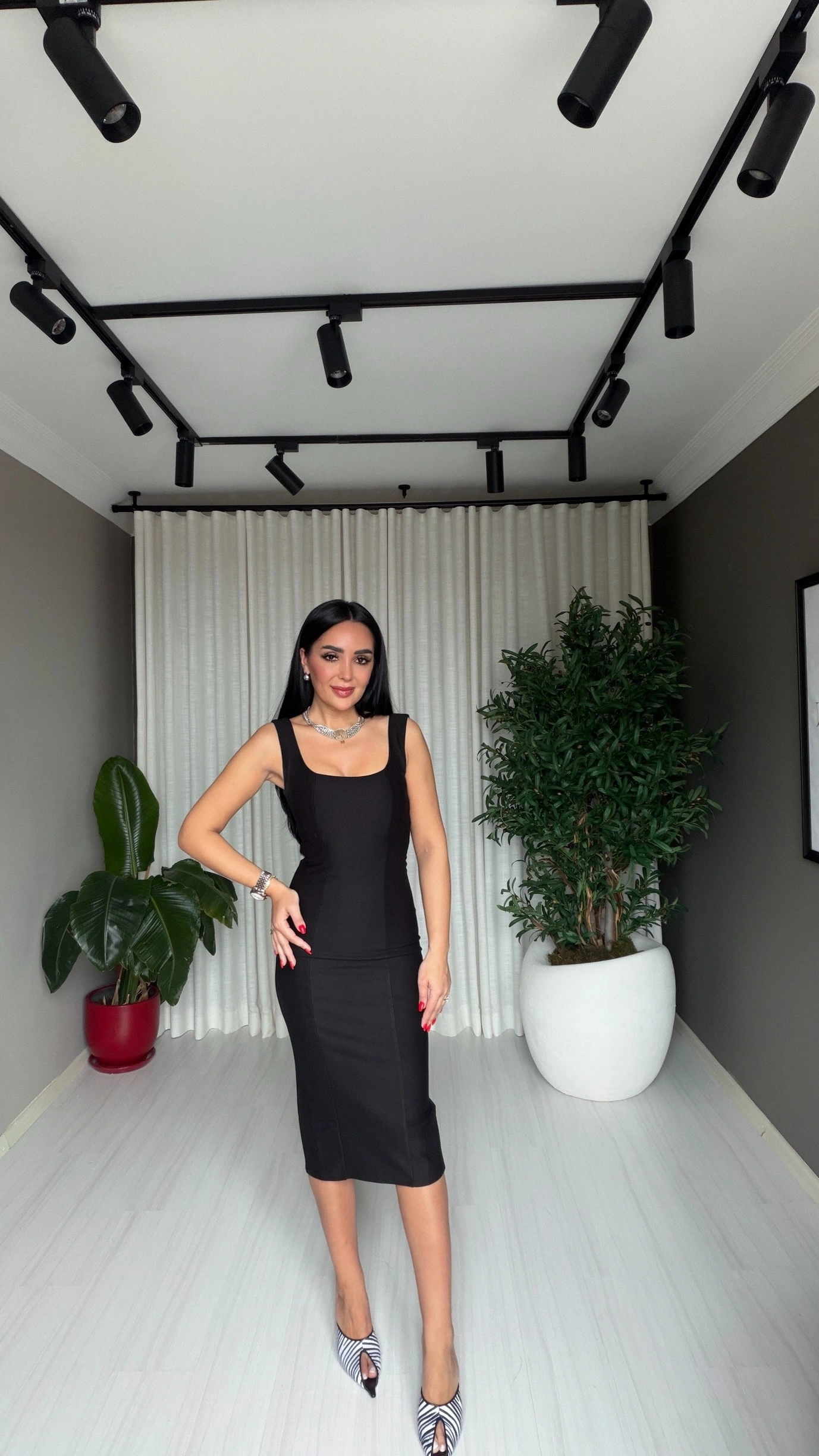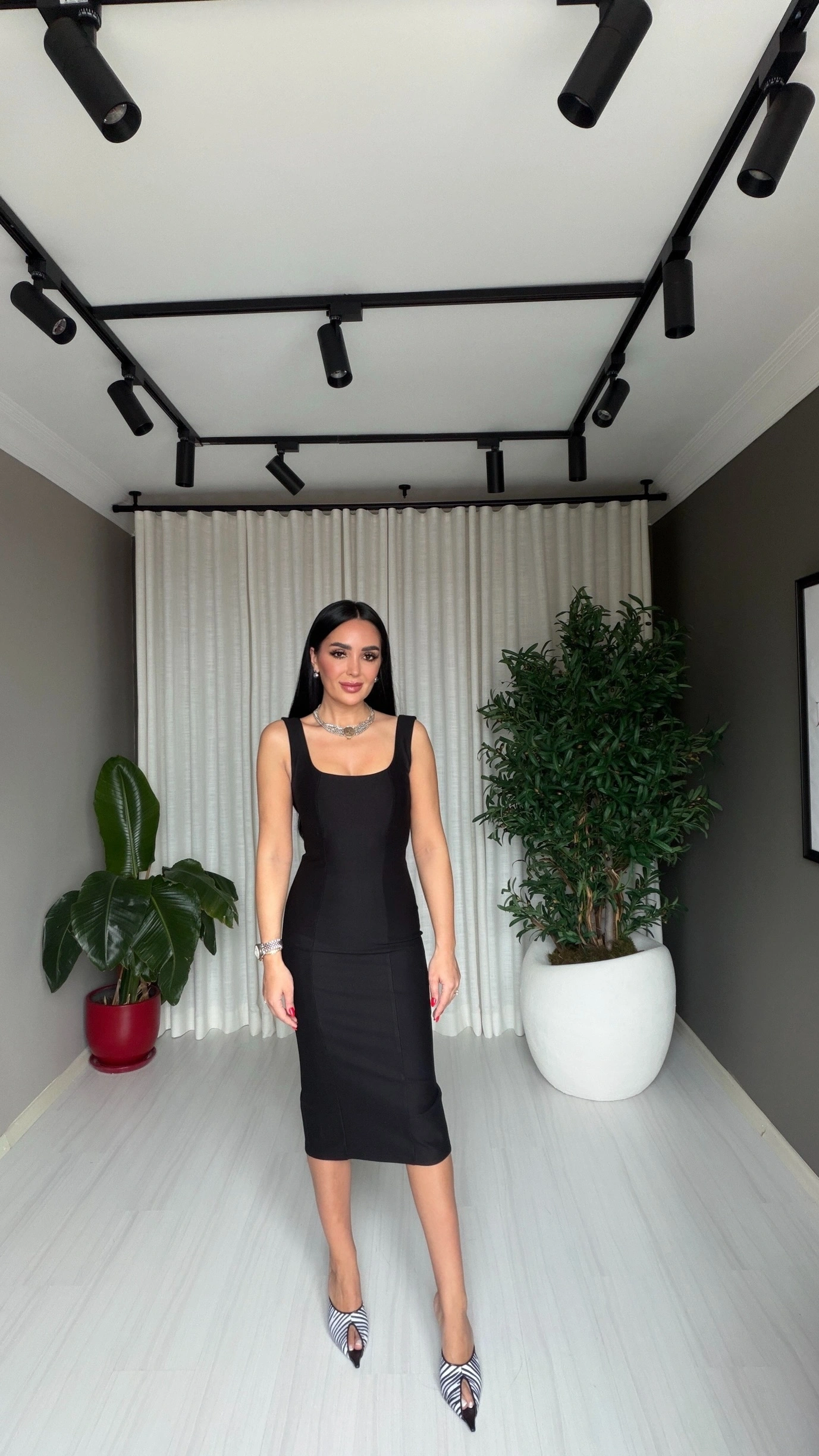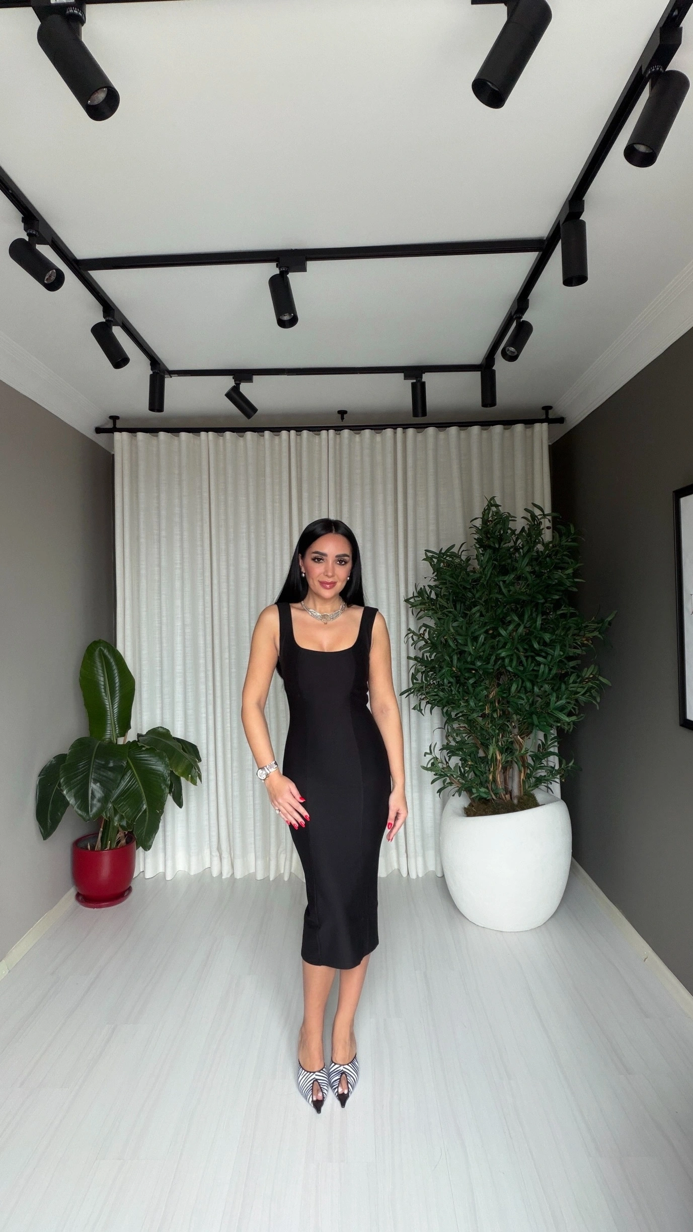 Şıklık ve rahatlığı bir arada sunan <b>likralı kare yaka midi siyah elbise</b>, sade tasarımı ve zarif duruşu ile stil sahibi kadınların gardırobunda mutlaka bulunması gereken kullanışlı ve zamansız bir parçadır.