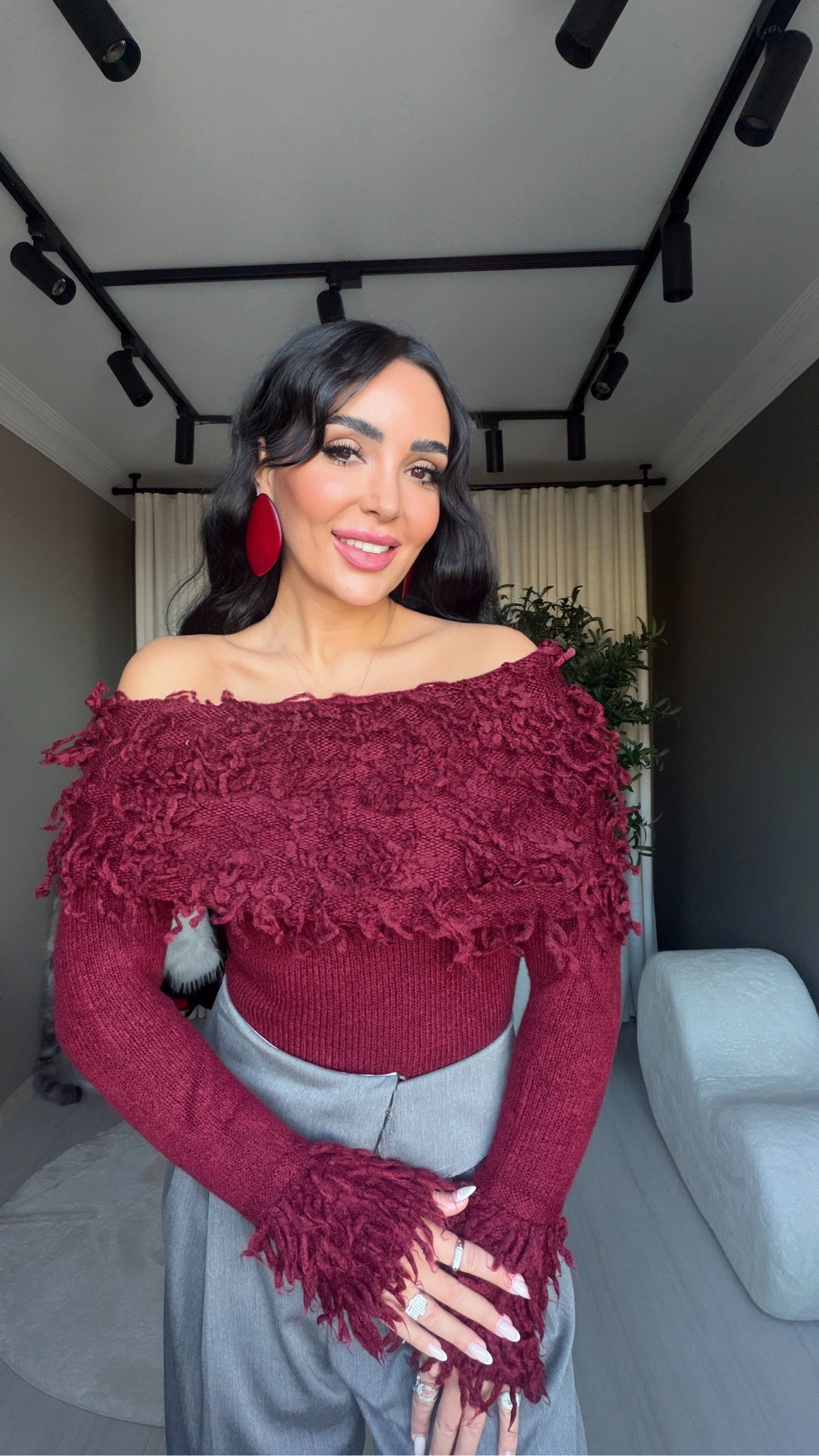 Madonna Yaka Füskül Detaylı Bordo Triko Kazak