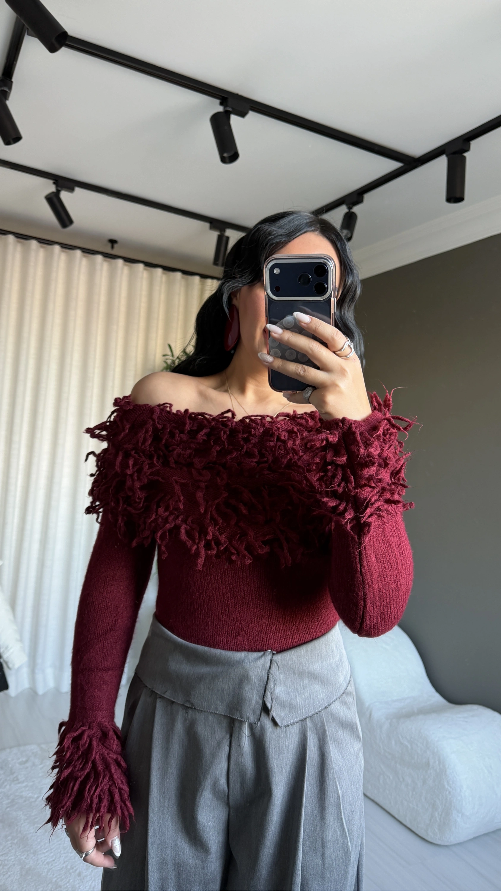 Şıklığı konforla buluşturan Madonna yaka füskül detaylı bordo triko kazak, gardırobunuzun en iddialı parçalarından biri olmaya aday ?