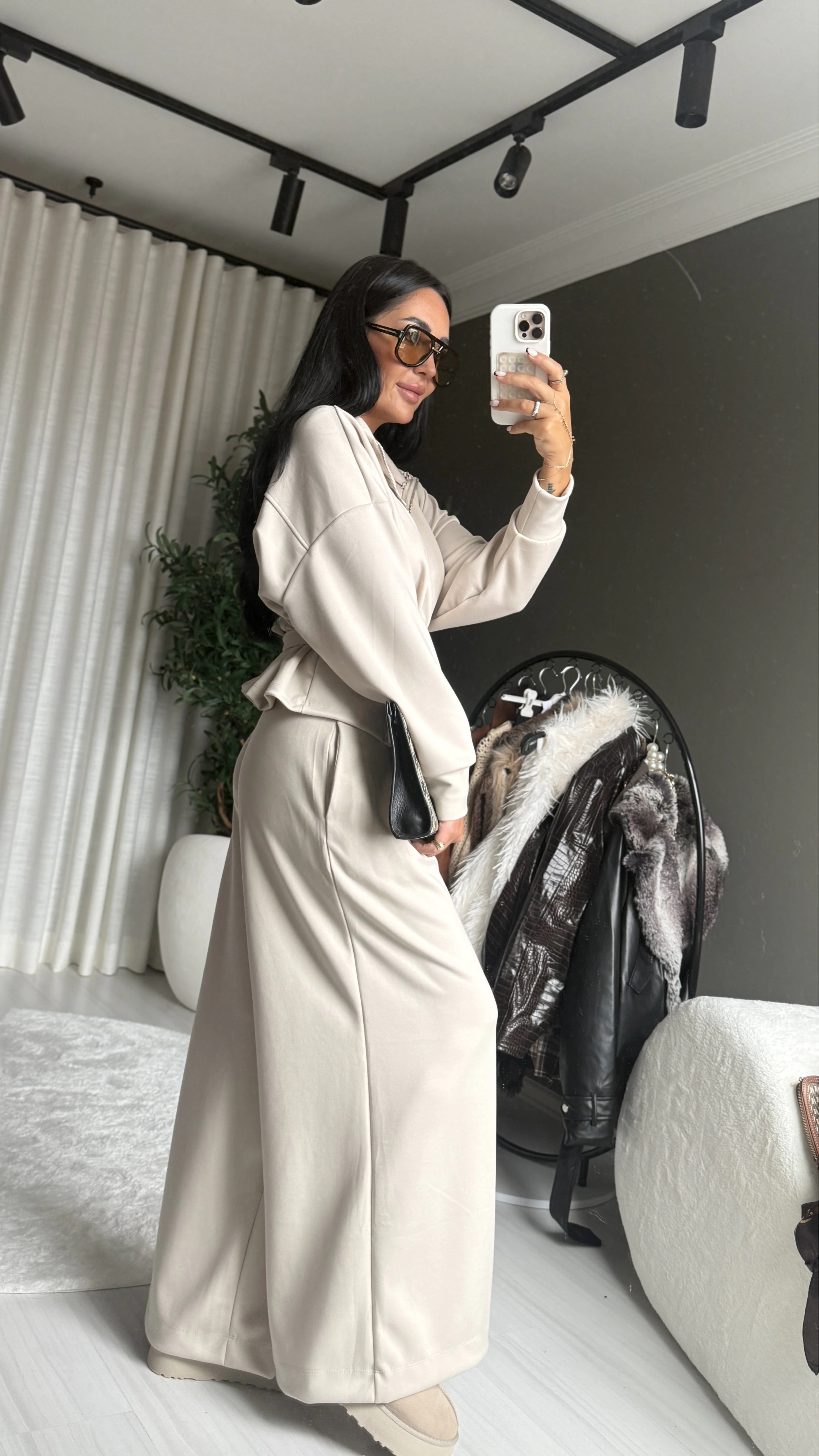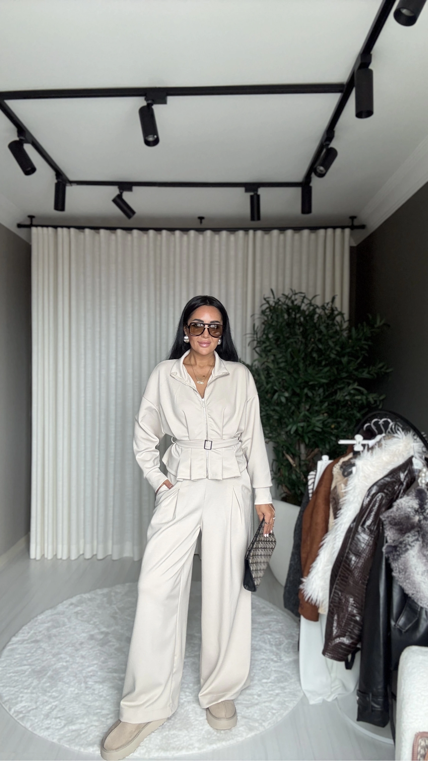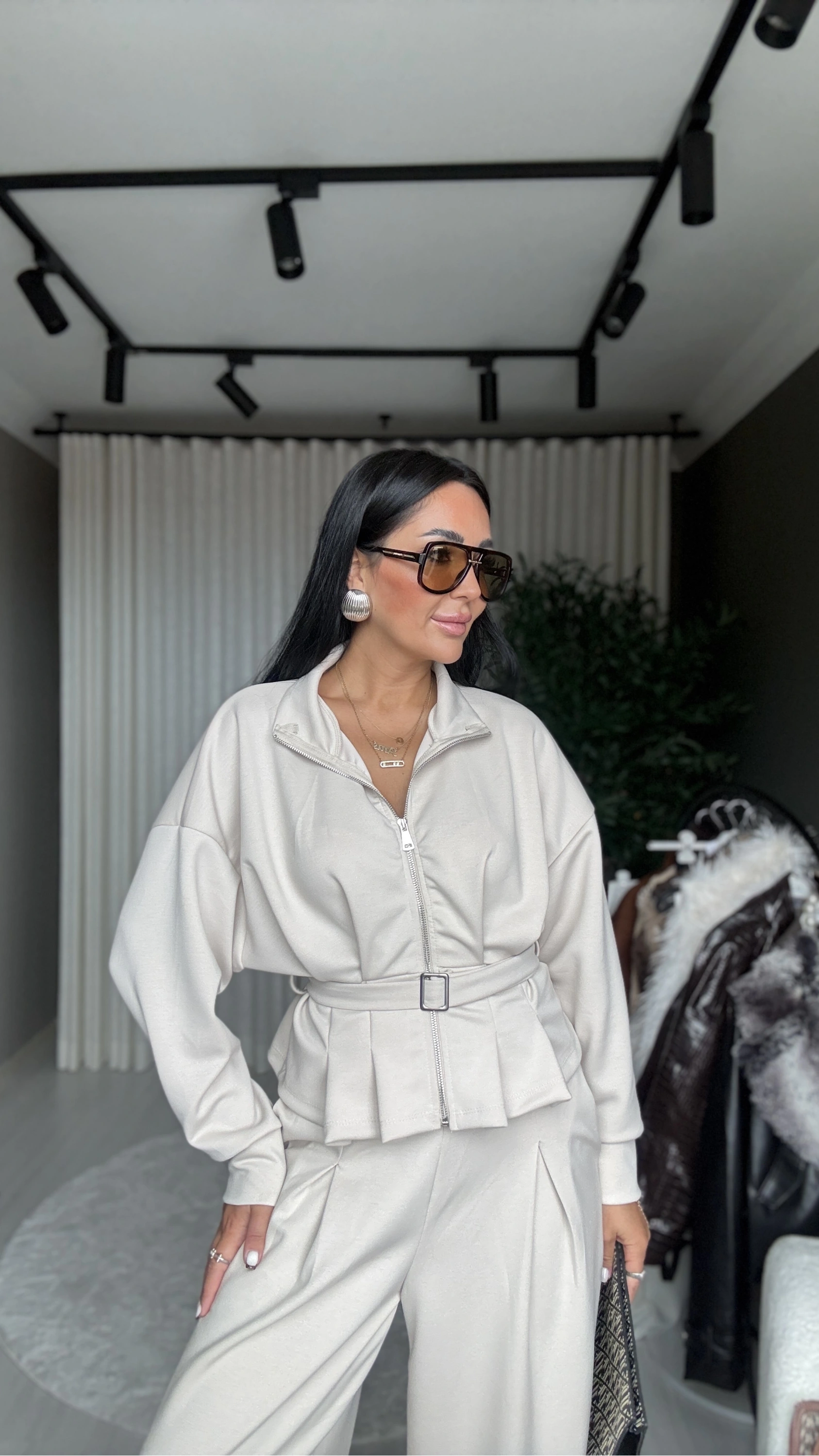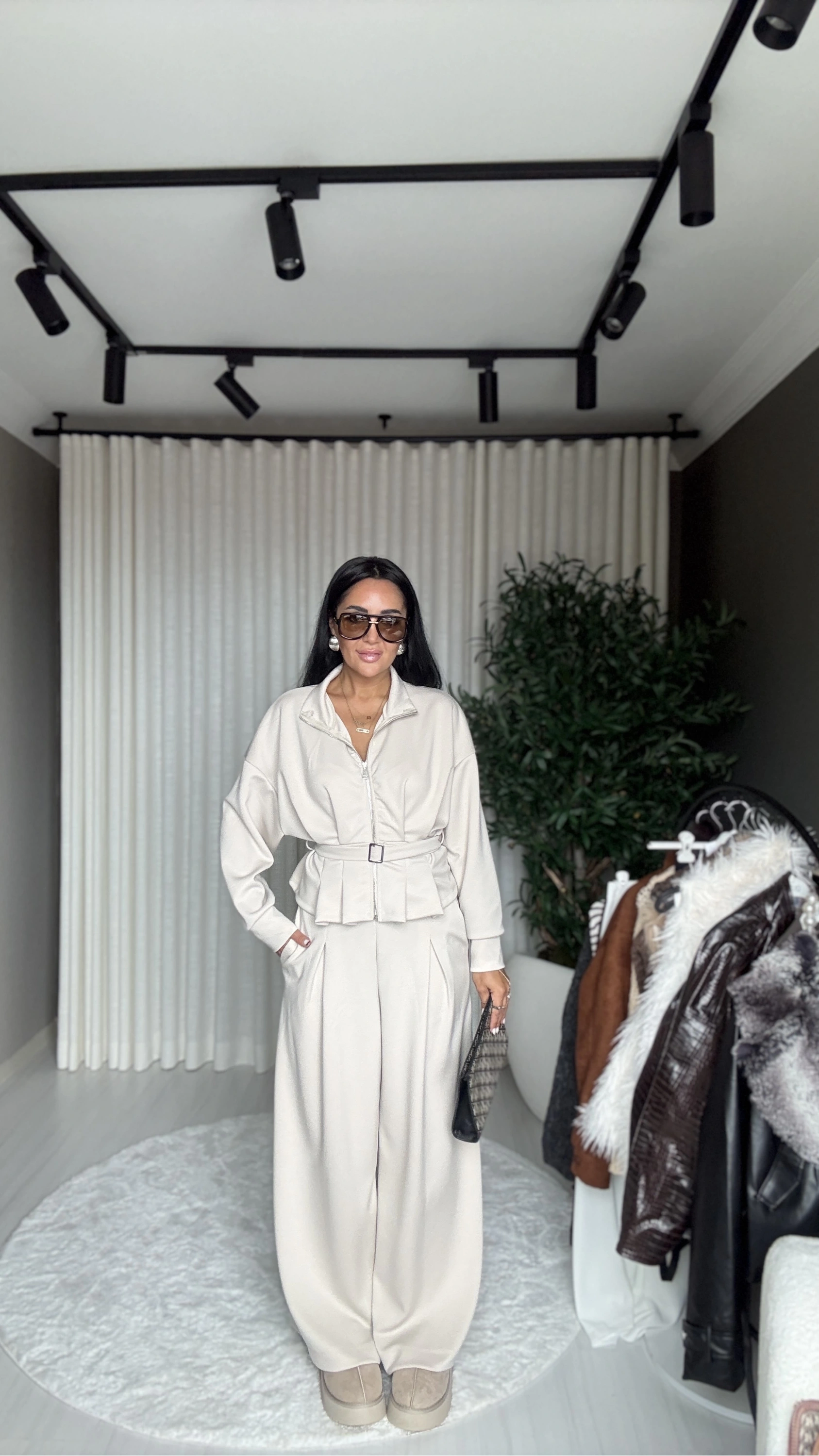 Bu modal kumaşlı, bej renkli ve kemer detaylı eşofman takımı, stilinizi “rahat ama dikkat çekici” bir şekilde tamamlayacak bir tercih.