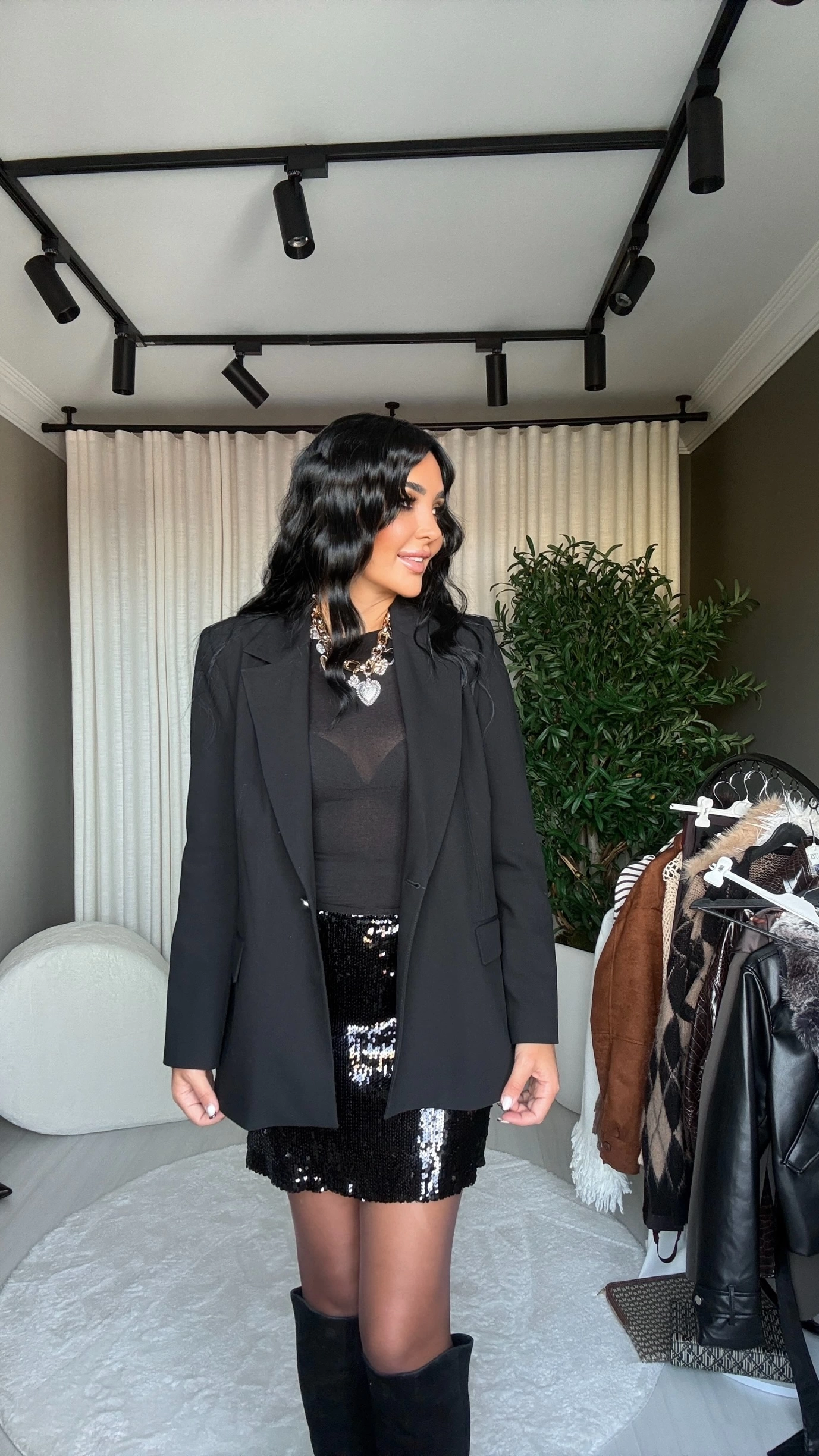 Kombi Önerisi: Siyah payetli eteğin üzerine sade bir beyaz gömlek ya da monokrom bir siyah üst ile kombin yapılabilir. Yüksek topuklu ayakkabı ya da şık stiletto ile tamamlanması önerilir. Ayrıca metalik aksesuarlarla parıltısını destekleyebilirsiniz. Beymen Blog