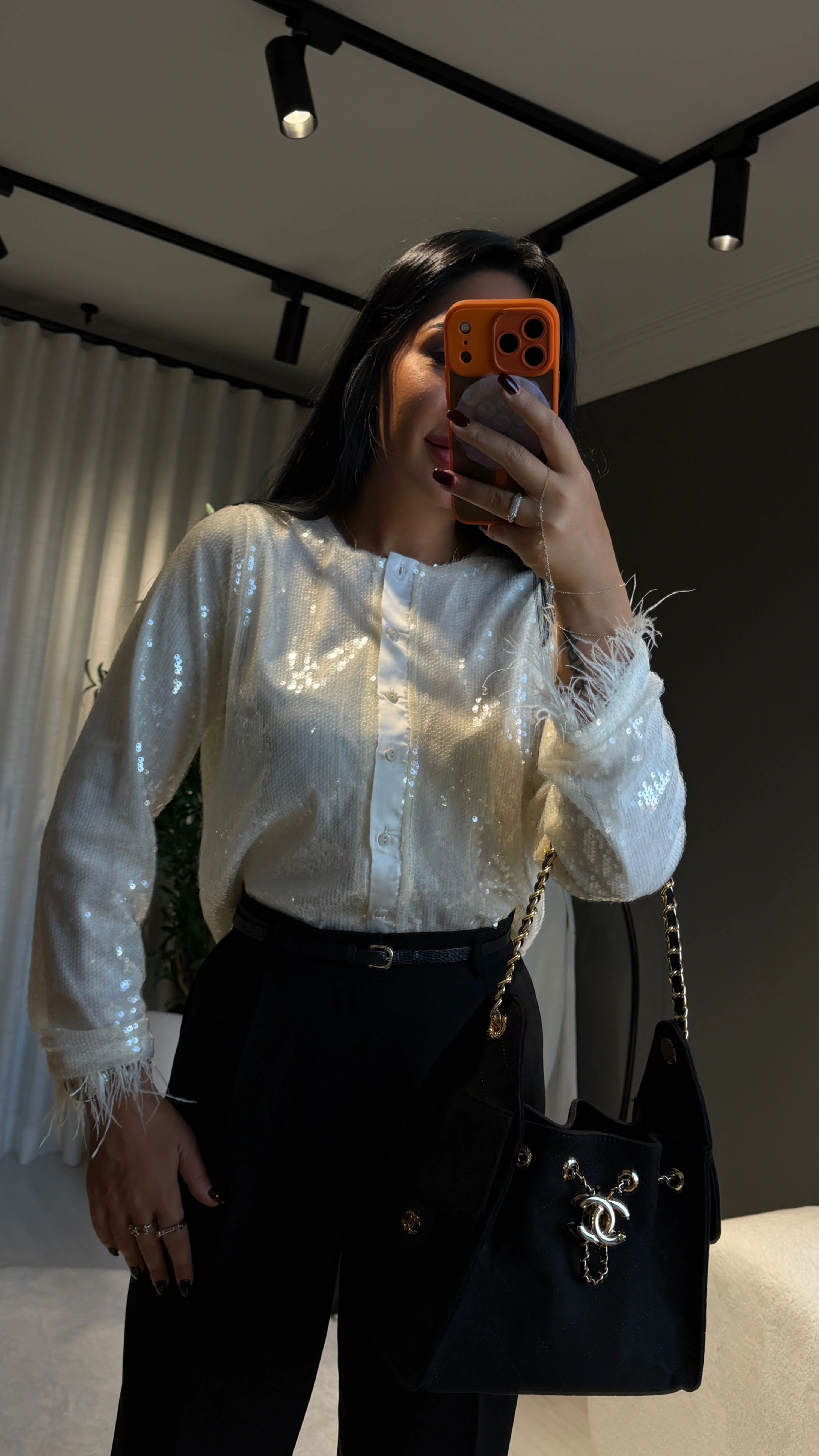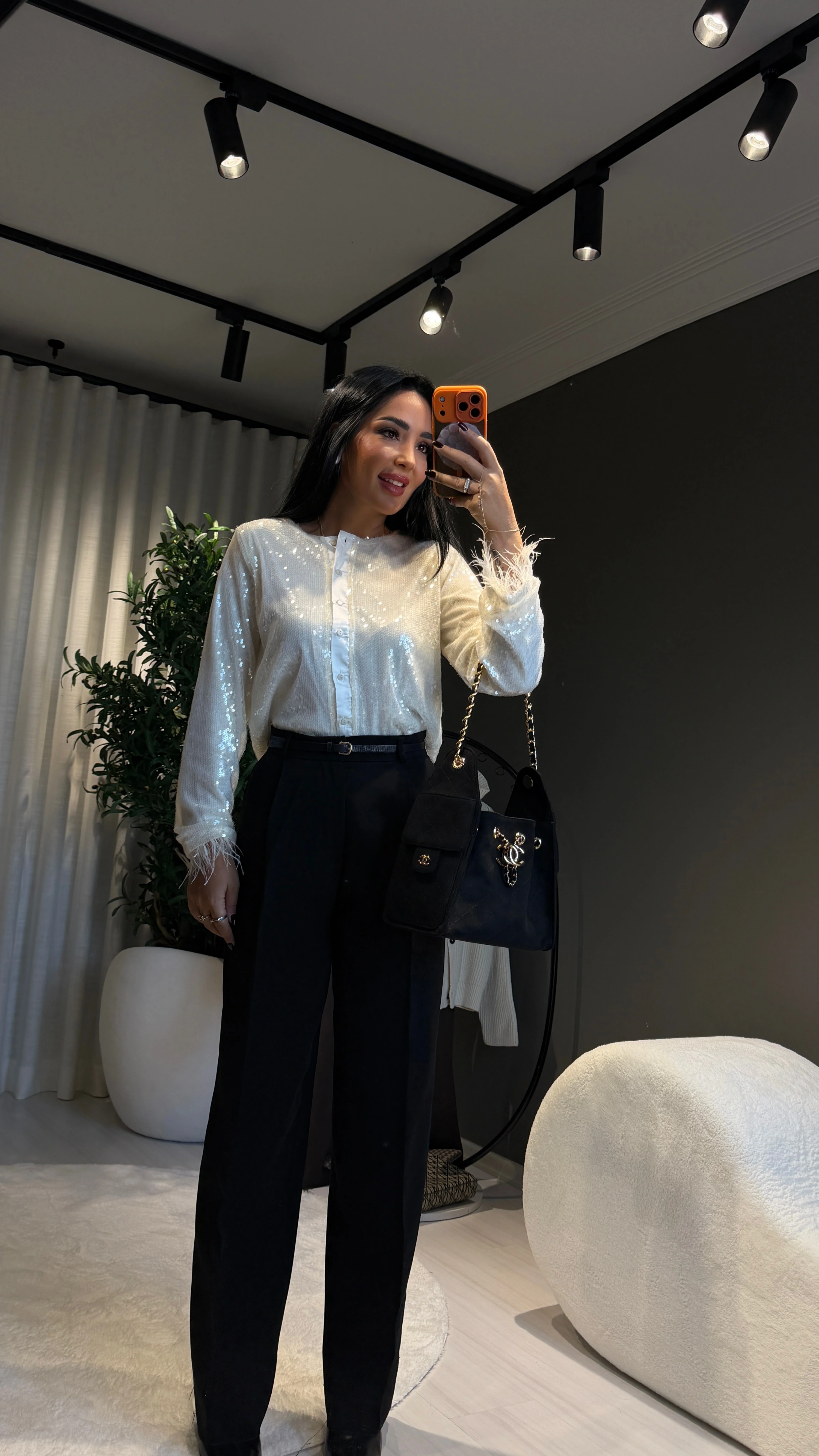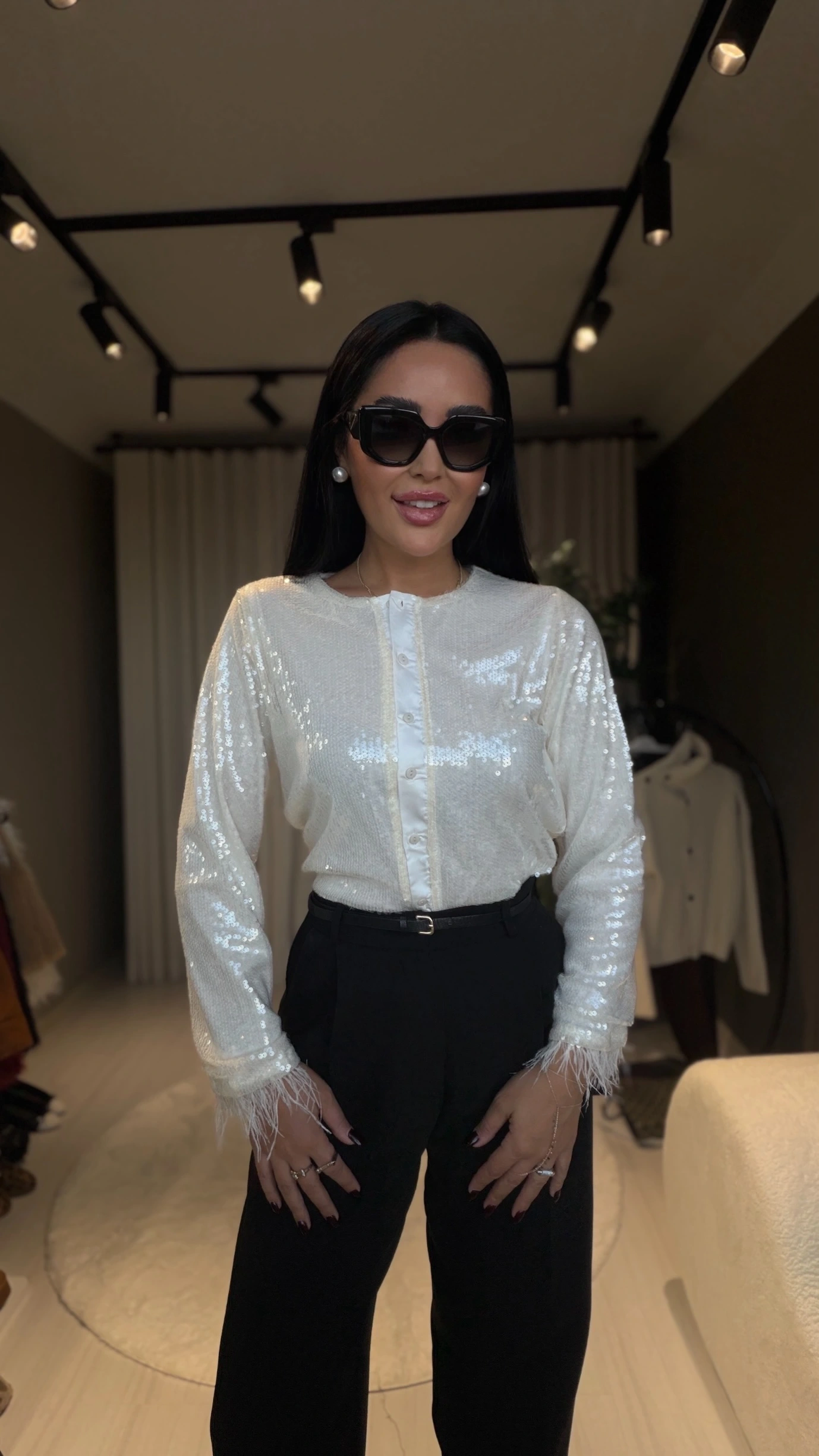 Bu payetli otriş detaylı beyaz ceket, zarafeti ve ışıltıyı bir arada sunan eşsiz bir parça. Beyaz tonuyla hem saf hem lüks bir his yaratırken, payet işlemeleri ışığa vurduğunda büyüleyici bir ışıltı sunar. Otriș (şal) yaka detayı sayesinde ceket, klasik blazer formlarından farklı olarak daha yumuşak ve zarif bir siluetle karşınıza çıkar.