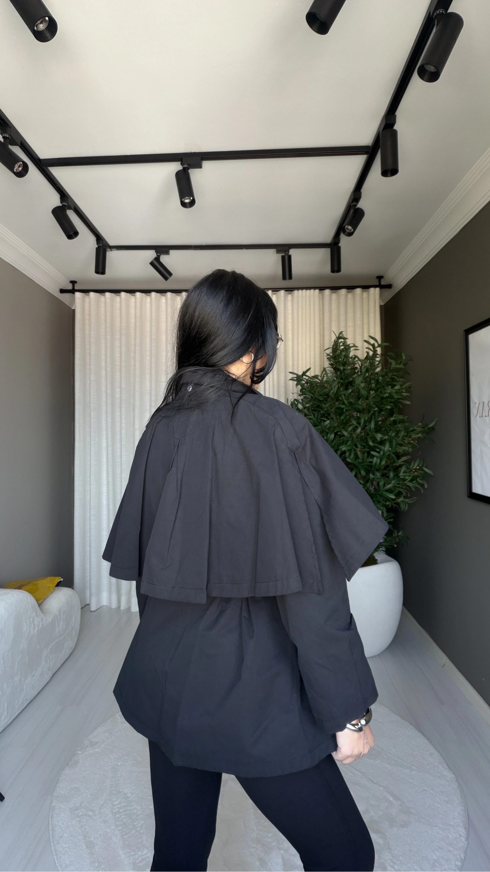 ? Pelerin Detaylı Kısa Siyah Trençkot – Modern Şıklığın Güçlü Yorumu ?