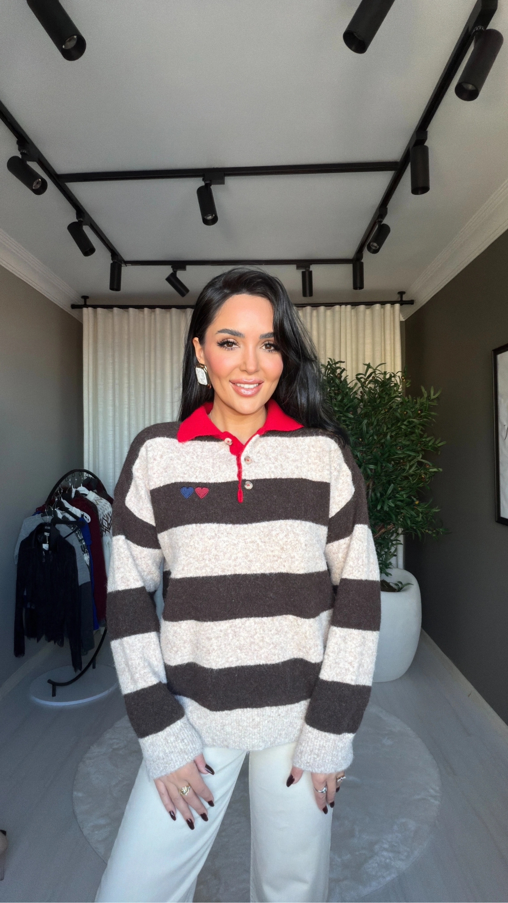 Polo Yaka Kalp Nakışlı Kahveli Bejli Kazak, zarif detayları ve modern tasarımıyla hem günlük hem de şık kombinlerin vazgeçilmezi olacak! Yumuşak dokulu kumaşı, gün boyu konfor sunarken cildinizde hoş bir his bırakır.