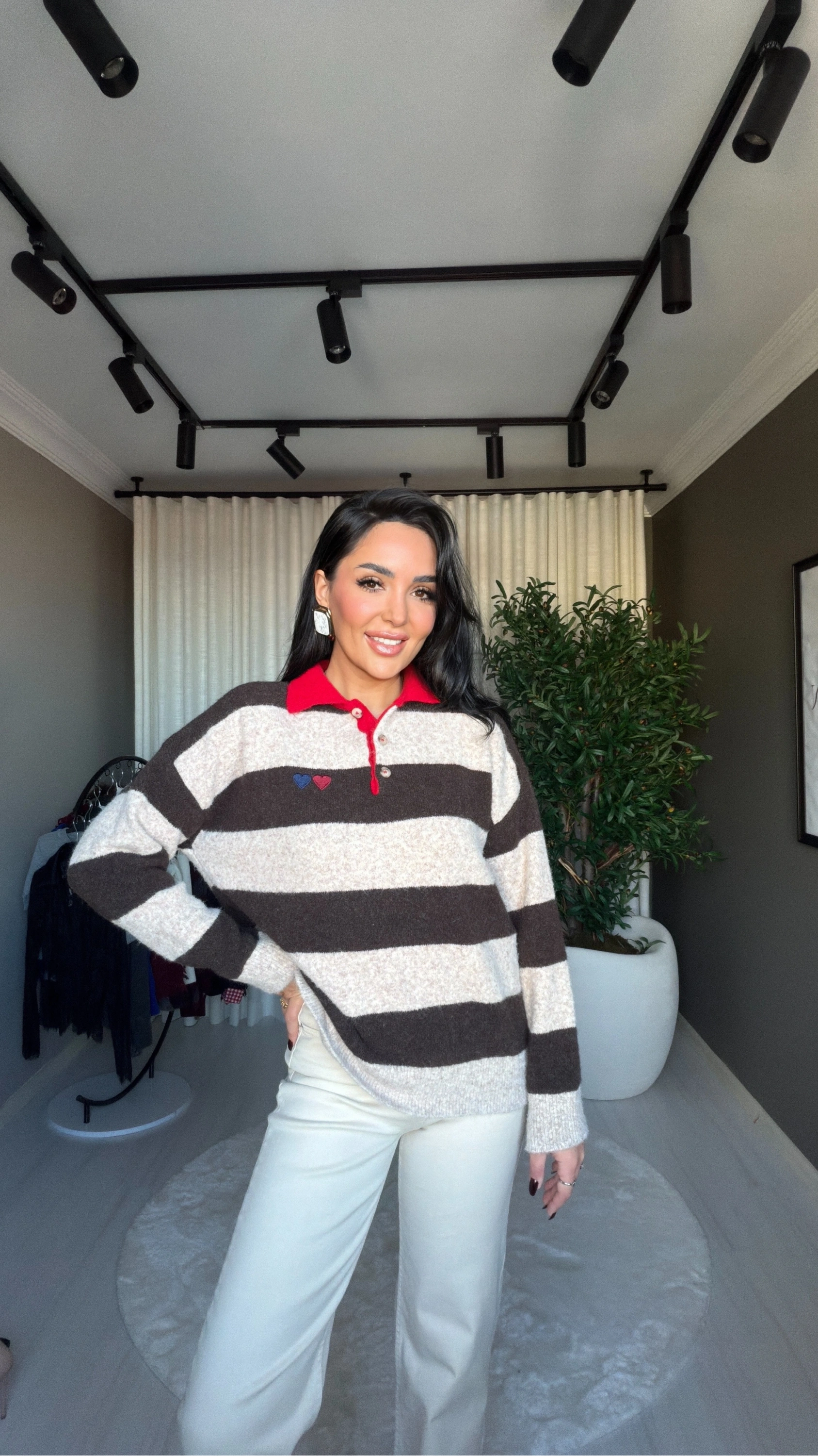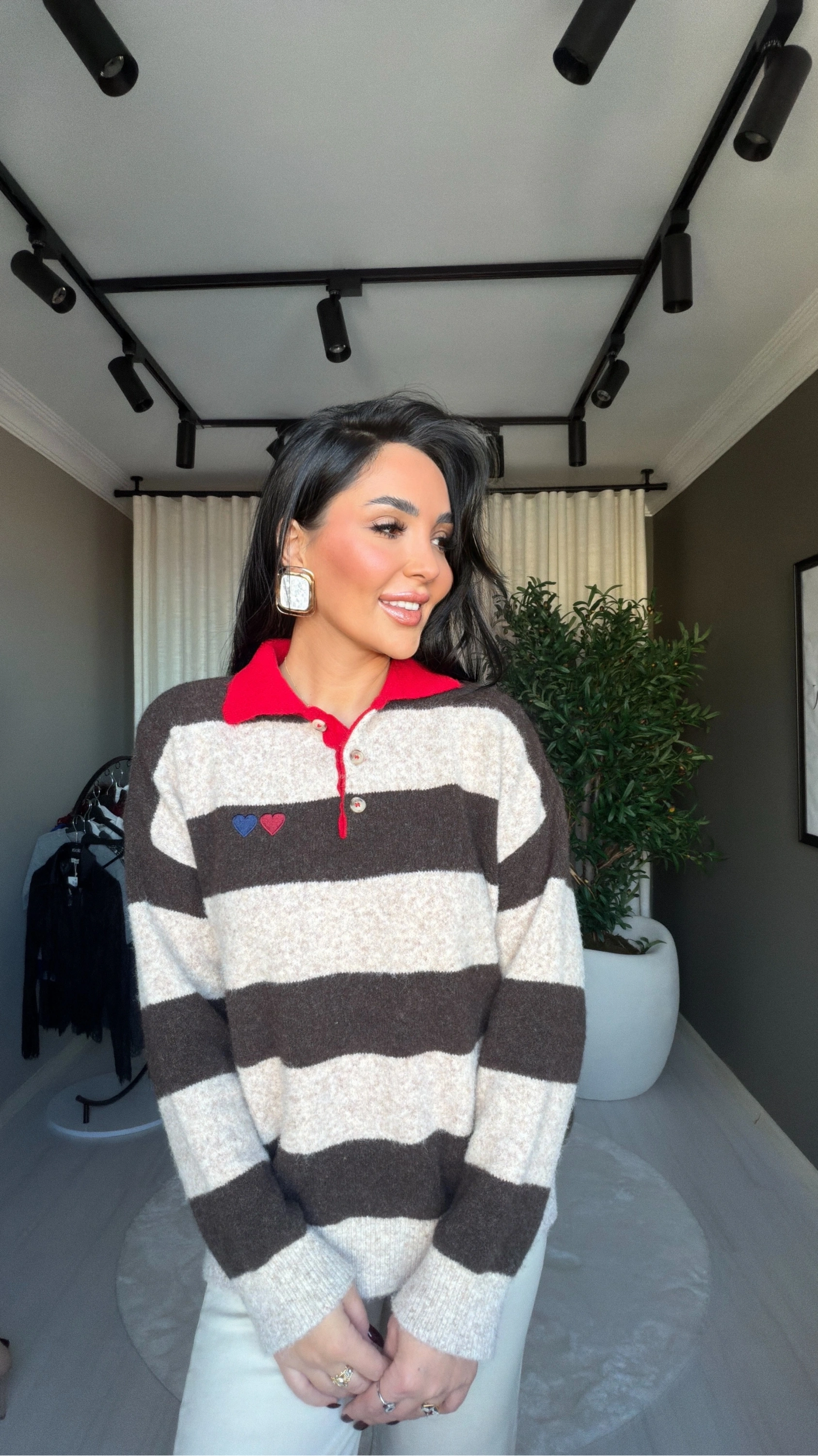 Polo yaka tasarımı, klasik ve şık bir duruş kazandırırken, kalp nakış detayı kazak modeline romantik ve özgün bir dokunuş katar. Kahveli ve bej tonlarının uyumu, zamansız ve kolay kombinlenebilir bir stil oluşturur.