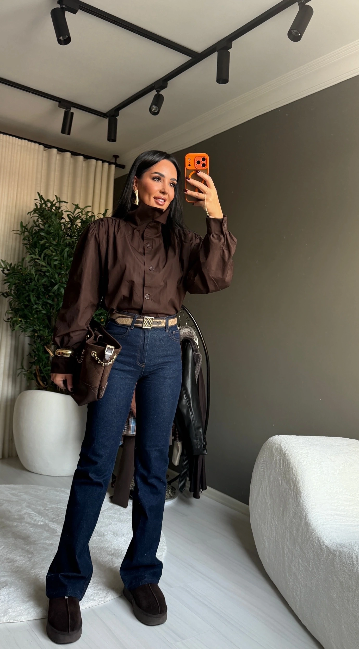 Poplin kumaş dik yaka kahverengi gömlek