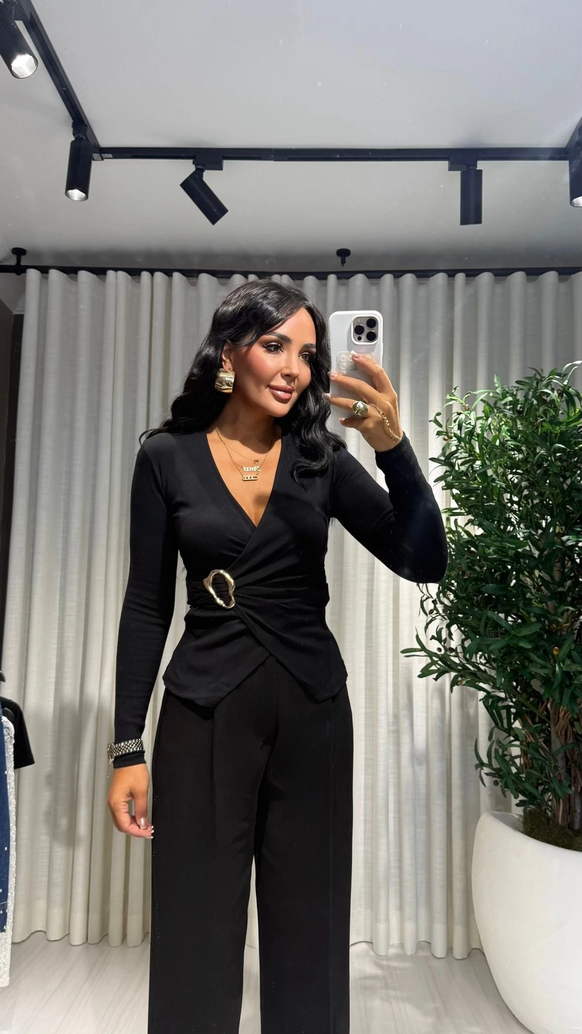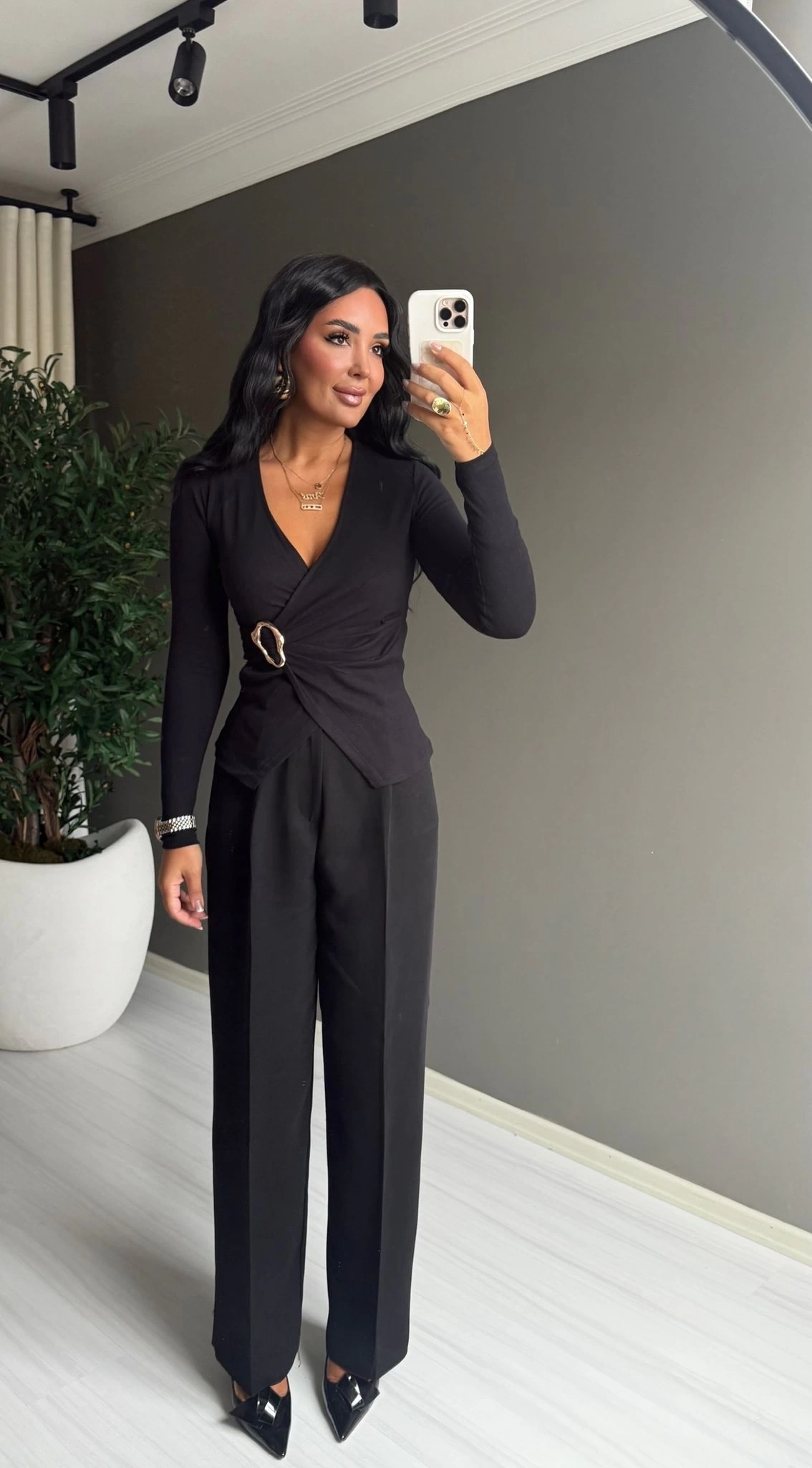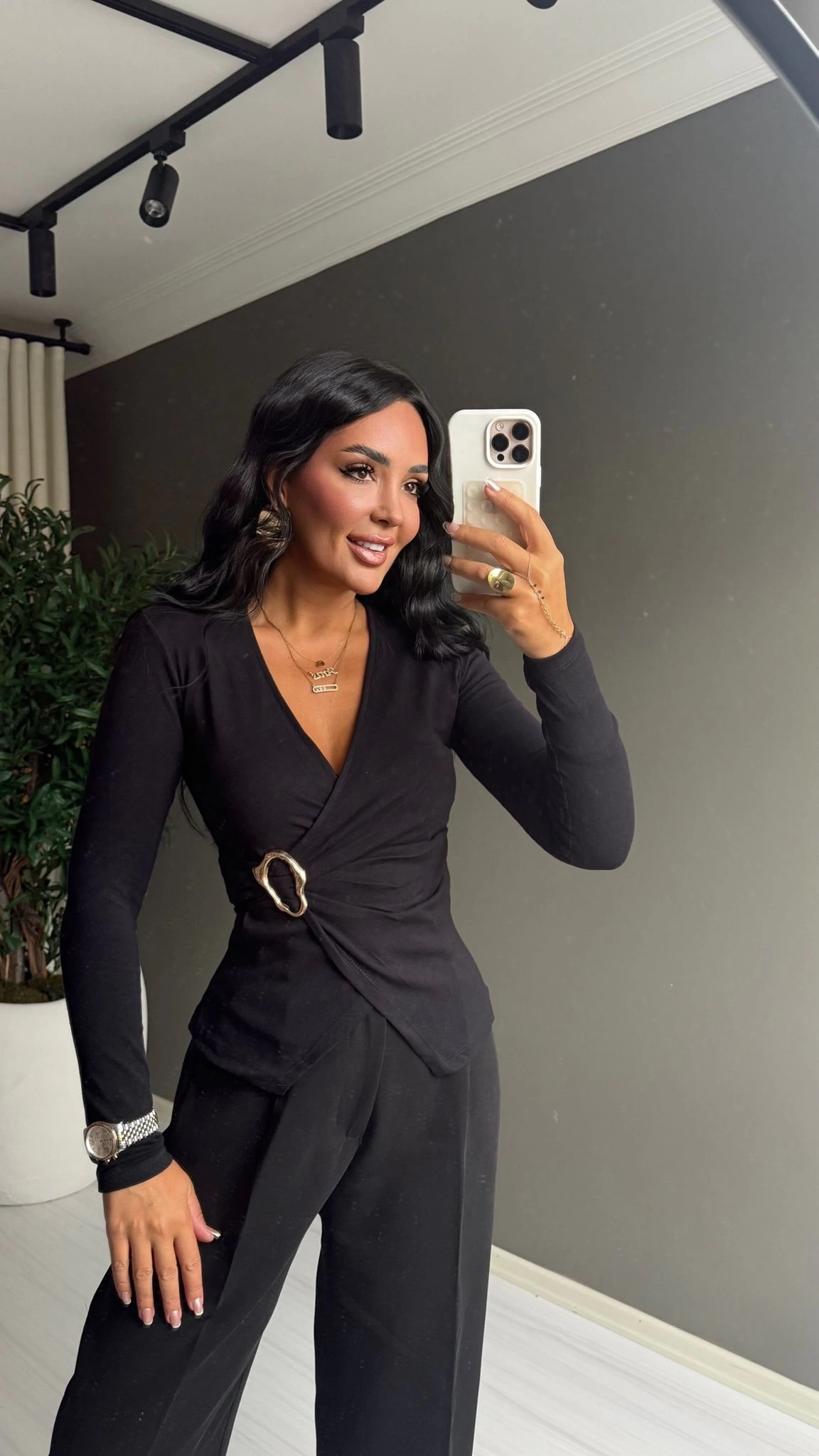 Qu Siyah Kruvaze Yaka Toka Detaylı Uzun Kollu Body