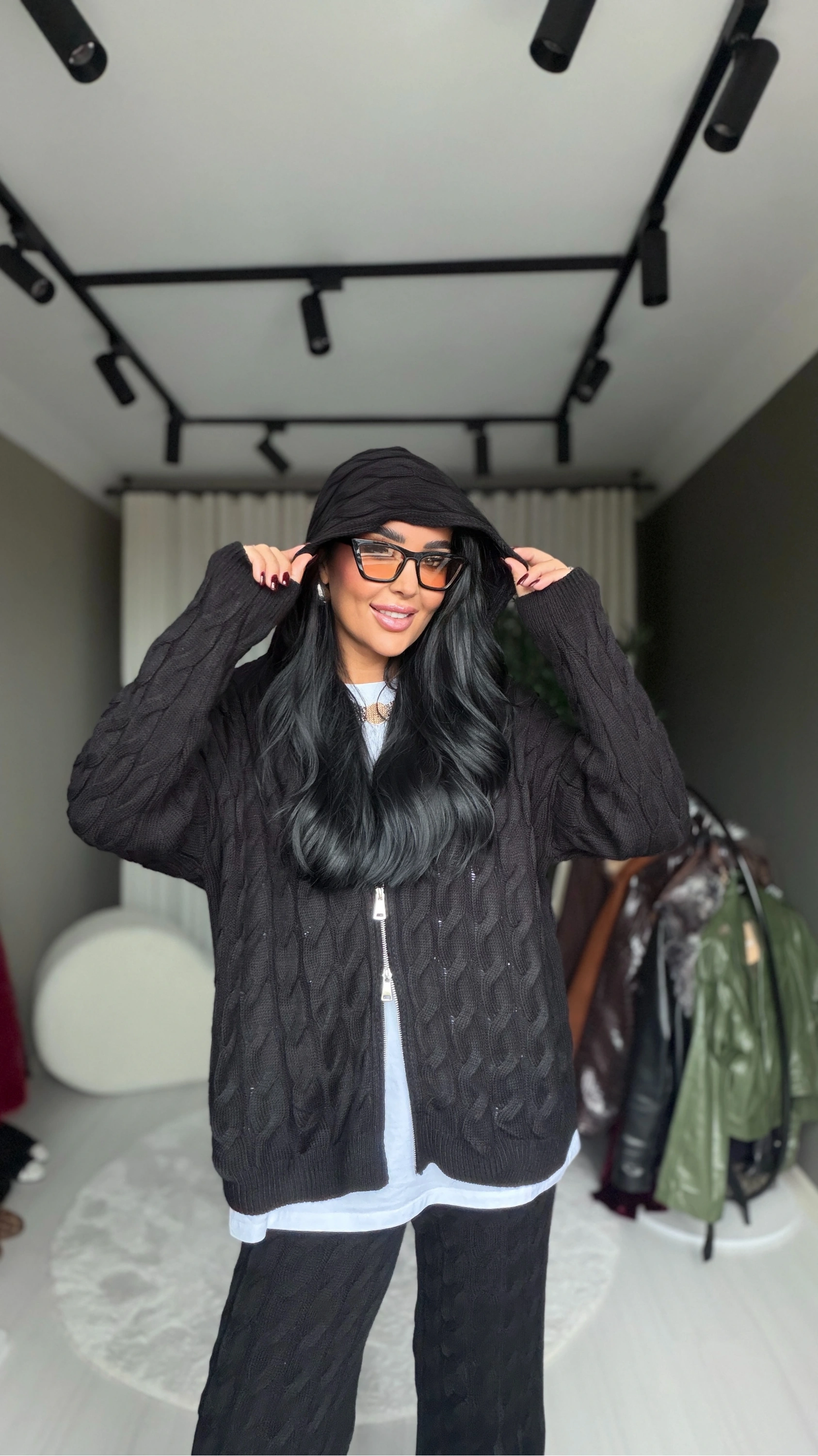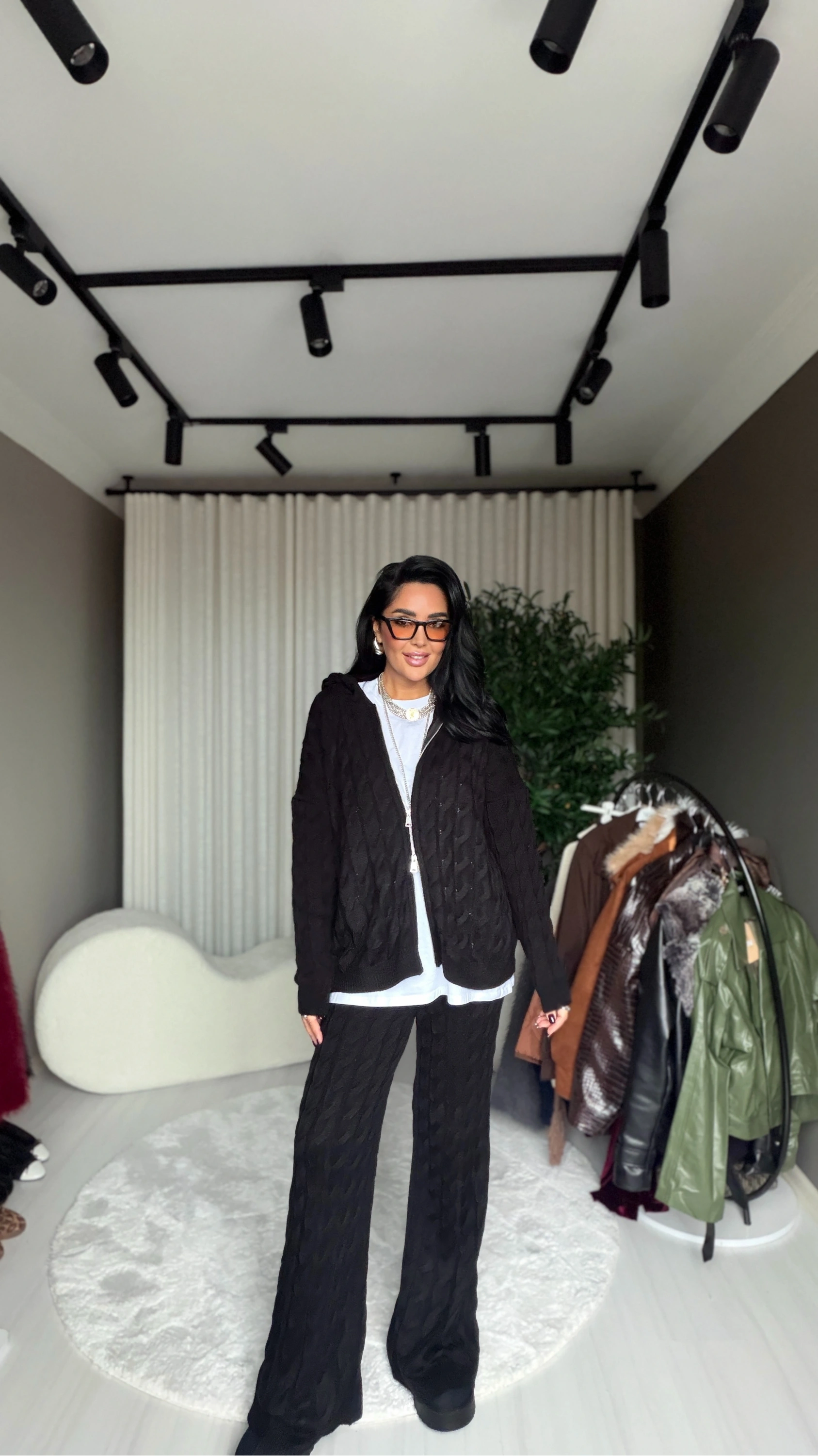 Bu siyah takım, modern ve sportif bir tarzı zarafetle birleştiriyor. Üst parça fermuarlı, alt parça ise rahat bir kesime sahip — böylece günlük kullanımda hem şık hem konforlu bir görünüm sunar.