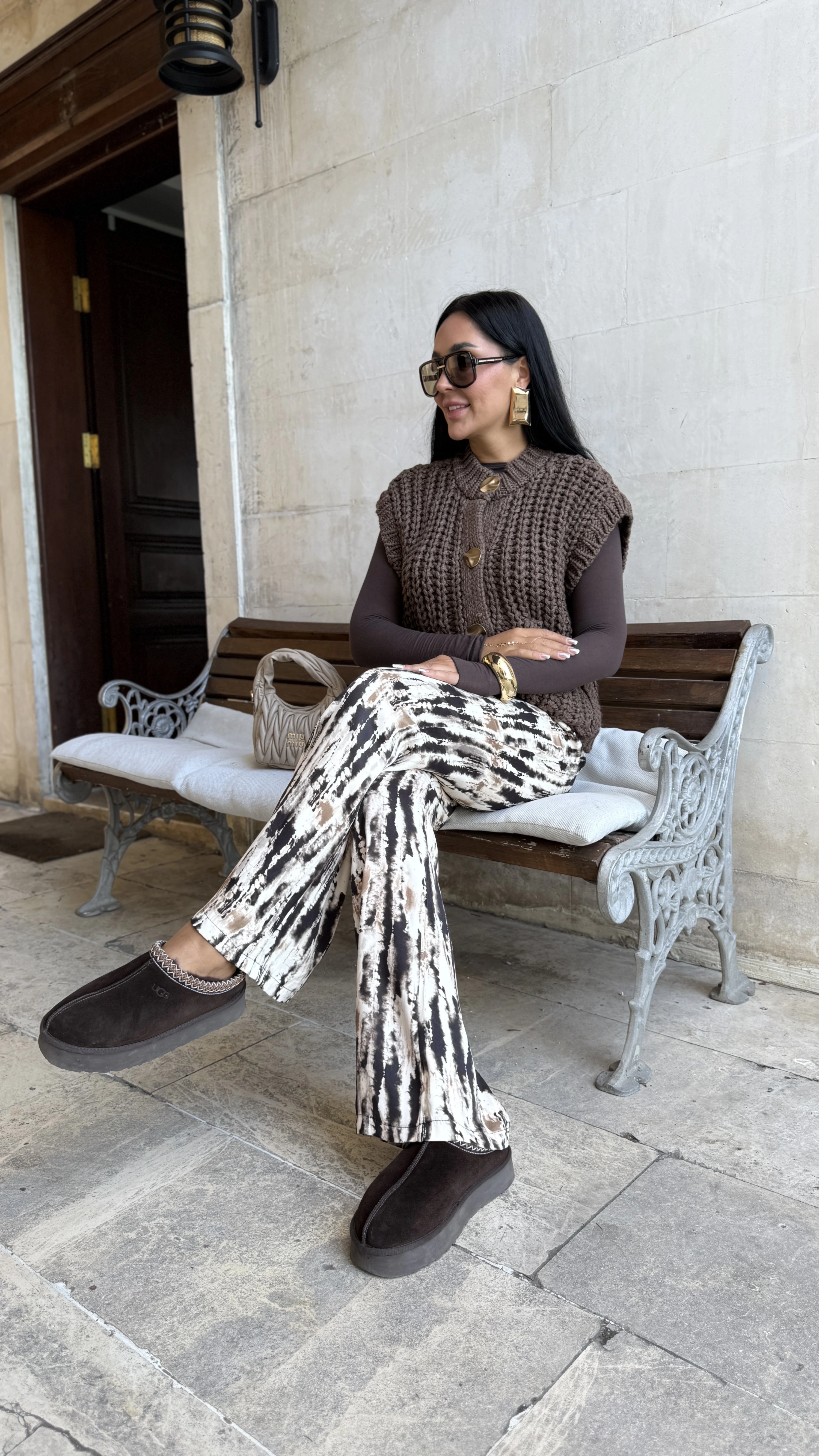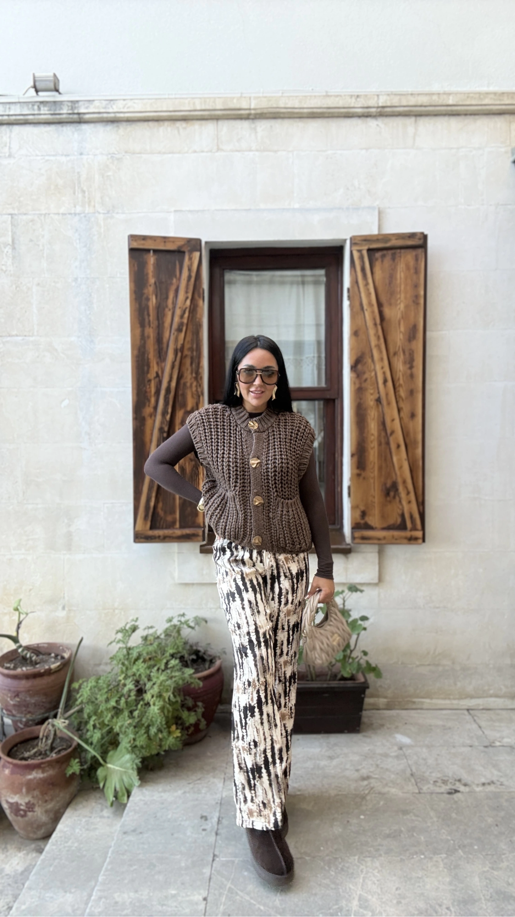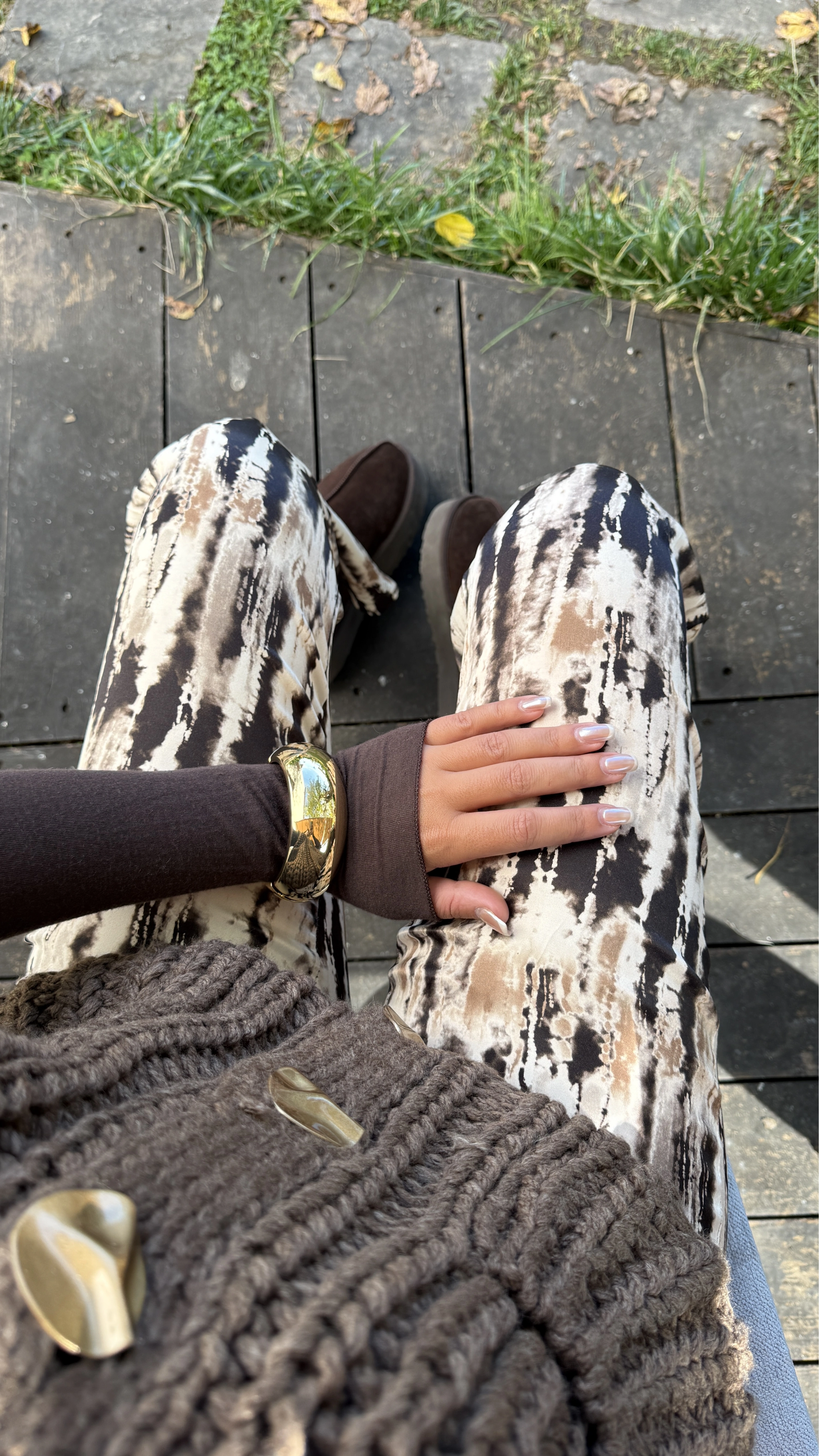 Bu desenli saten İspanyol paça pantolon, gardırobunuza anında şıklık ve hareket kazandırıyor. Akıcı saten kumaşı ve özgün desen detaylarıyla hem gündüz hem de akşam kombinlerinde parlayacak bir parça.