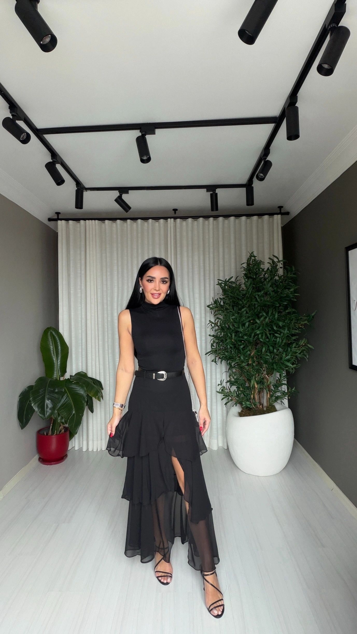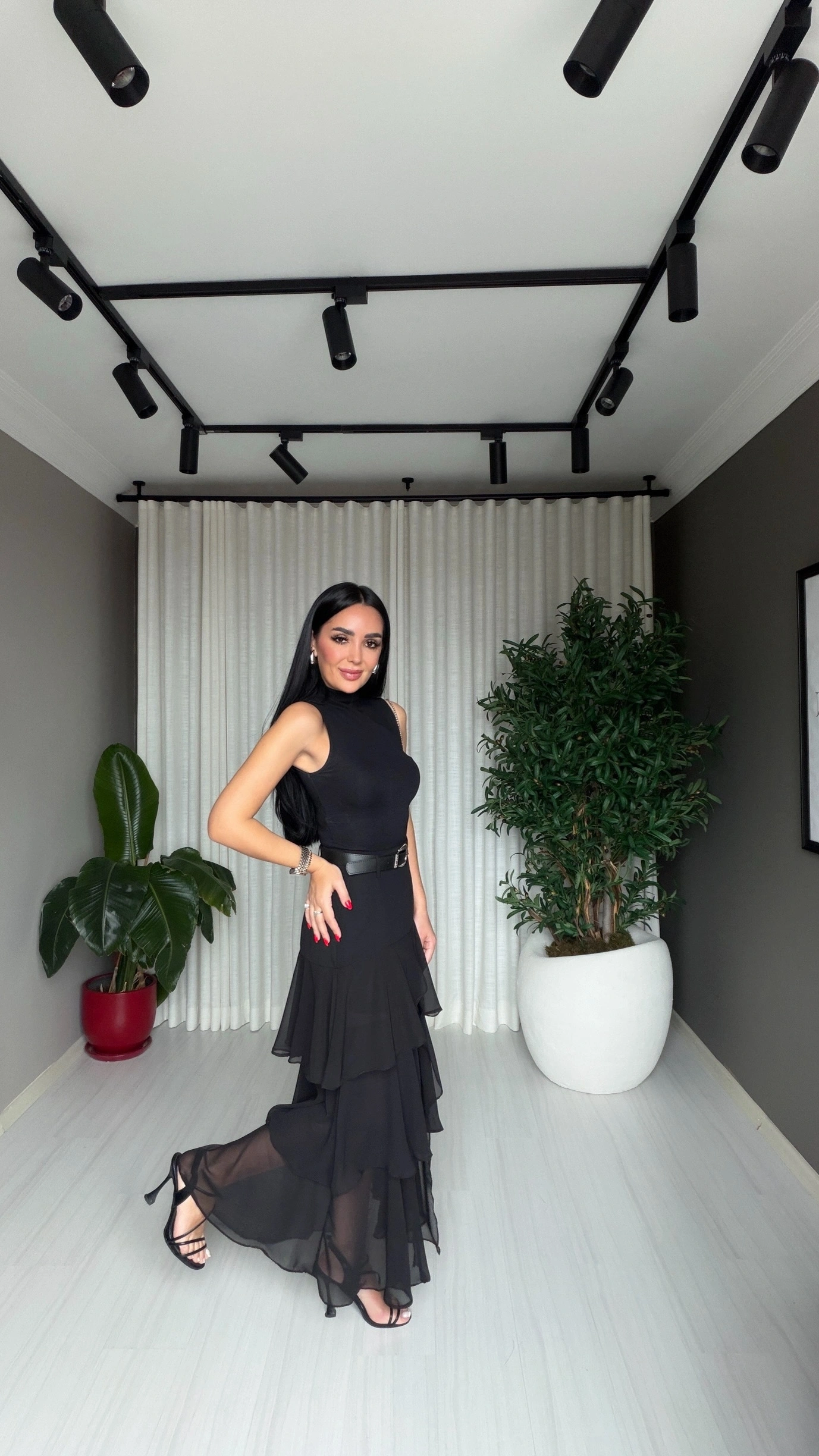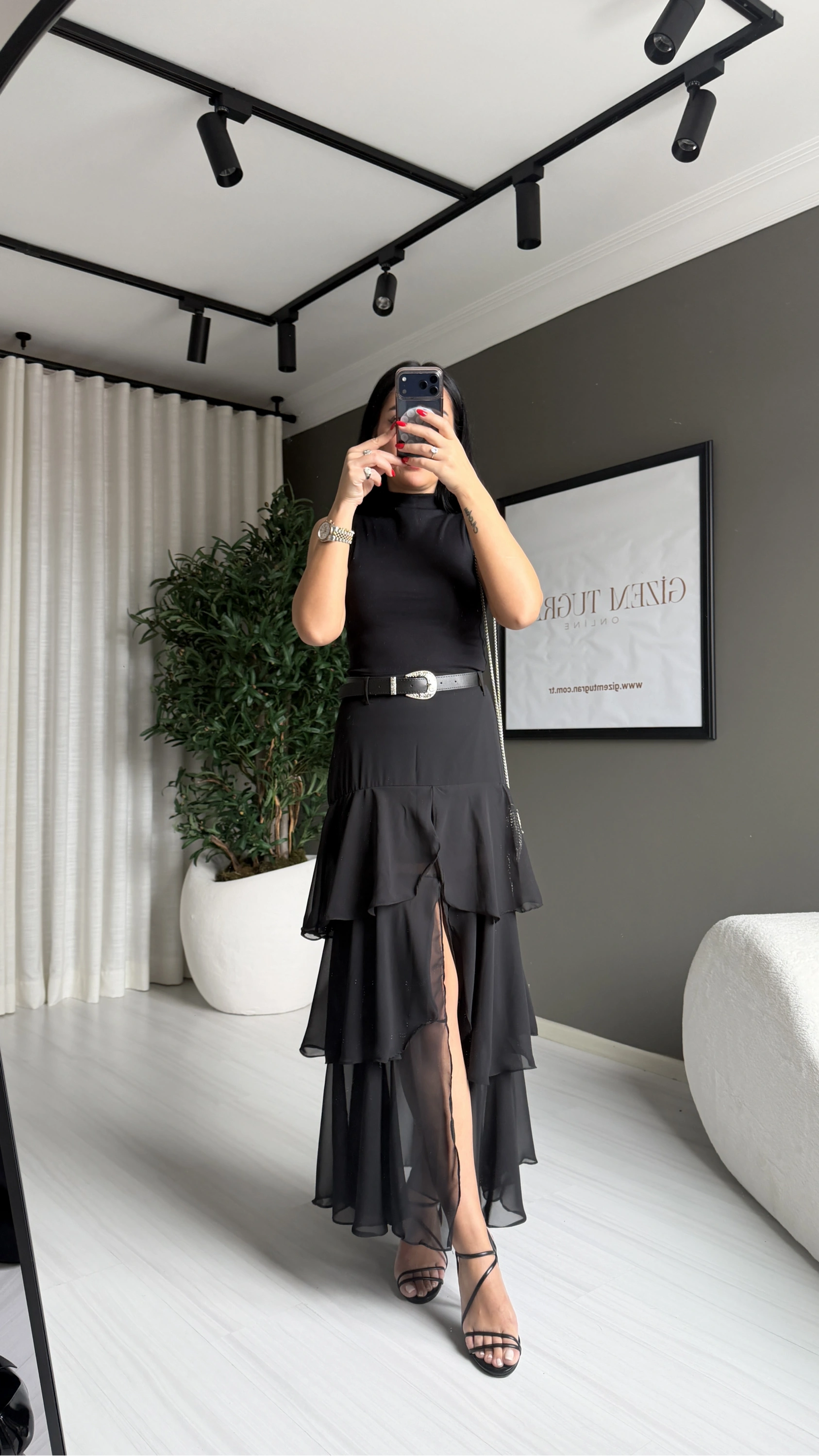 Şık, zarif ve göz alıcı tasarımıyla öne çıkan <b>şifon kat kat önden yırtmaçlı siyah uzun elbise</b>, özel davetlerde, gece organizasyonlarında ve kutlamalarda stilinizi ön plana çıkaracak etkileyici bir parçadır.