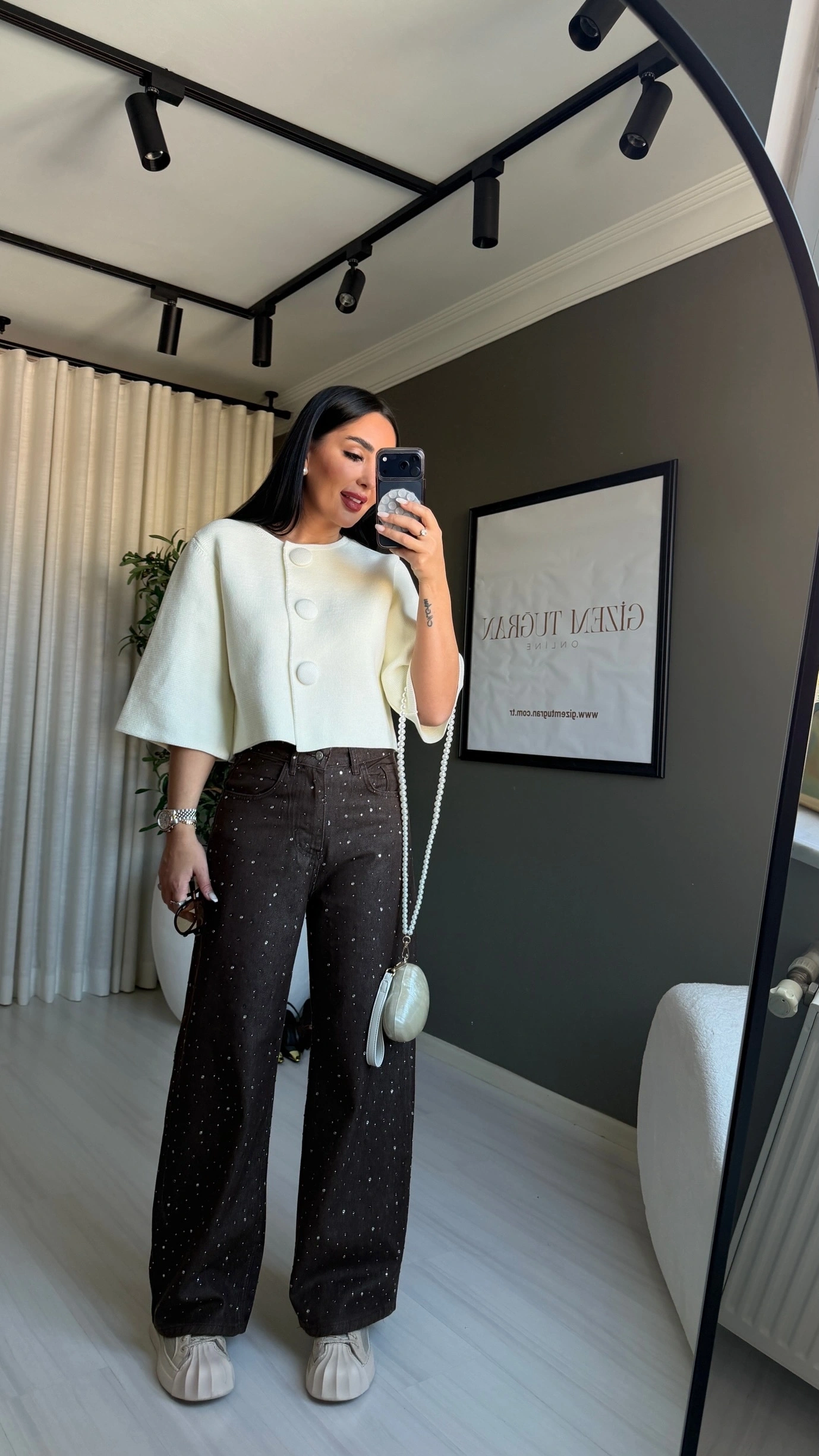 Taşlı Kahverengi Jean, modern tasarımı ve göz alıcı detaylarıyla günlük stilinize şıklık katan özel bir parçadır. Rahat kesimi ve dikkat çekici tasarımı sayesinde hem günlük kombinlerde hem de şık kombinlerde rahatlıkla tercih edilebilecek trend bir jean modelidir.