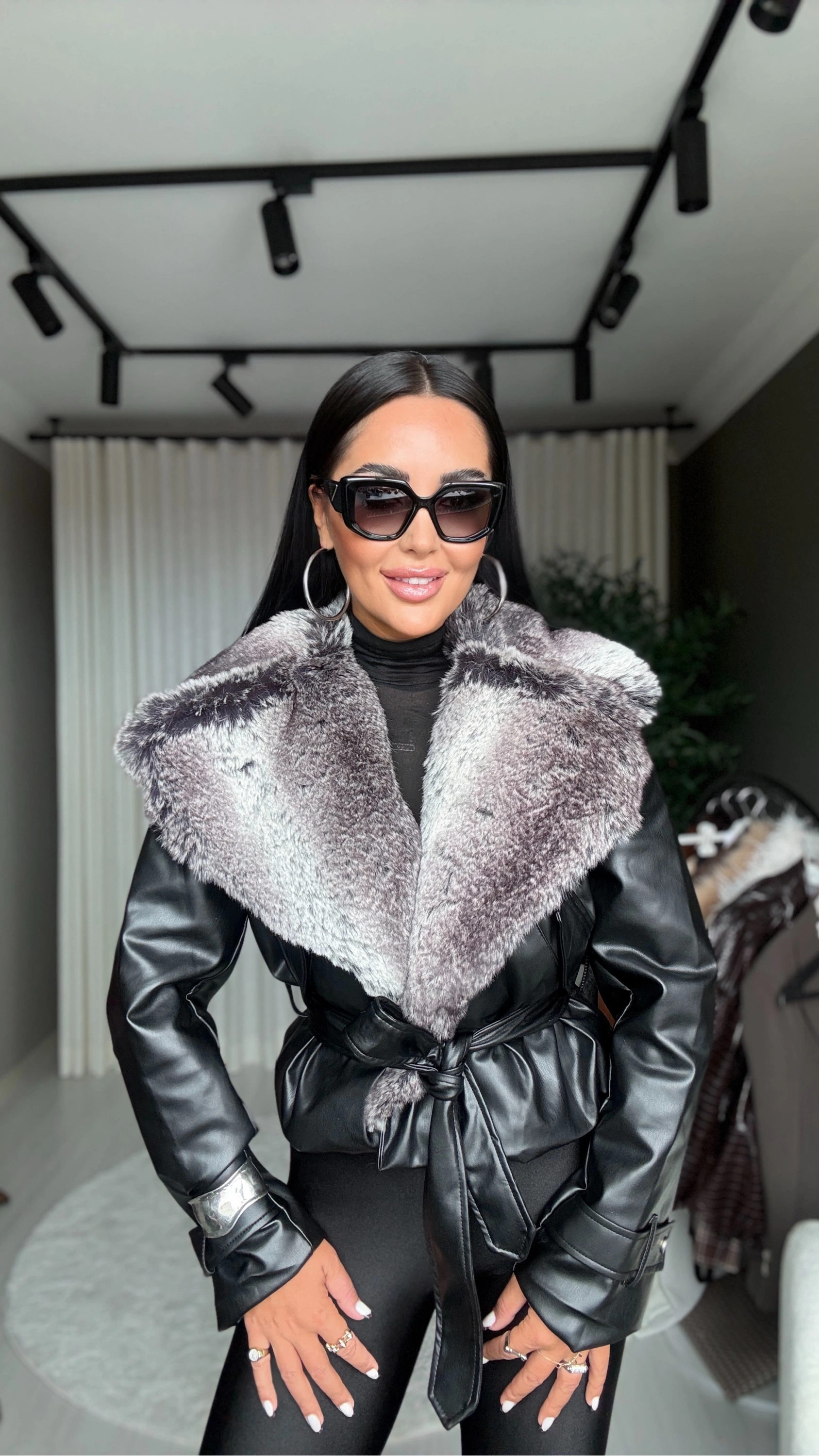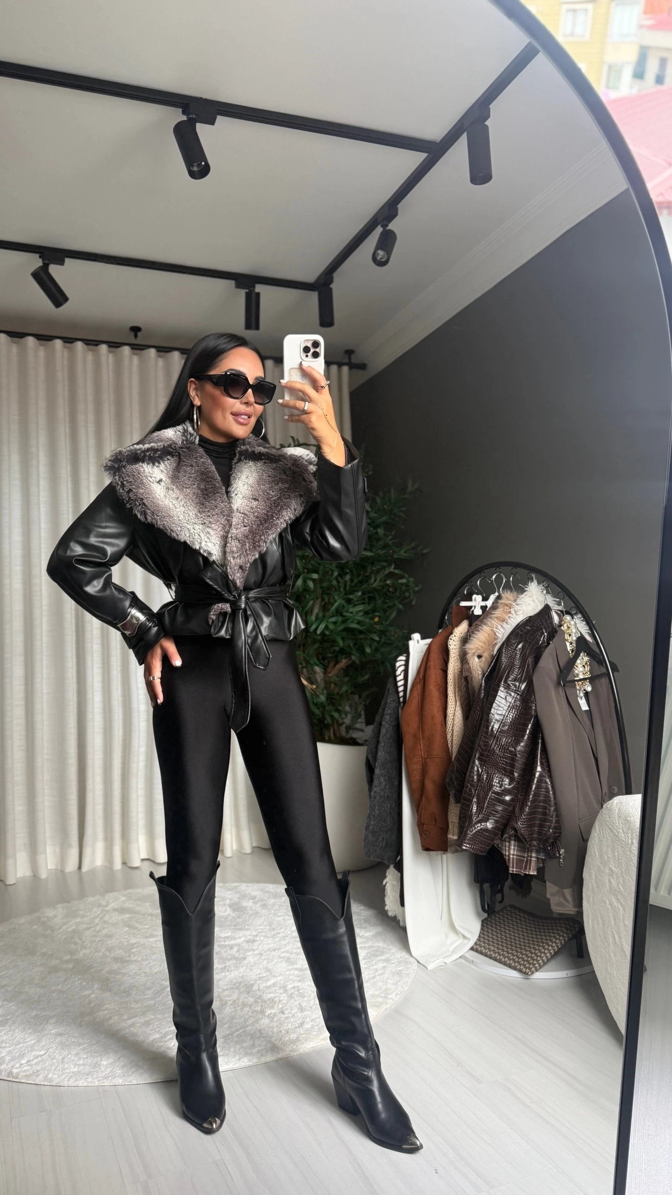 Yakası Kürklü Bağlamalı Siyah Deri Ceket