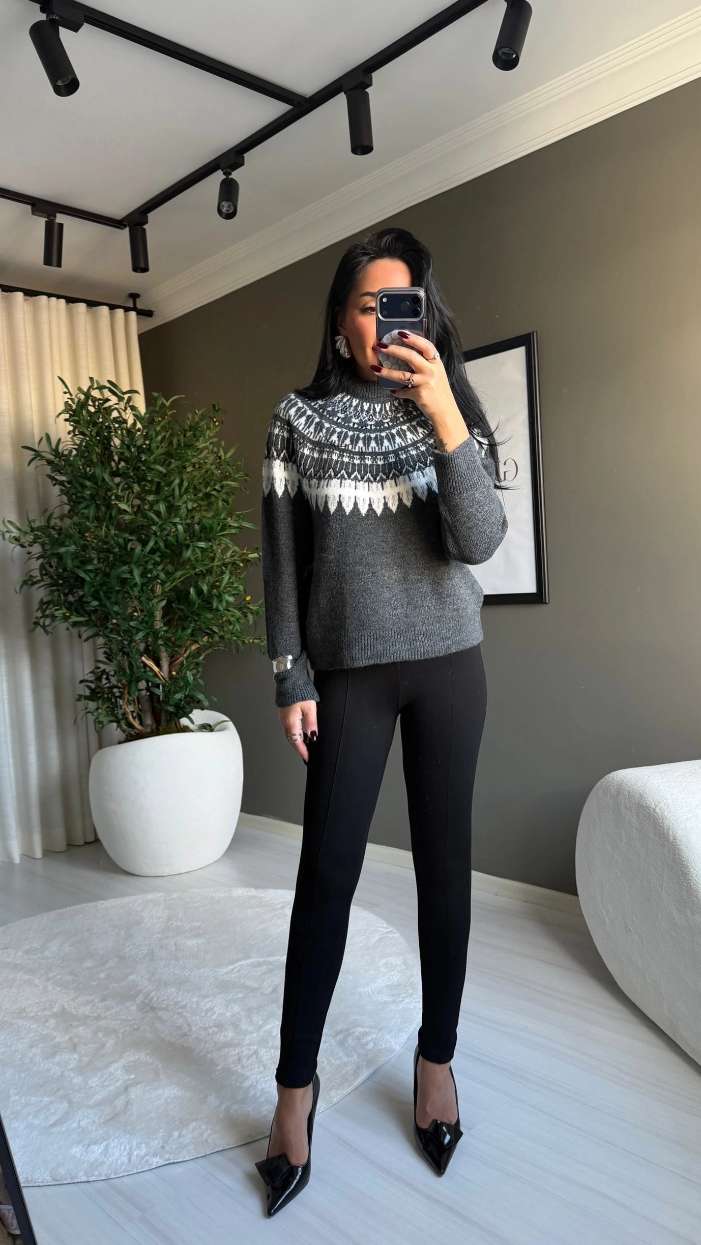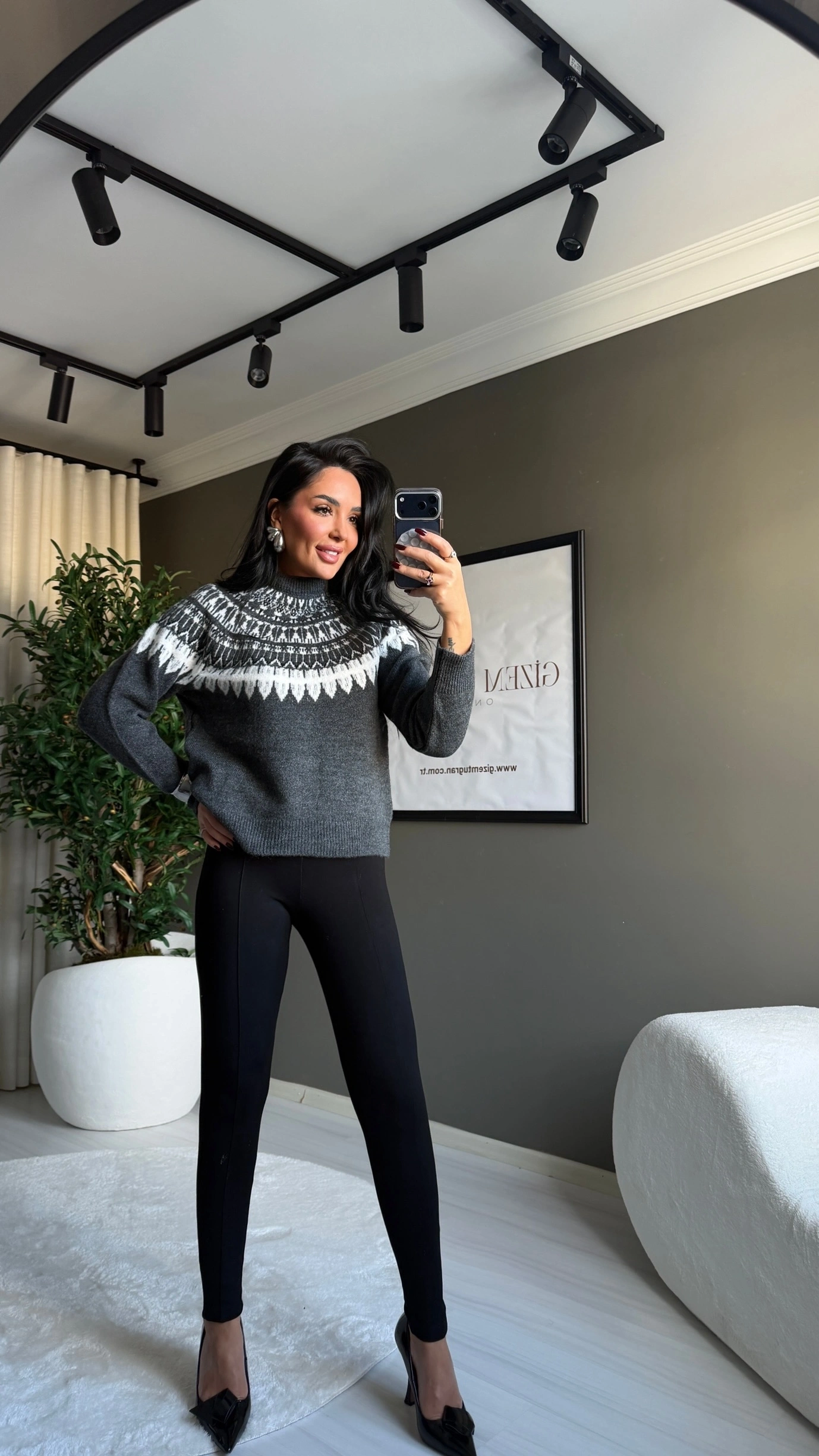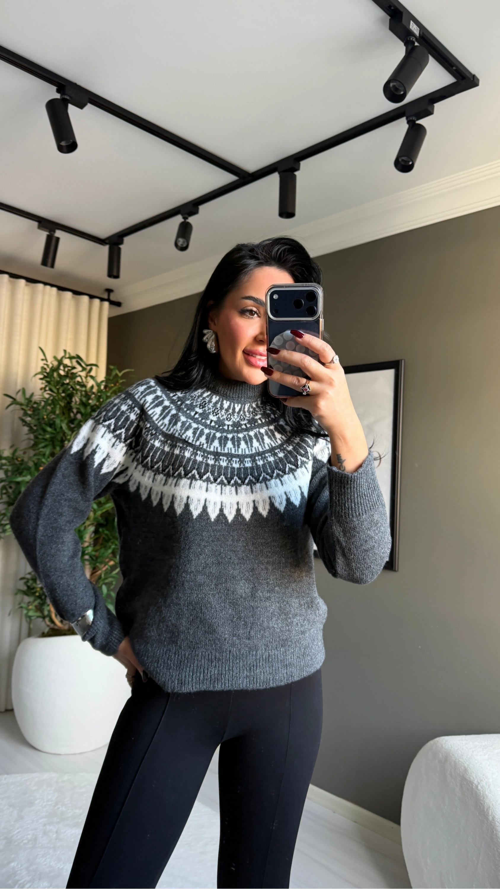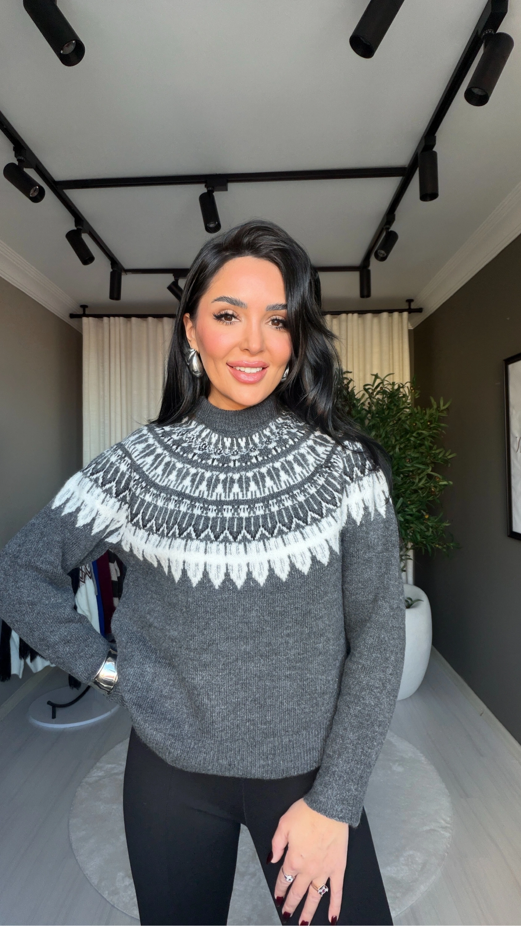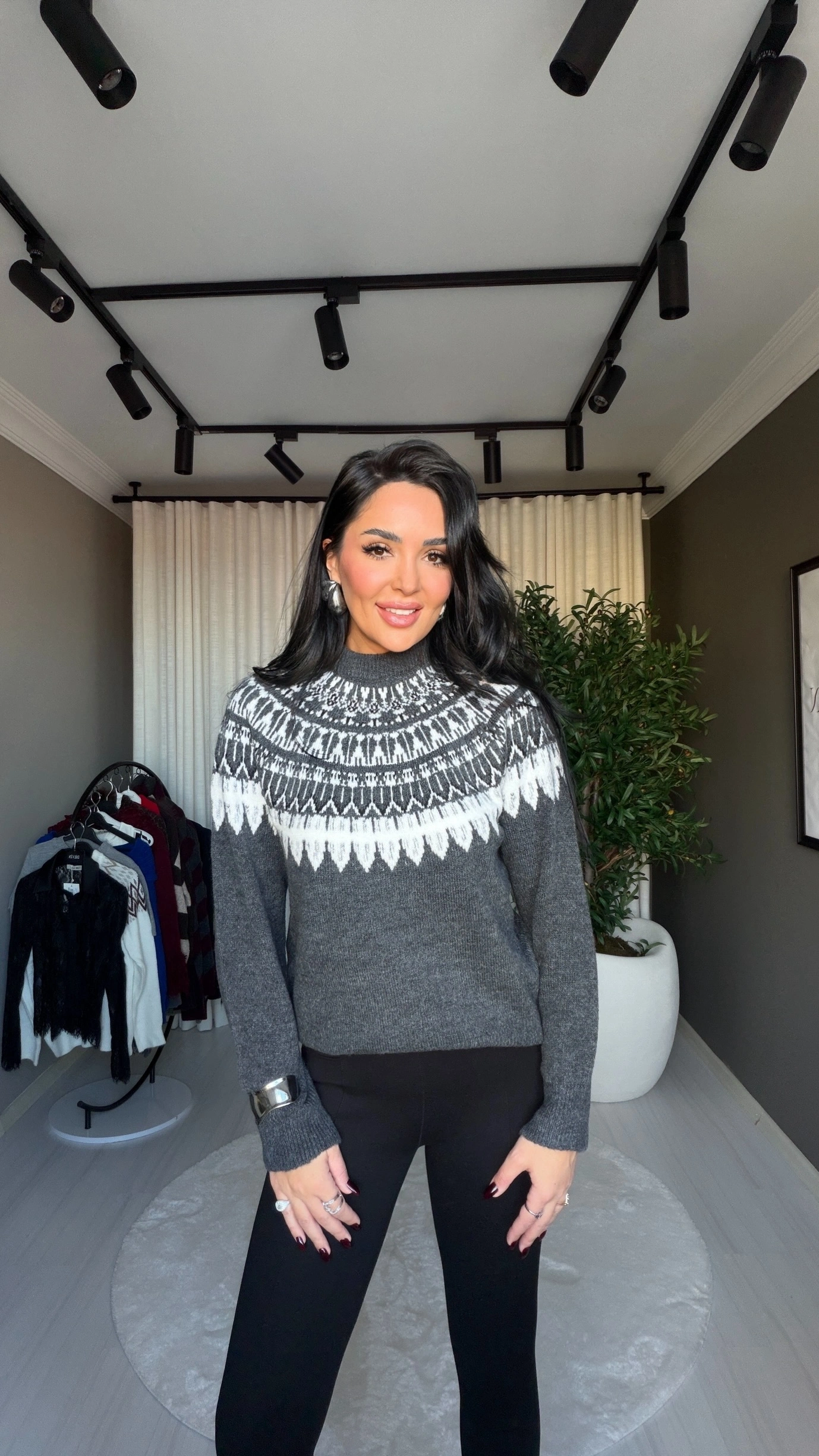 Şıklık ve sıcaklığı bir arada sunan bu yakası İskandinav desenli gri triko kazak, soğuk havalarda stilinden ödün vermeden konforu ön planda tutanlar için tasarlandı. Modern tasarımı ve zamansız gri rengi ile günlük kombinlerden ofis şıklığına kadar geniş bir kullanım alanı sunar.