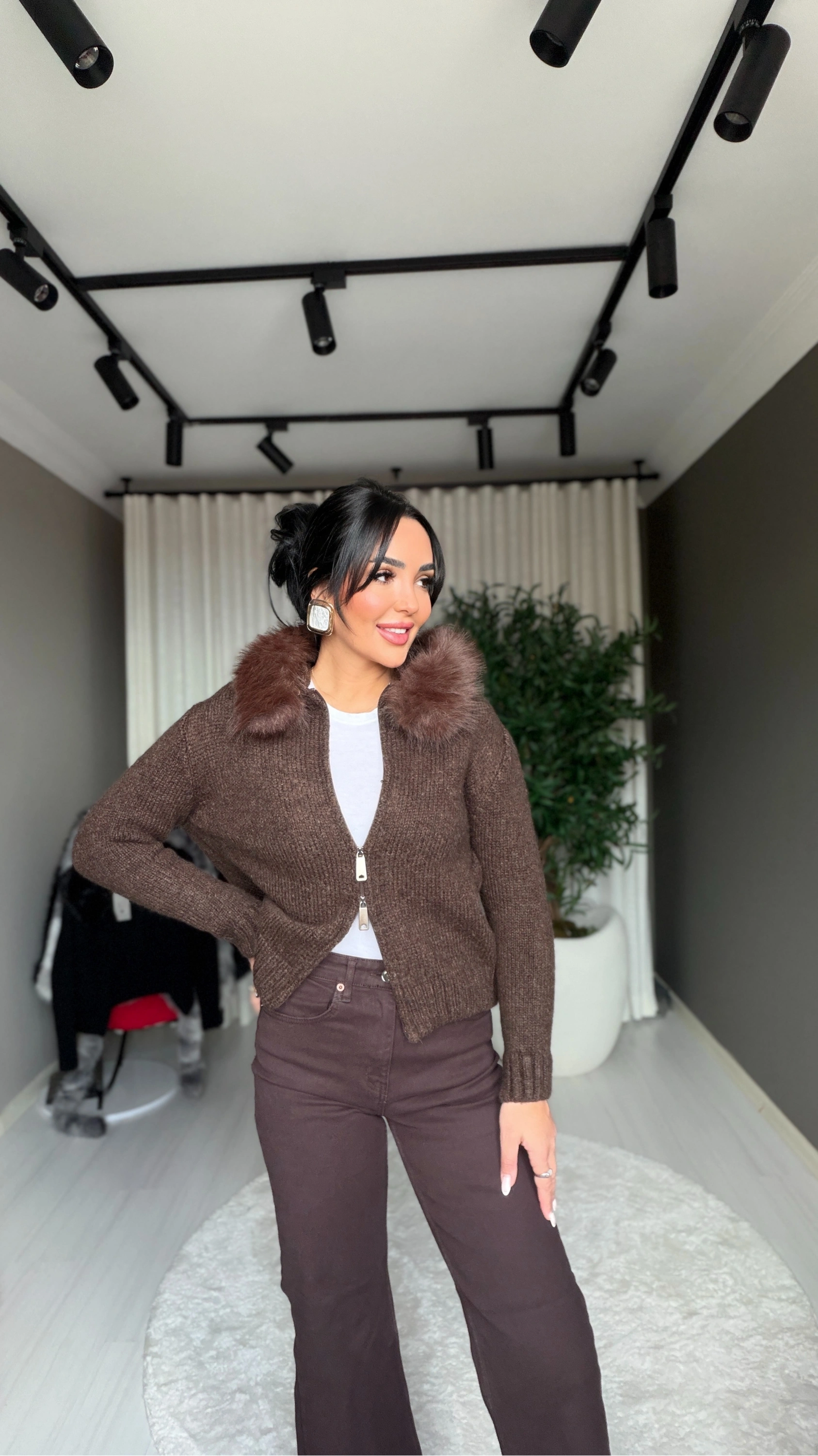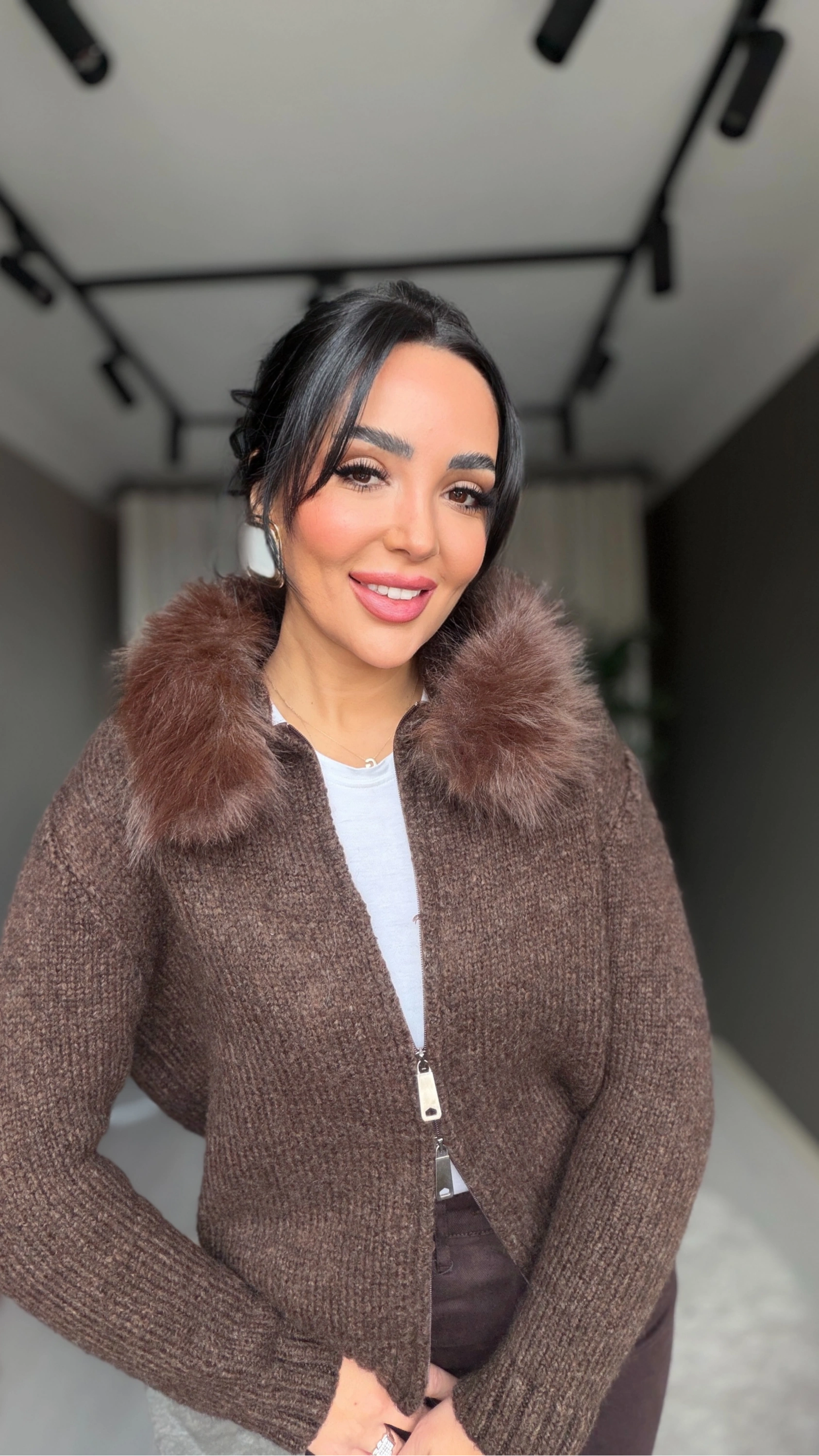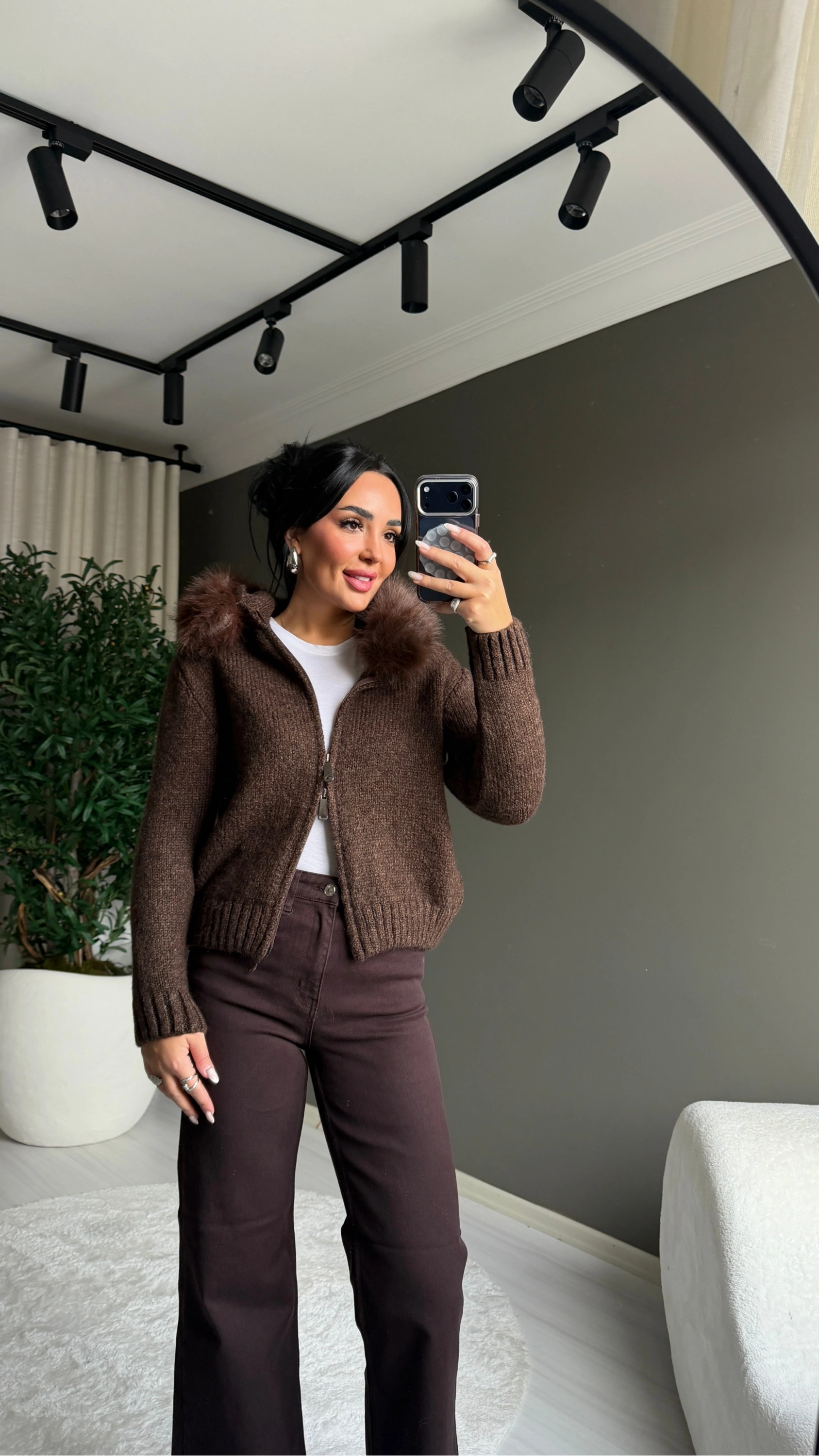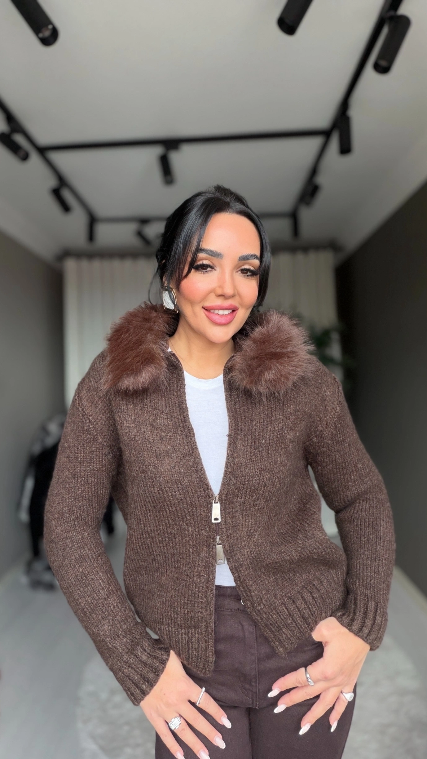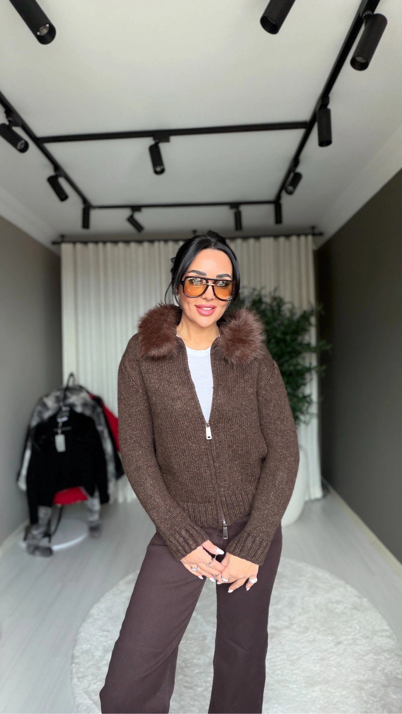 Soğuk günlerde hem şık hem de sıcak kalmak isteyenler için yakası kürklü fermuarlı kahverengi hırka, gardırobunuzun vazgeçilmez parçası olmaya aday!